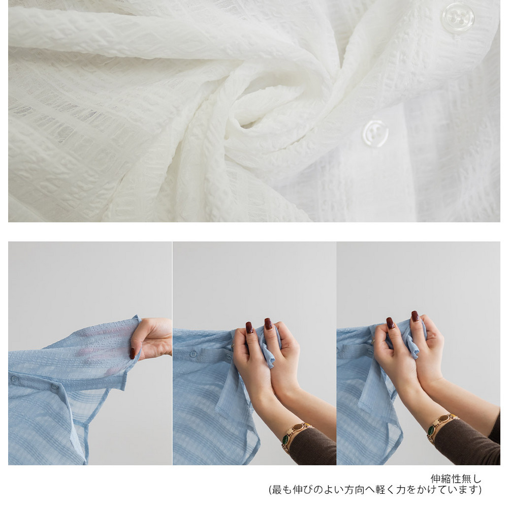 | 素材 | ■素材 ポリエステル100% ■裏地・透け感・伸縮性 裏地無し、透け感有り、伸縮性無し ■ポケット 無し ■生地感 やや表面感、透け感のあるさらっとした素材です。 |