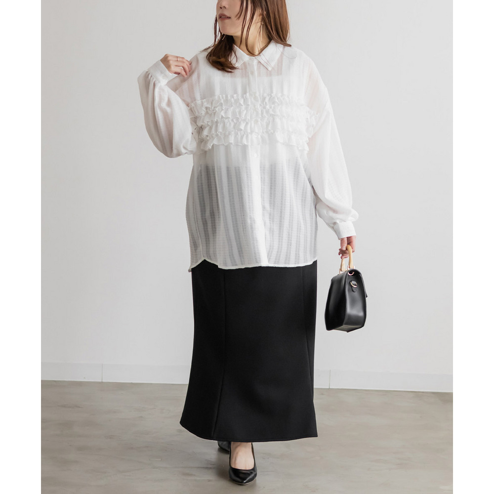 | 3Lを着て程よくゆとりを持って着られて、ちょうどいいサイズ感でした。襟も苦しくないサイズ感なのが嬉しいです◎胸元のフリルがビスチェを重ねたようなデザインで、今っぽくお洒落な雰囲気です。着丈も長めでお尻までカバーしてくれます!生地自体はシアー感があって上品で大人っぽい雰囲気です!すっきりシルエットのスカートやパンツ合わせがお勧めです♪ |