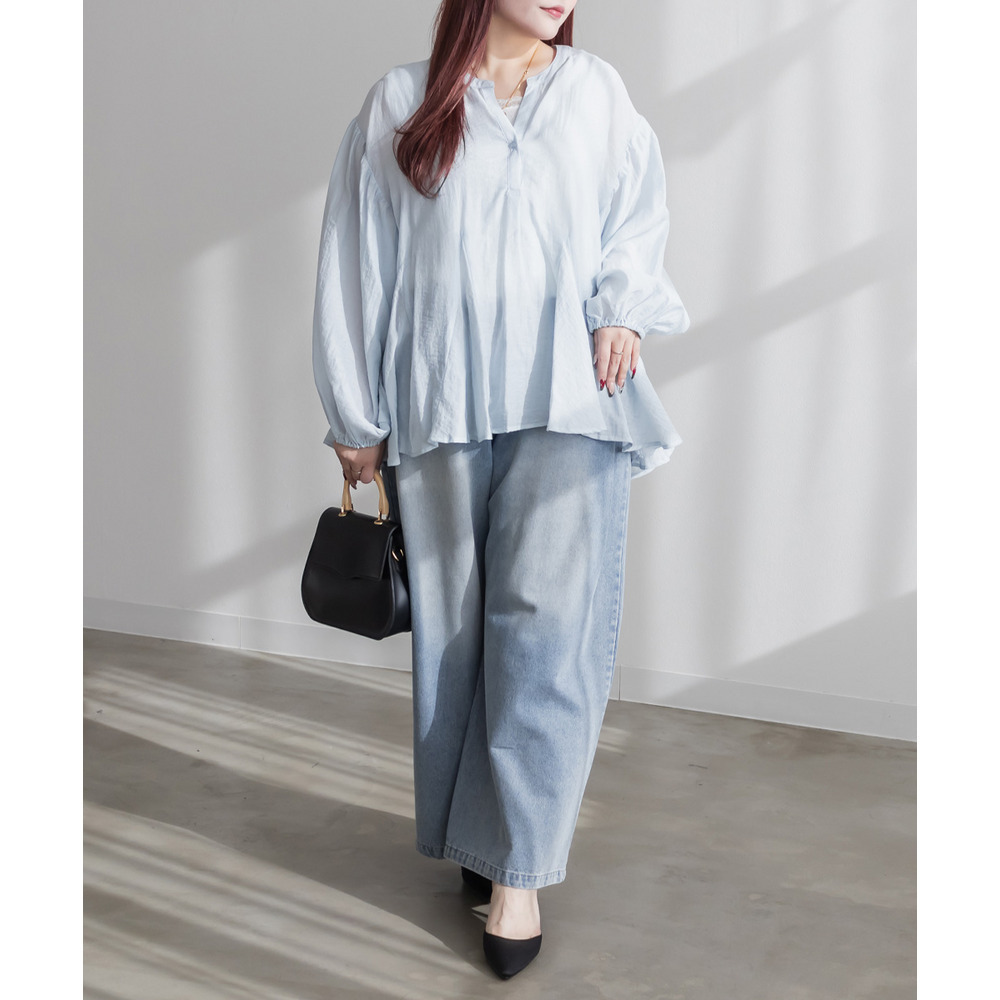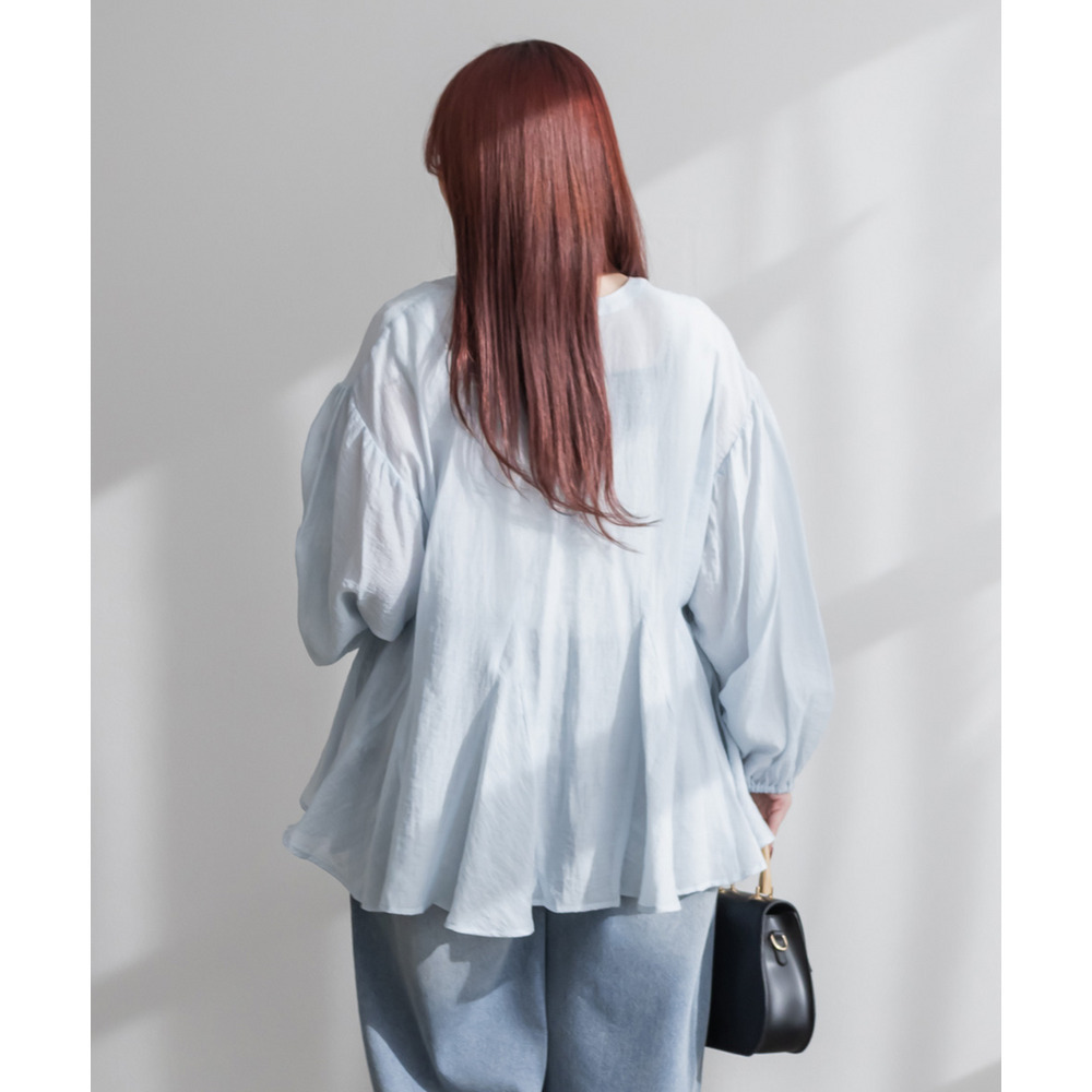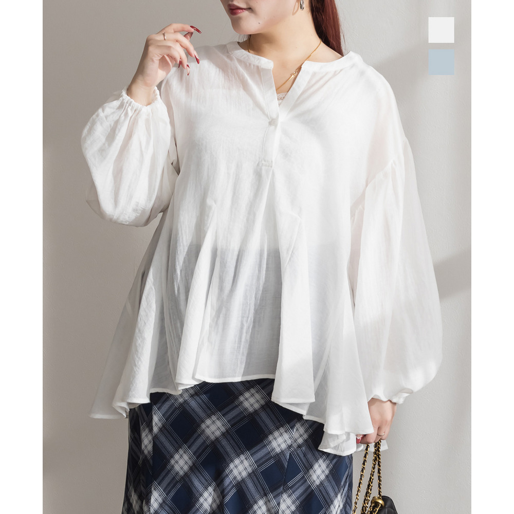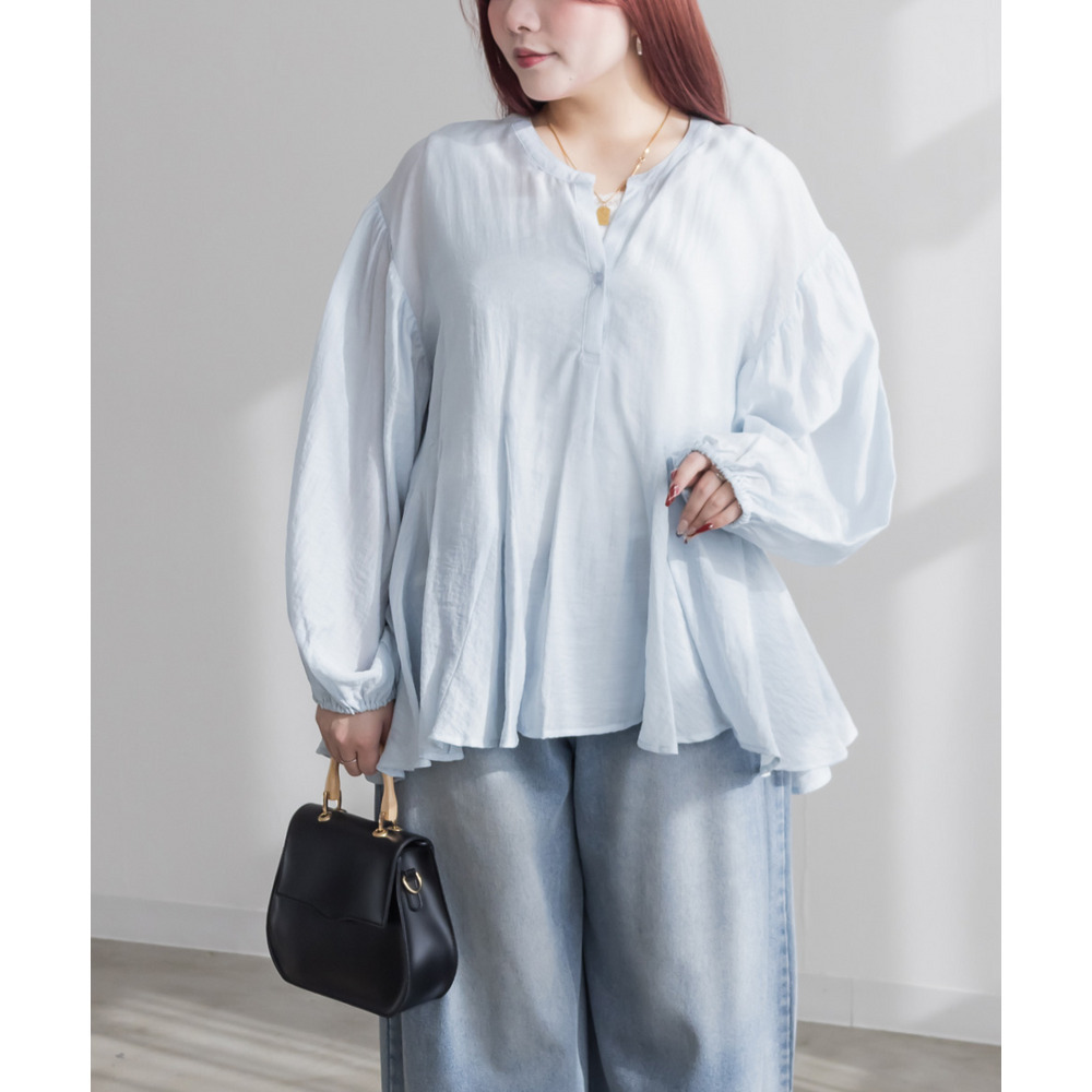 | 3Lサイズを着用してちょうどいいサイズ感でした。普段通りのサイズ選びで問題なさそうです。キーネックで顔回りもすっきりとした印象です。裾がウエストからフレアに広がって腰回りもしっかりカバーされます◎透け感のある素材で春夏にも着用できそうです!寒い時期にはハイネックのインナーを重ねても◎ペンシルスカートなどのすらっとしたボトムとのコーディネートがお勧めです! |