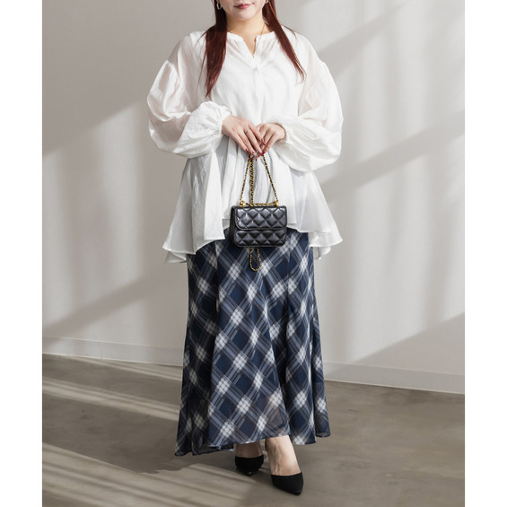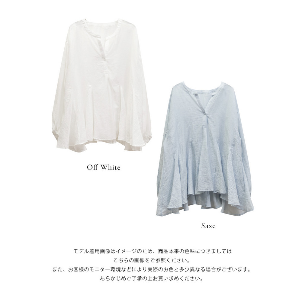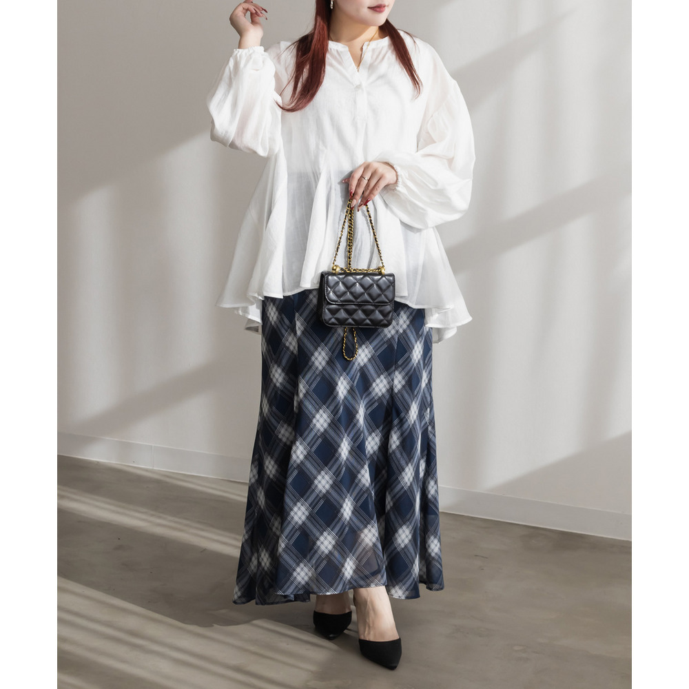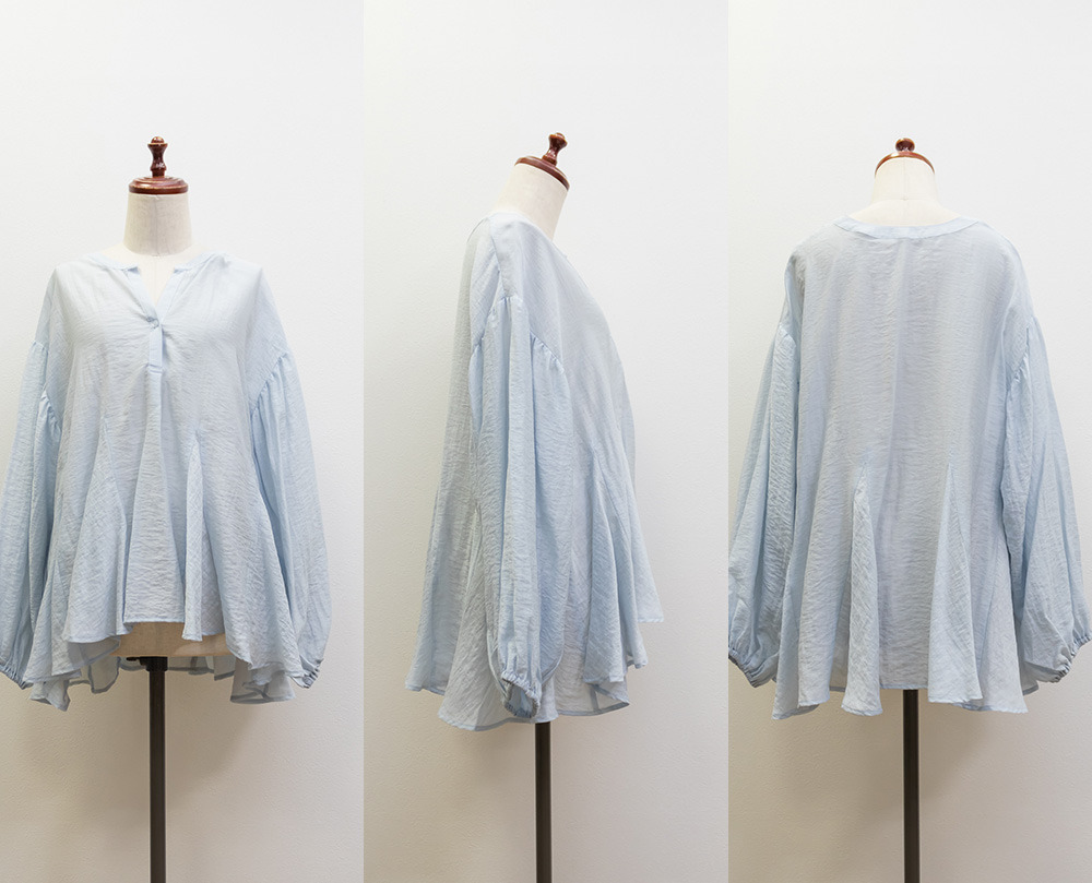| 3Lサイズを着用してちょうどいいサイズ感でした。普段通りのサイズ選びで問題なさそうです。キーネックで顔回りもすっきりとした印象です。裾がウエストからフレアに広がって腰回りもしっかりカバーされます◎透け感のある素材で春夏にも着用できそうです!寒い時期にはハイネックのインナーを重ねても◎ペンシルスカートなどのすらっとしたボトムとのコーディネートがお勧めです! |