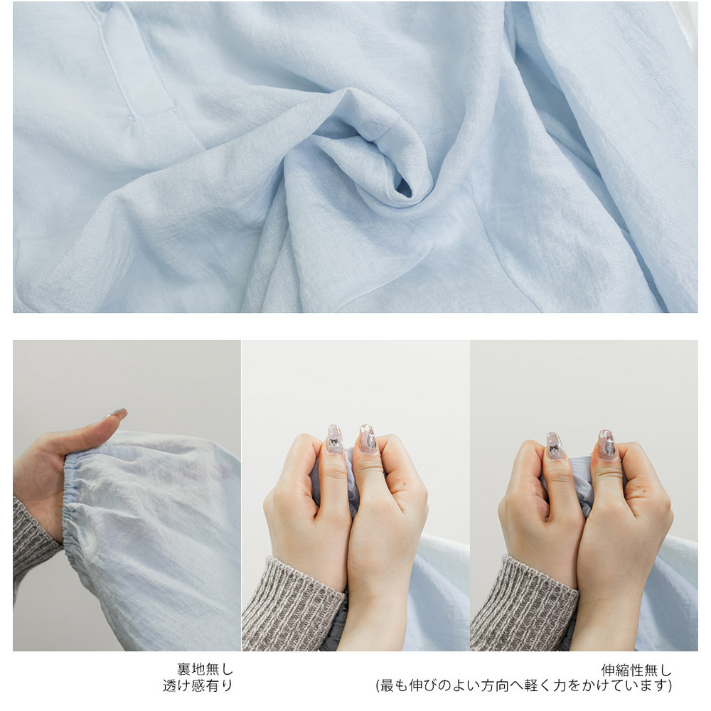 | 素材 | ■素材 レーヨン70%、ナイロン30% ■裏地・透け感・伸縮性 裏地無し、透け感有り、伸縮性無し ■ポケット 無し ■生地感 ややハリ感のあるさらっとした素材です。 |