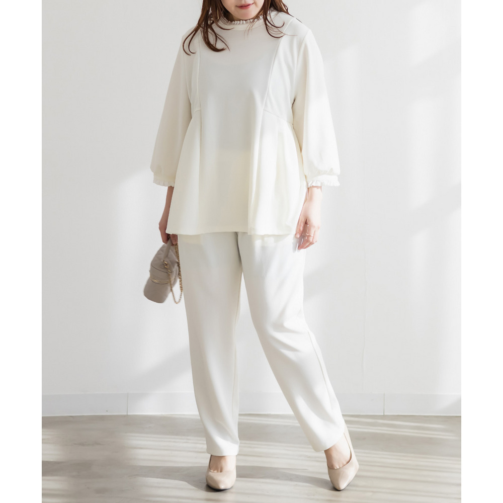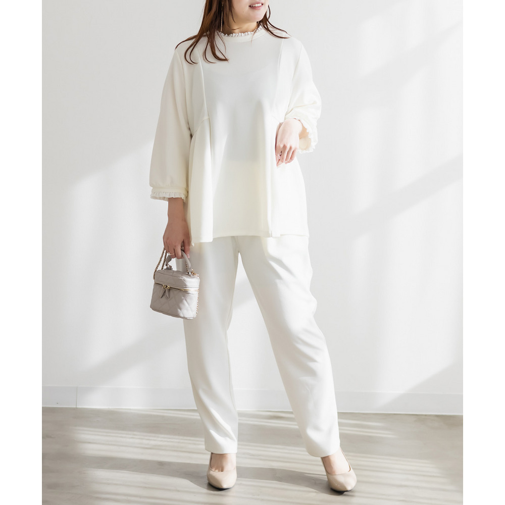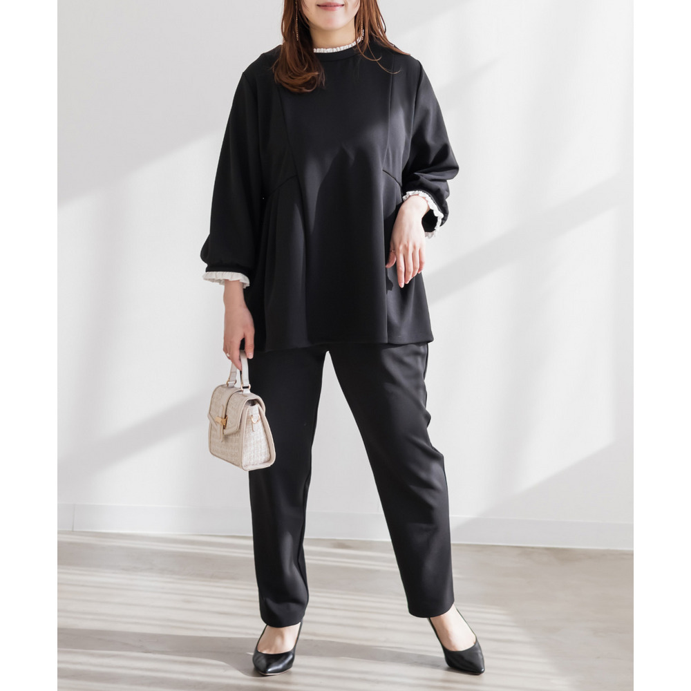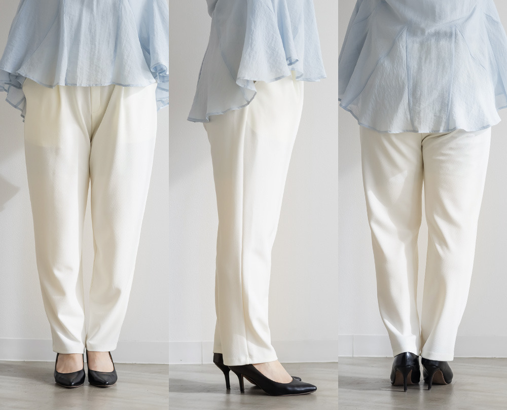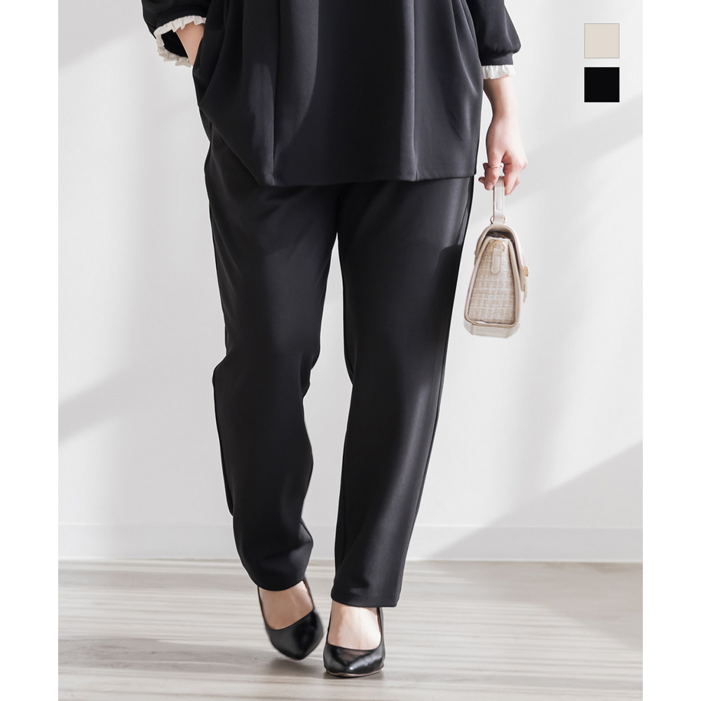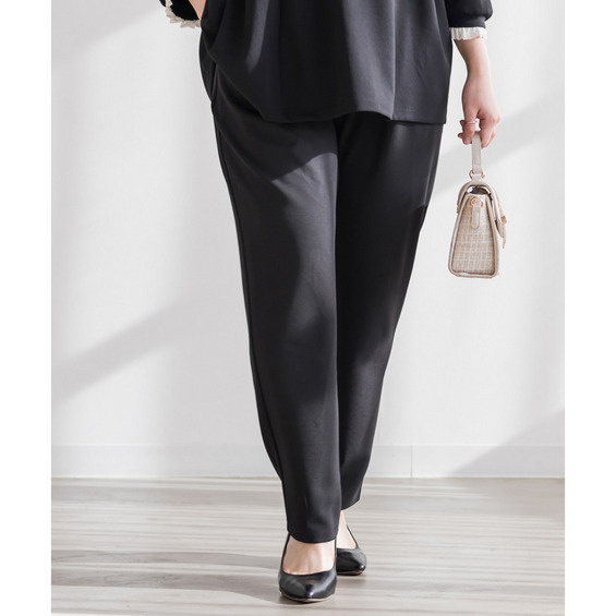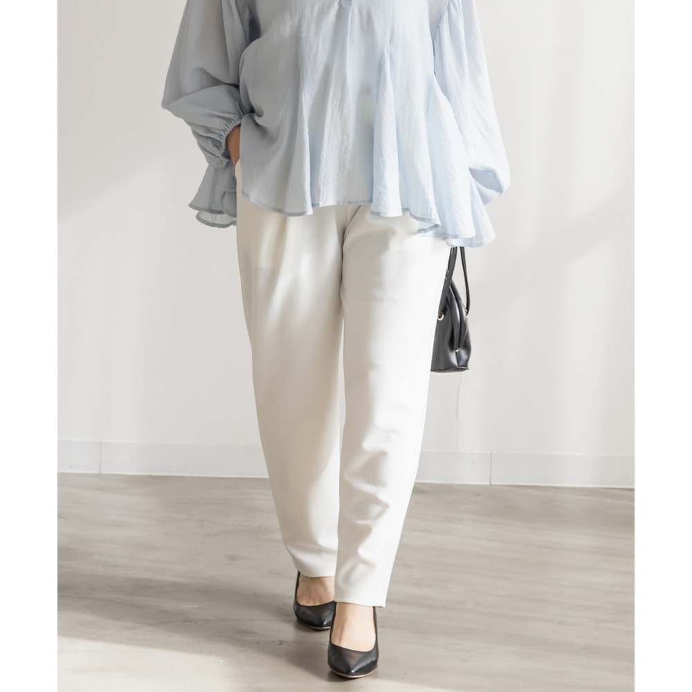 | 3Lサイズを着用しました。普段も3Lサイズを着ていますが、ウエストやヒップまわりはちょうどいい着用感で、タック入りなのでお腹まわりに食い込み感なく楽に穿けました。テーパードシルエットが脚のラインをすっきり見せてくれて、センタープレスの縦ライン効果で自然にスタイルアップできるのが嬉しいです◎同素材のプチハイペプラム長袖ブラウスとセットアップで着ると、きちんと感のあるコーデが完成しますし、単品使いでカジュアルにも着回せる万能パンツ。オンにもオフにも活躍してくれる1本です♪ |