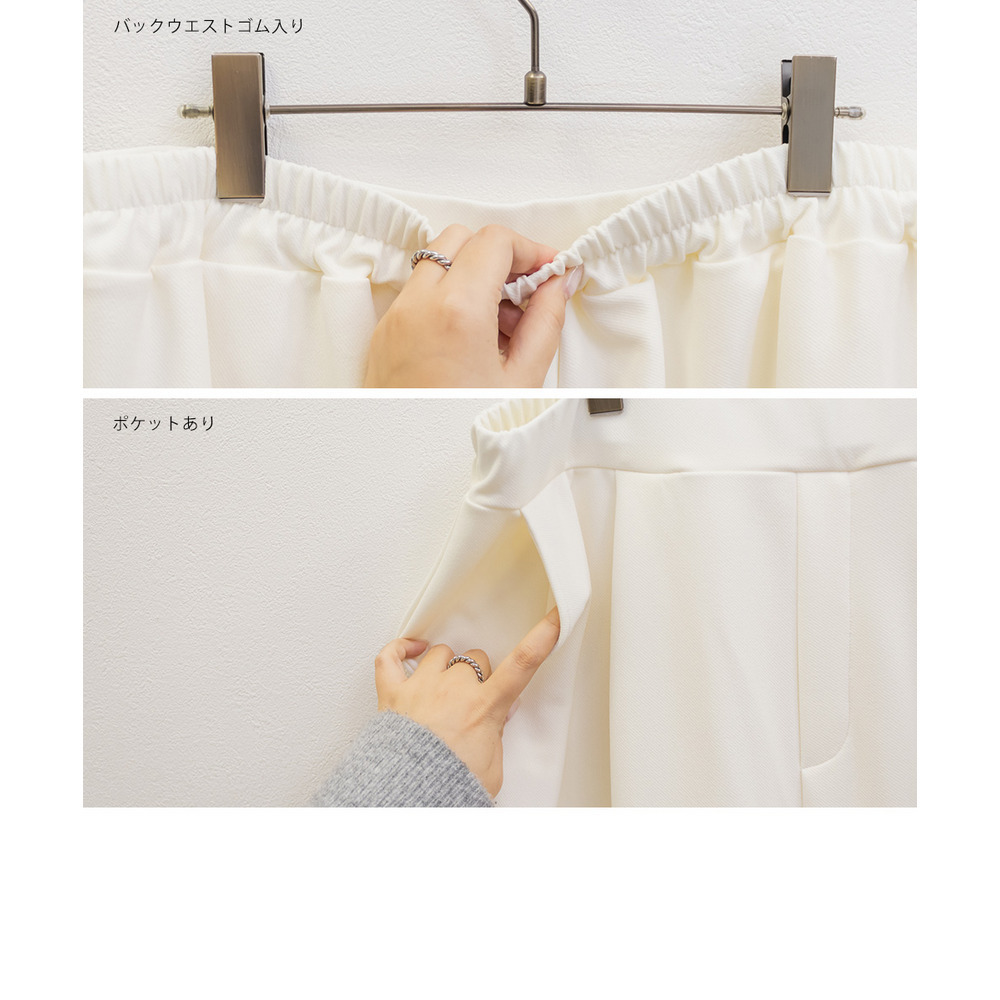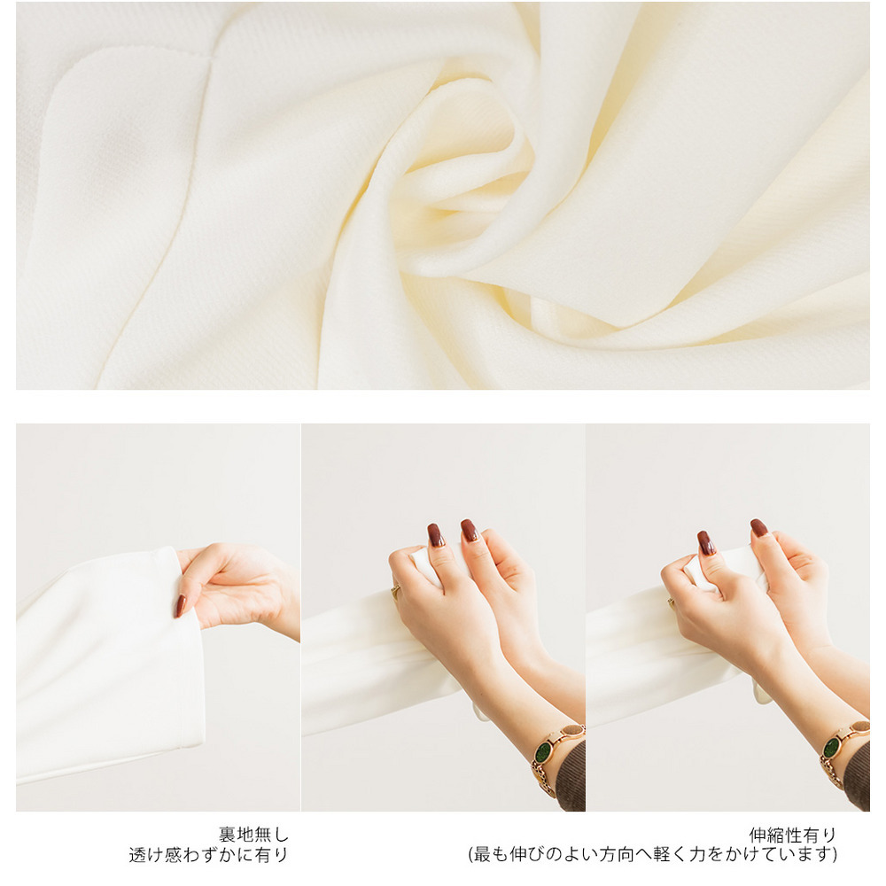 | 素材 | ■素材 ポリエステル95%、ポリウレタン5% ■裏地・透け感・伸縮性 裏地無し、透け感わずかに有り、伸縮性有り ■ポケット 有り ■生地感 やや伸縮性があり程よくしっかりとした素材です。 |