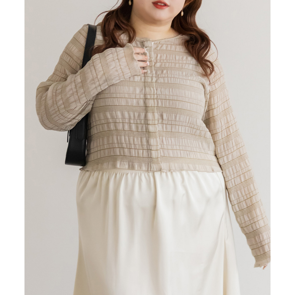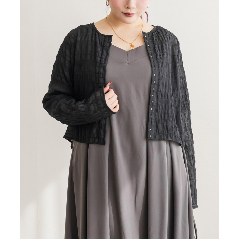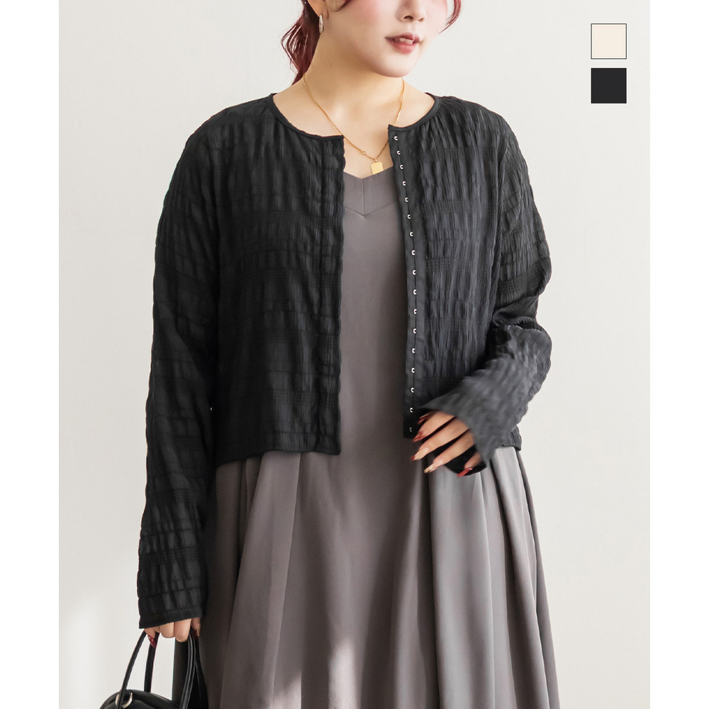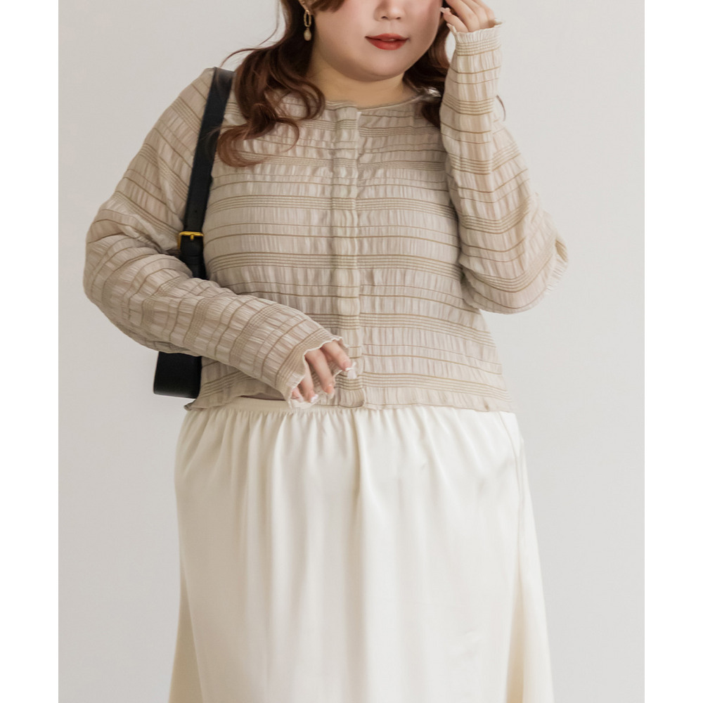 | 3Lサイズを着用してちょうどいいサイズ感でした。トップスですがピタッとしすぎず程よくゆとりを持って着られました。軽ろやかな生地でストレスフリーに着られました!フロントのホックが今っぽいデザインで、縦のラインが強調出来て着やせして見えます!ネックラインも綺麗に開いていて、詰まった印象が無くすっきり見えするのが嬉しいです!生地がポコポコしていて、大人カジュアルにスタイリングできるデザインになっています◎丈感も絶妙でインしなくてもコーデしやすいのもポイントです!冬はインナーを着て重ね着したり、夏は冷房対策のカーデにも使えて、オールシーズン使えるトップスなのであると便利な1枚です! |