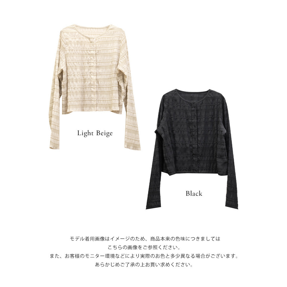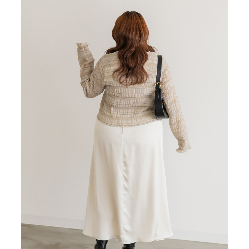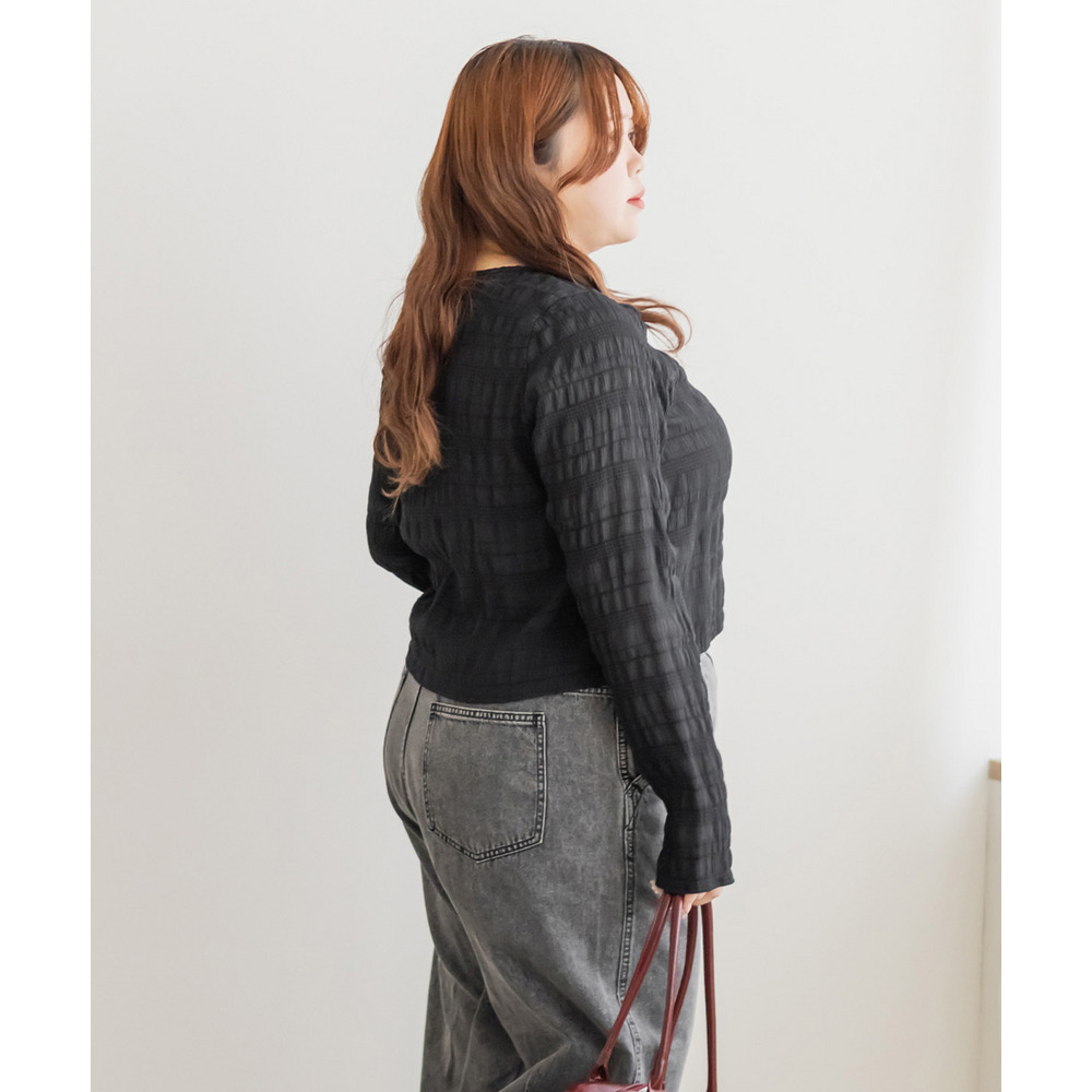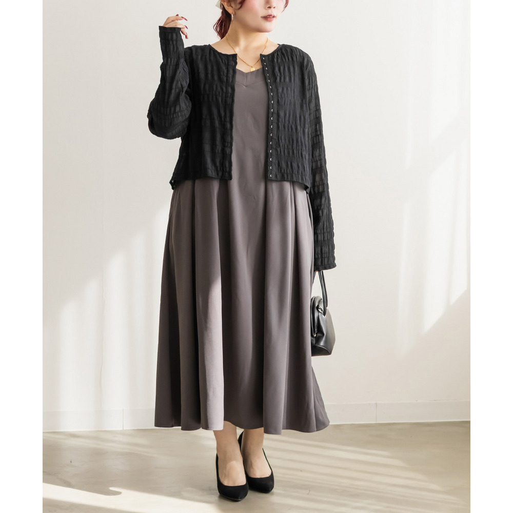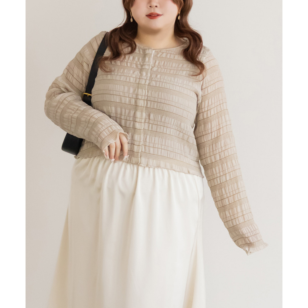 | 3Lサイズを着用してちょうどいいサイズ感でした。トップスですがピタッとしすぎず程よくゆとりを持って着られました。軽ろやかな生地でストレスフリーに着られました!フロントのホックが今っぽいデザインで、縦のラインが強調出来て着やせして見えます!ネックラインも綺麗に開いていて、詰まった印象が無くすっきり見えするのが嬉しいです!生地がポコポコしていて、大人カジュアルにスタイリングできるデザインになっています◎丈感も絶妙でインしなくてもコーデしやすいのもポイントです!冬はインナーを着て重ね着したり、夏は冷房対策のカーデにも使えて、オールシーズン使えるトップスなのであると便利な1枚です! |