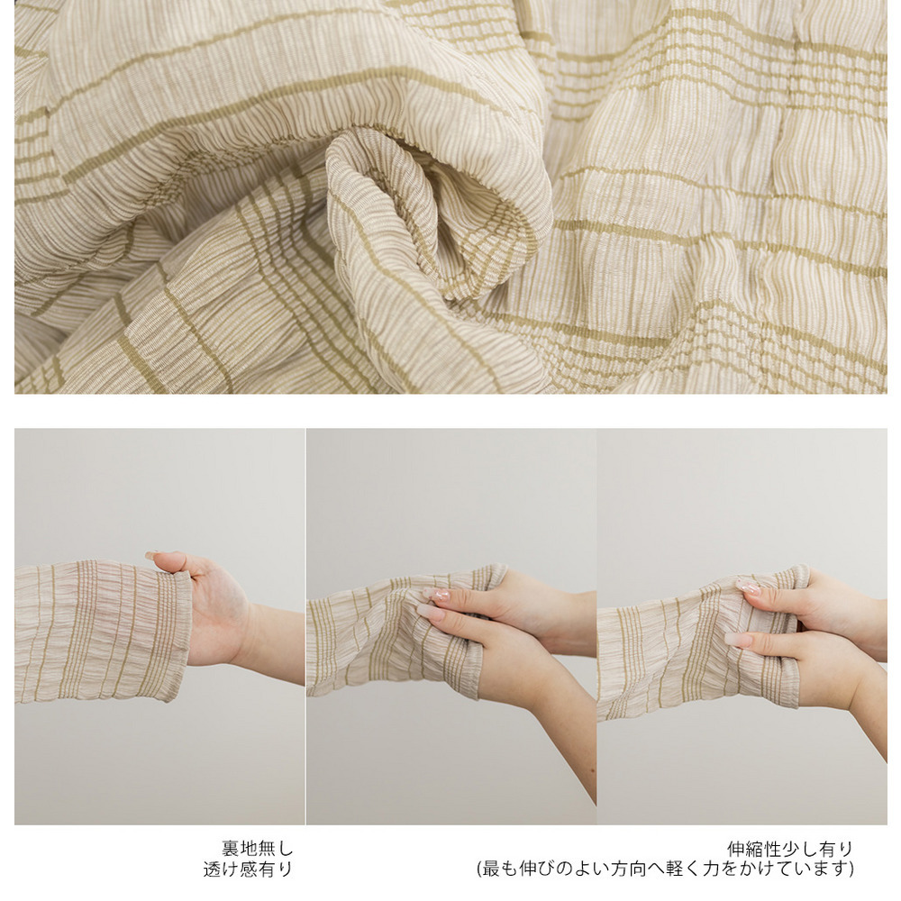 | 素材 | ■素材 ポリエステル45%、ナイロン31%、レーヨン23%、ポリウレタン1% ■裏地・透け感・伸縮性 裏地無し、透け感有り、伸縮性少し有り ■ポケット 無し ■生地感 表面感があり、さらっとした薄手の素材です。 |