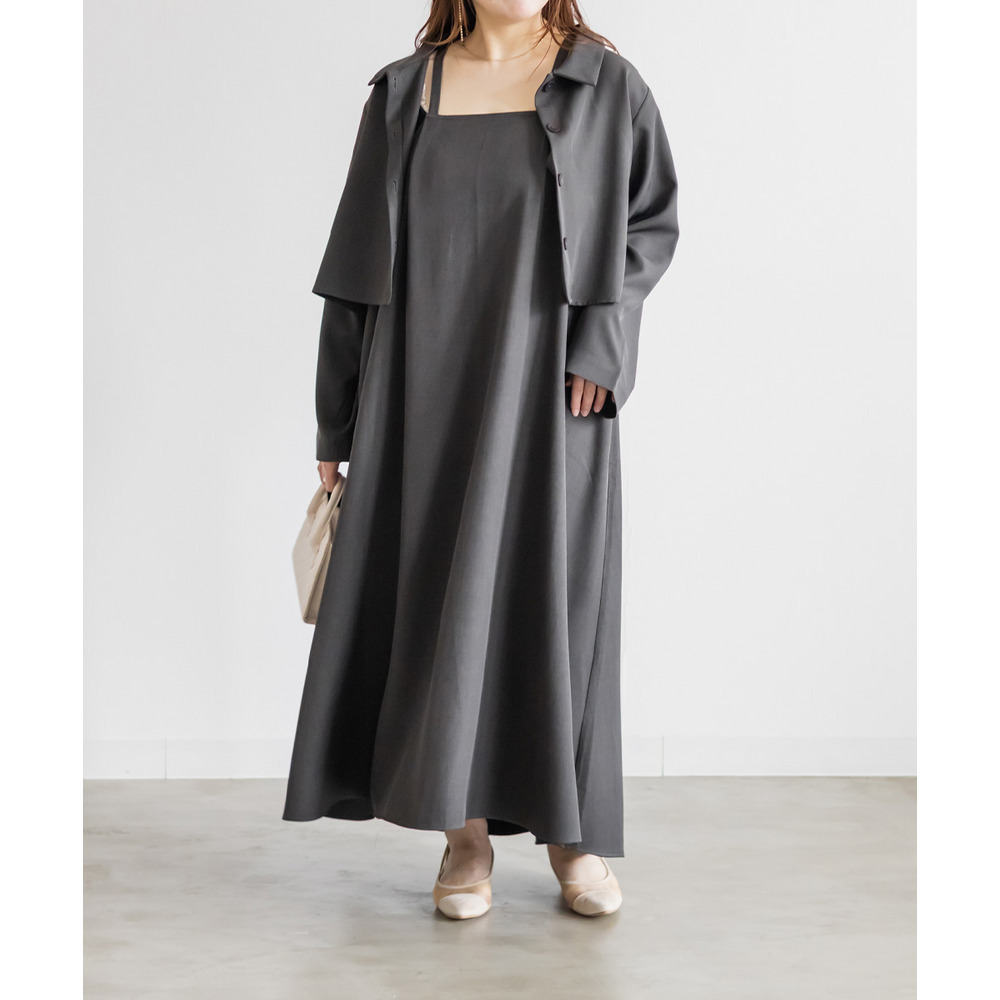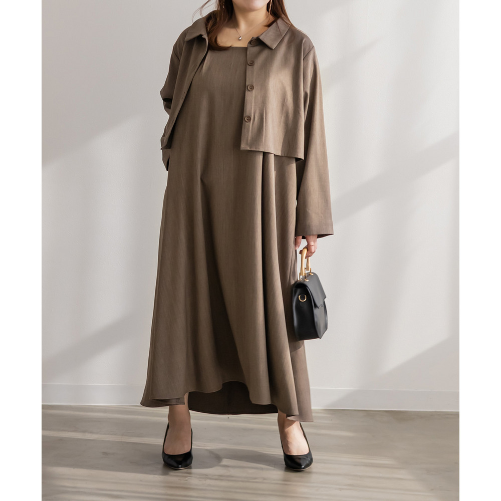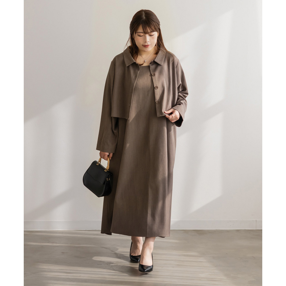 3Lサイズでぴったりでした!フレアに広がるシルエットで、切替が無いのですっきりと着られます◎ワンピースの生地にしっかり幅を持たせてあってボディラインを拾わないのが嬉しいです!生地が上品でお洒落なワンピースで、後ろは紐でサイズ感を調整できます。同じ生地のジャケットとセットアップで着られて洗練されたコーデになります!インナー次第でオールシーズン着回せるアイテムです!