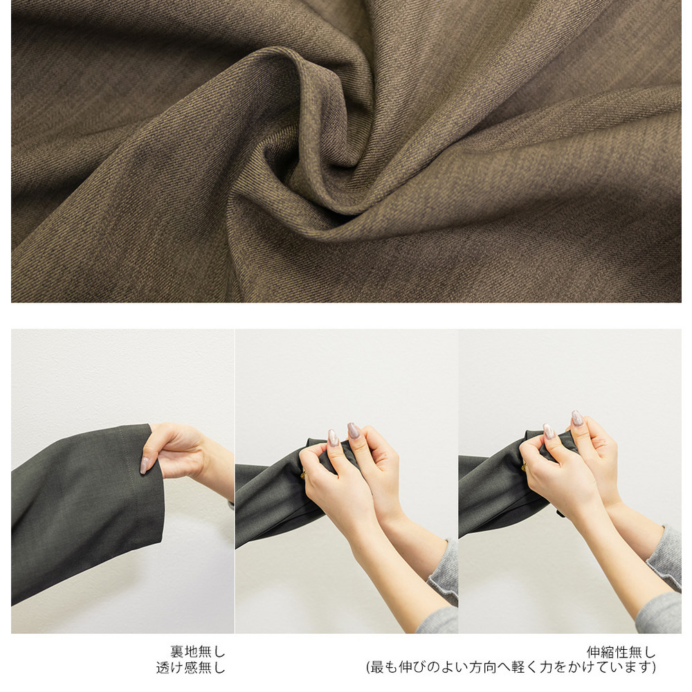 素材 ■素材 ポリエステル95%、ポリウレタン5% ■裏地・透け感・伸縮性 裏地無し、透け感無し、伸縮性無し ■ポケット 有り ■生地感 程よい張りがあり、さらっとした風合いの素材です。