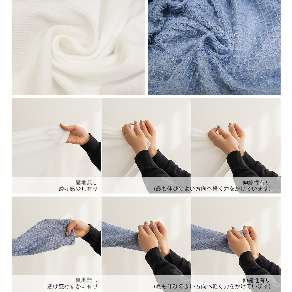 素材 ■素材 【アウター】ポリエステル100%、【インナー】ポリエステル95%、ポリウレタン5% ■裏地・透け感・伸縮性 裏地無し、透け感少し有り、伸縮性有り / 裏地無し、透け感わずかに有り、伸縮性有り ■ポケット 無し ■生地感 カーディガン:起毛感のある軽く柔らかい素材です。 インナー:程よくしっかりとしたリブのカットソー素材です。