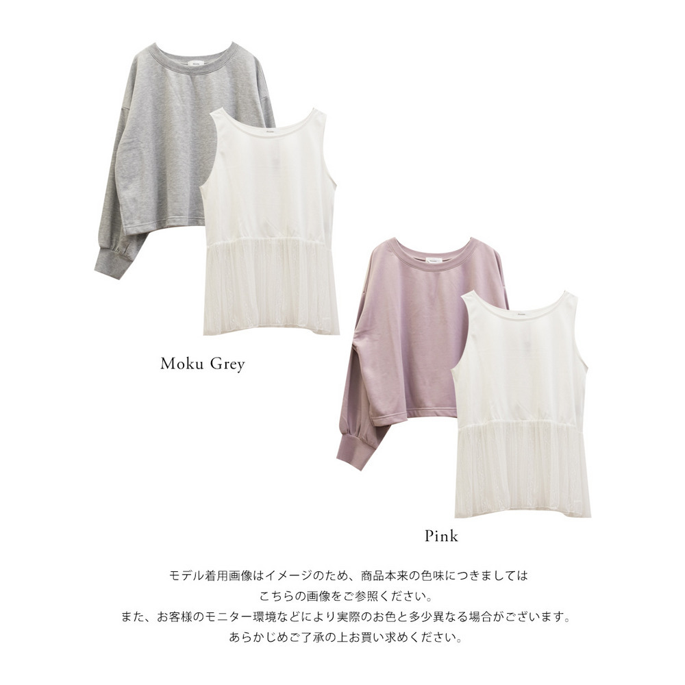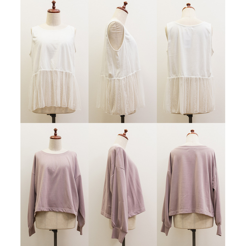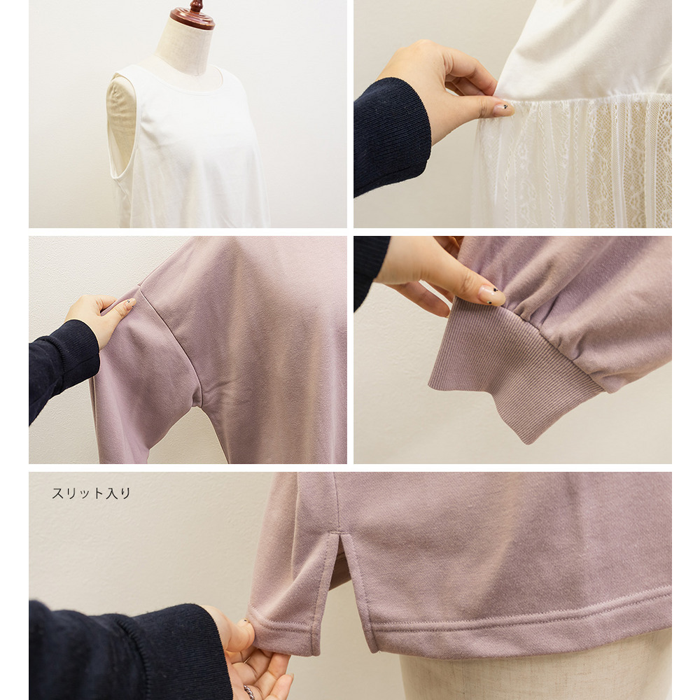 素材 ■素材 【アウター】本体 ポリエステル65%、綿35%、リブ部分 ポリエステル65%、綿35%、ポリウレタン5%、【インナー】本体 ポリエステル65%、綿35%、レース部分 ナイロン90%、ポリウレタン10% ■裏地・透け感・伸縮性 アウター:裏地無し、透け感無し、伸縮性有り / インナー:裏地無し、透け感少し有り、伸縮性有り ■ポケット 無し ■生地感 トレーナー:程よく厚みがありなめらかな素材です。 タンクトップ:薄手のカットソー素材です。