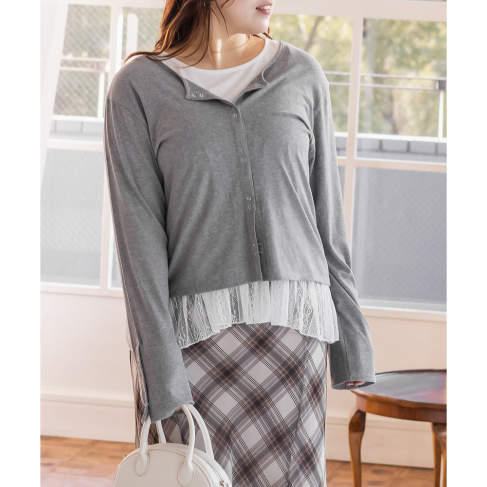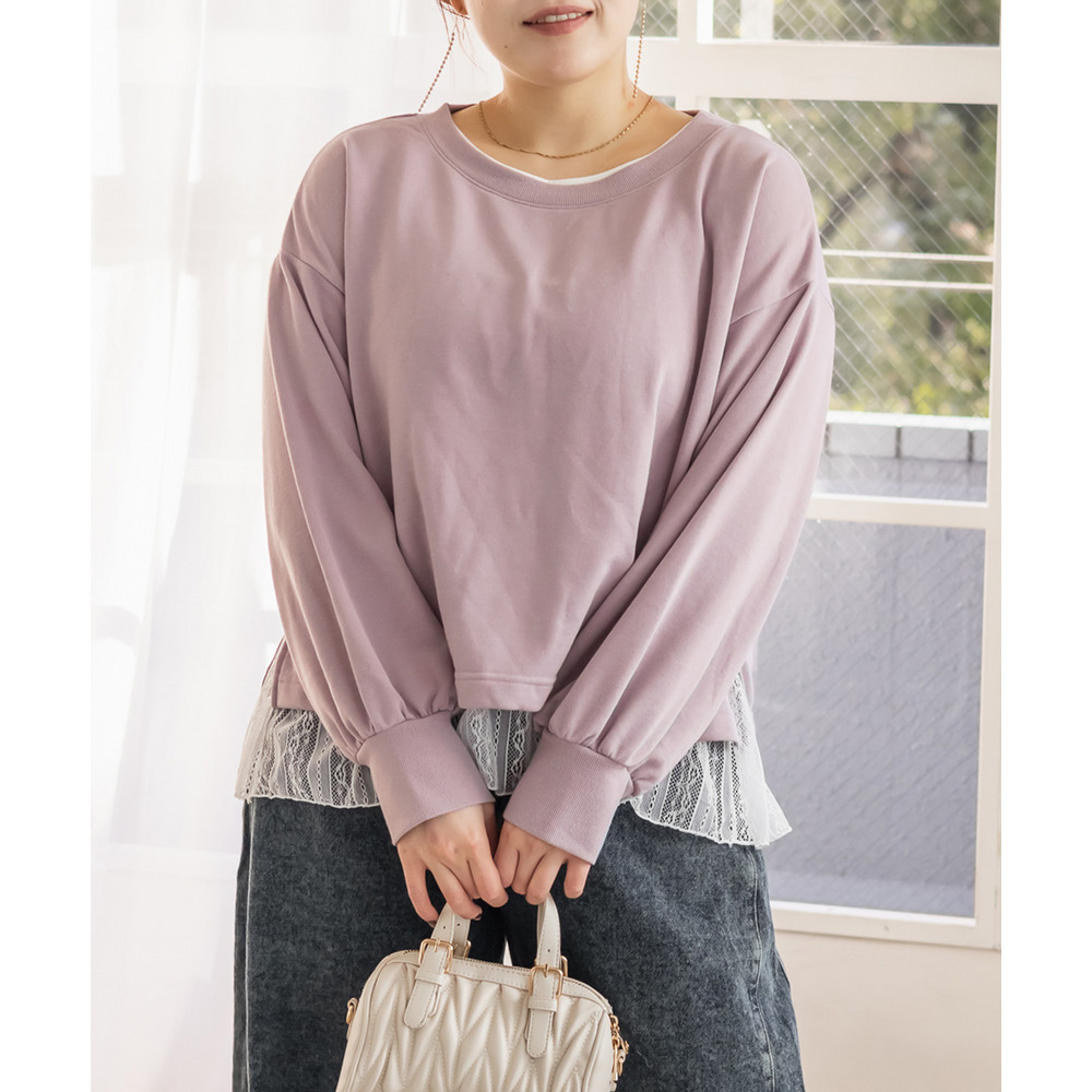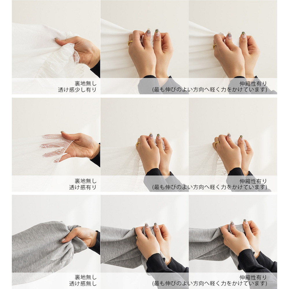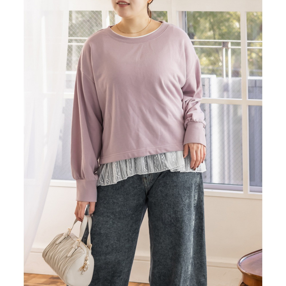素材 ■素材 【アウター】本体 ポリエステル65%、綿35%、リブ部分 ポリエステル65%、綿35%、ポリウレタン5%、【インナー】本体 ポリエステル65%、綿35%、レース部分 ナイロン90%、ポリウレタン10% ■裏地・透け感・伸縮性 アウター:裏地無し、透け感無し、伸縮性有り / インナー:裏地無し、透け感少し有り、伸縮性有り ■ポケット 無し ■生地感 トレーナー:程よく厚みがありなめらかな素材です。 タンクトップ:薄手のカットソー素材です。