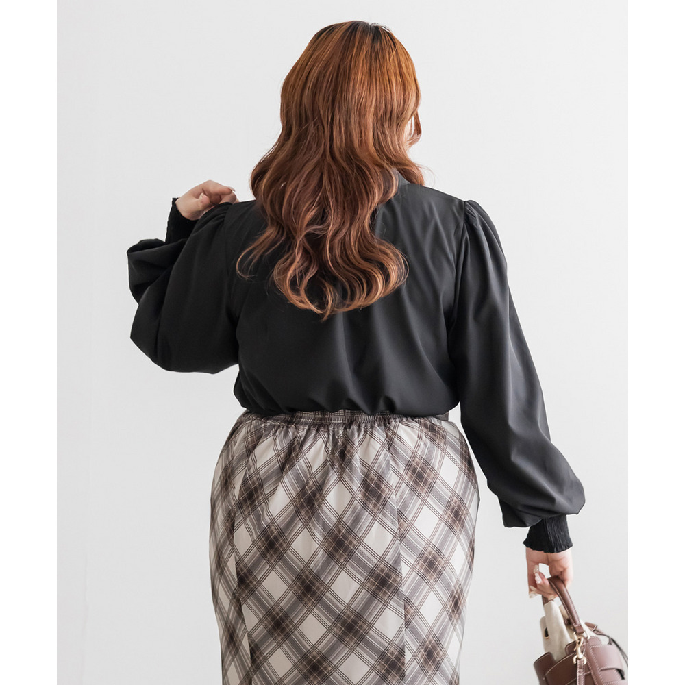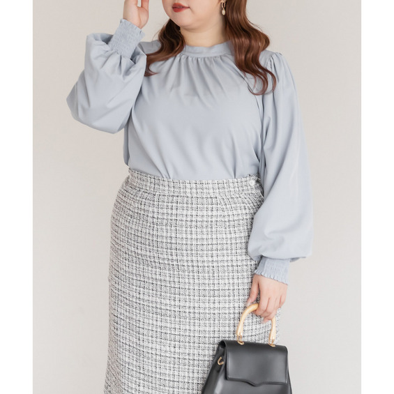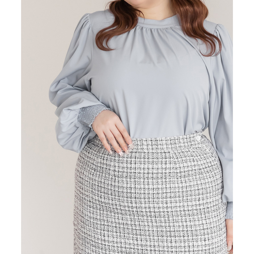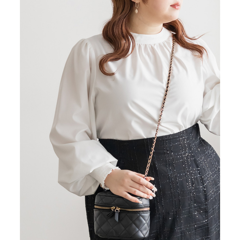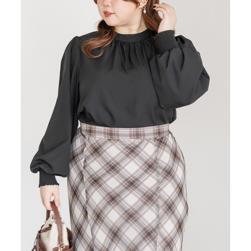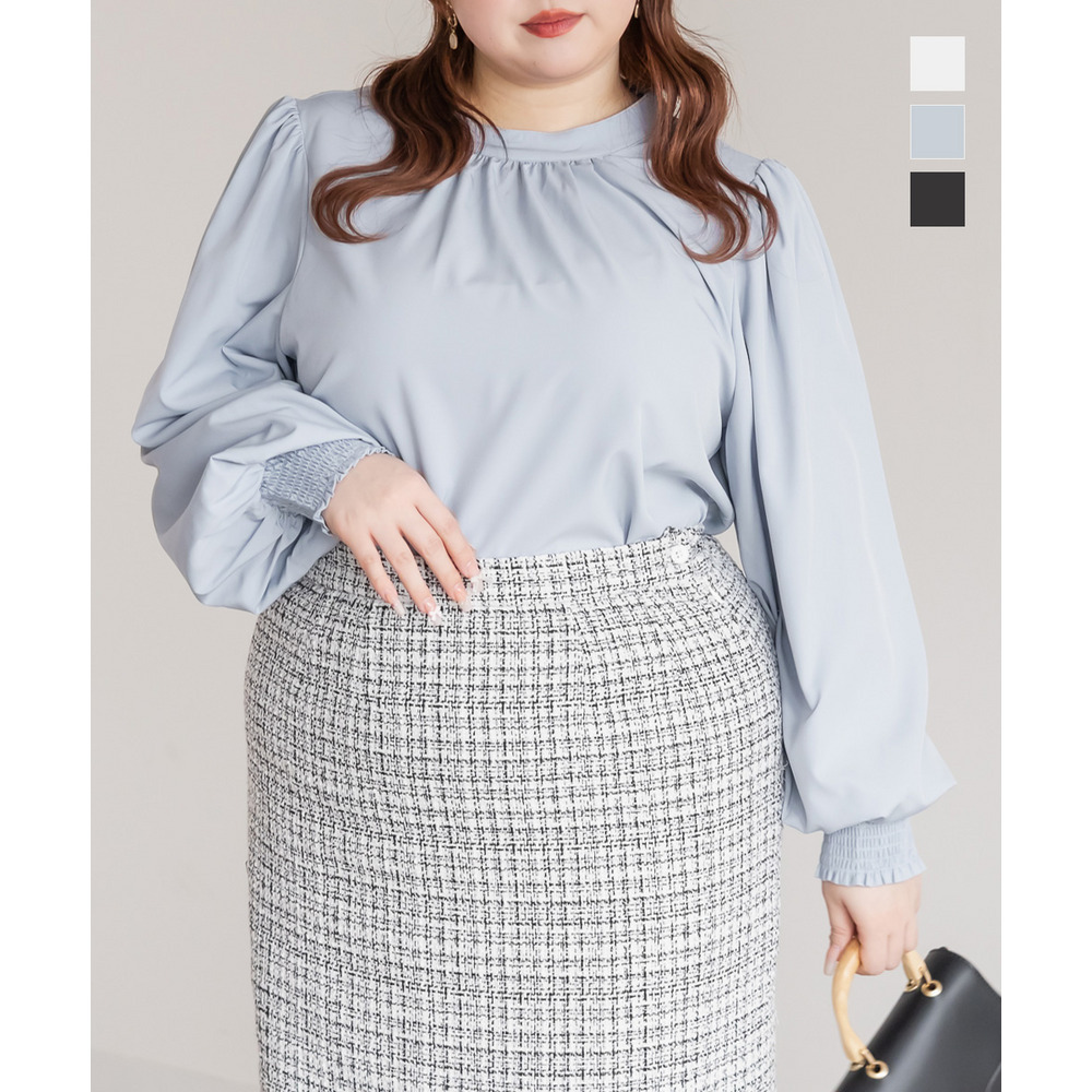 3Lサイズを着用しました。普段着ているサイズ感と比べてもぴったりで、首まわりや身幅に窮屈感がなく安心して着られました。ハイネックデザインですがギャザーが入っているので締め付け感がなく、顔まわりもふんわりと女性らしい印象に♪ 落ち感のある素材でボディラインを自然にカバーしてくれて、1枚で着映えするのが嬉しいです。スカート合わせでフェミニンにも、パンツ合わせで少し大人っぽく着るのもおすすめ◎ オフィスからお出かけまで幅広く使えるブラウスだと思います。