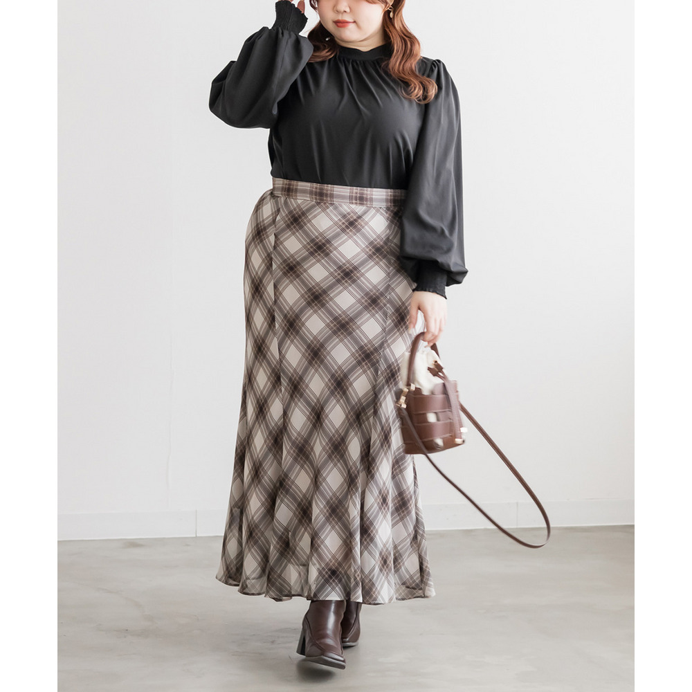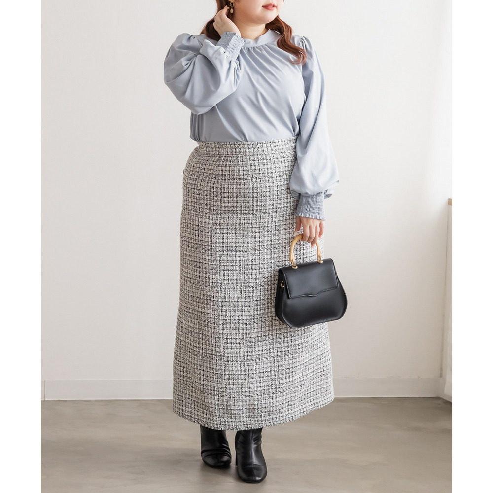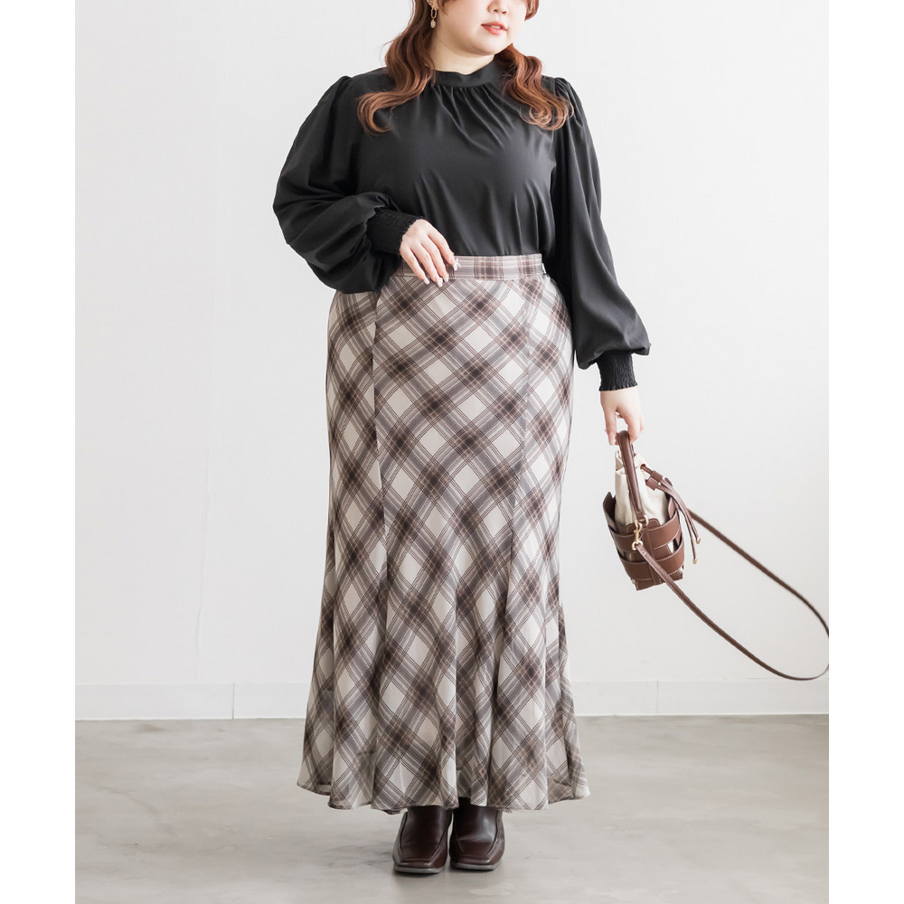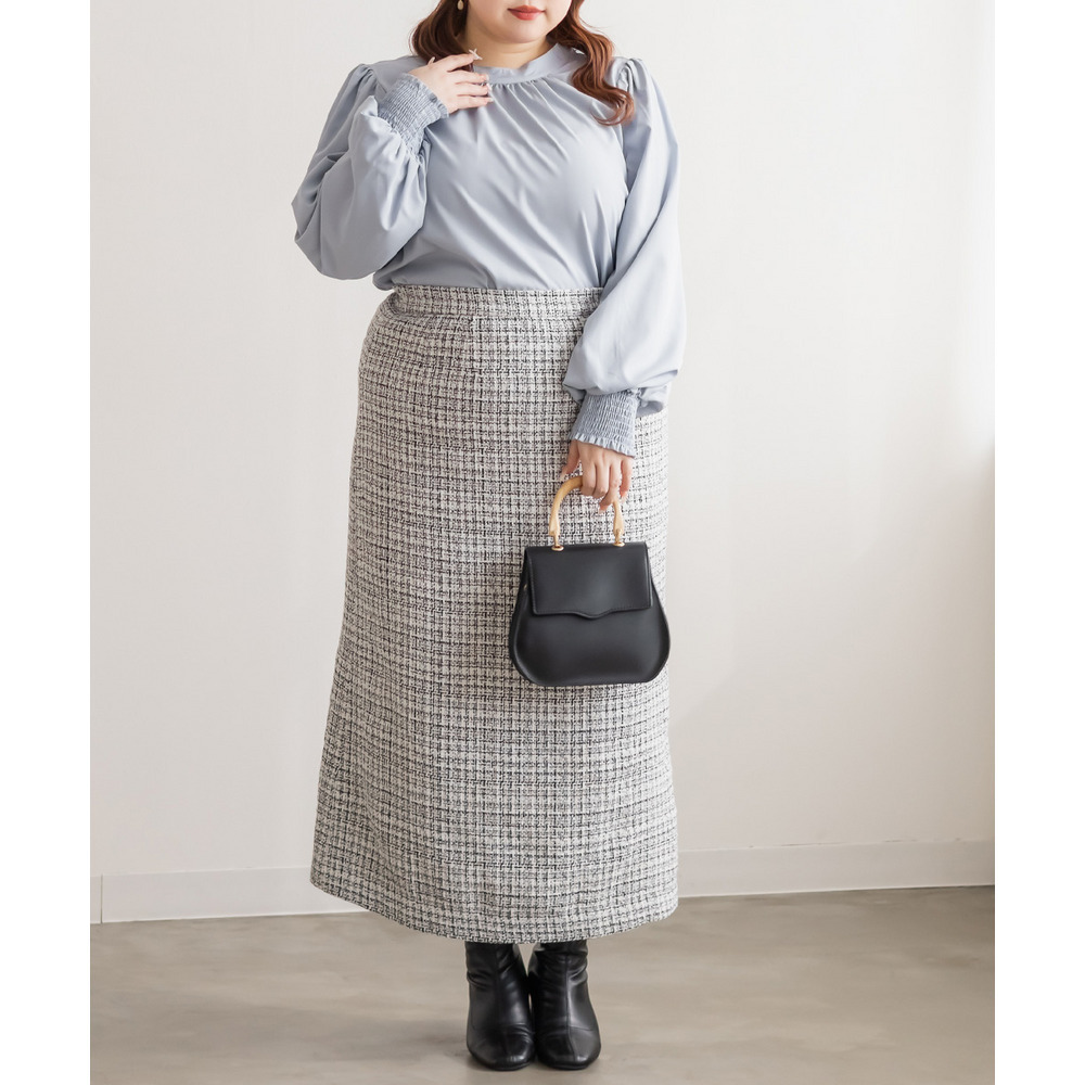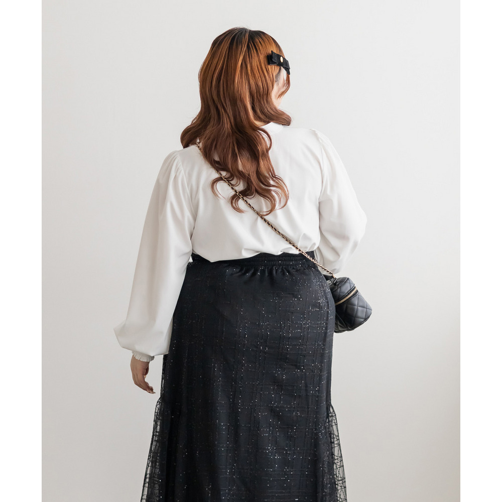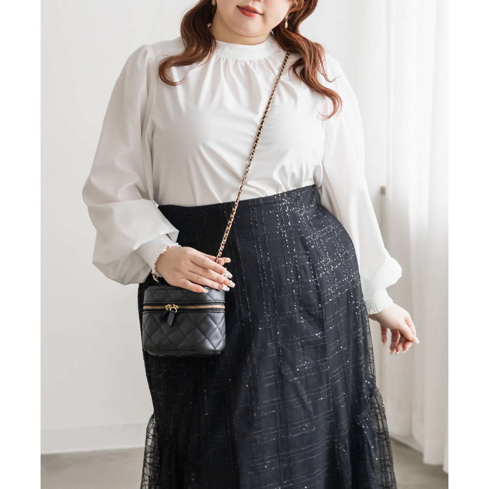 3Lサイズを着用しました。普段着ているサイズ感と比べてもぴったりで、首まわりや身幅に窮屈感がなく安心して着られました。ハイネックデザインですがギャザーが入っているので締め付け感がなく、顔まわりもふんわりと女性らしい印象に♪ 落ち感のある素材でボディラインを自然にカバーしてくれて、1枚で着映えするのが嬉しいです。スカート合わせでフェミニンにも、パンツ合わせで少し大人っぽく着るのもおすすめ◎ オフィスからお出かけまで幅広く使えるブラウスだと思います。