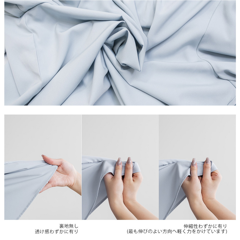 素材 ■素材 【表地】ポリエステル95%、ポリウレタン5%、【袖裏地】ポリエステル100% ■裏地・透け感・伸縮性 裏地無し、透け感わずかに有り、伸縮性無し ■ポケット 無し ■生地感 さらりとした薄手の伸縮性のない布帛素材。