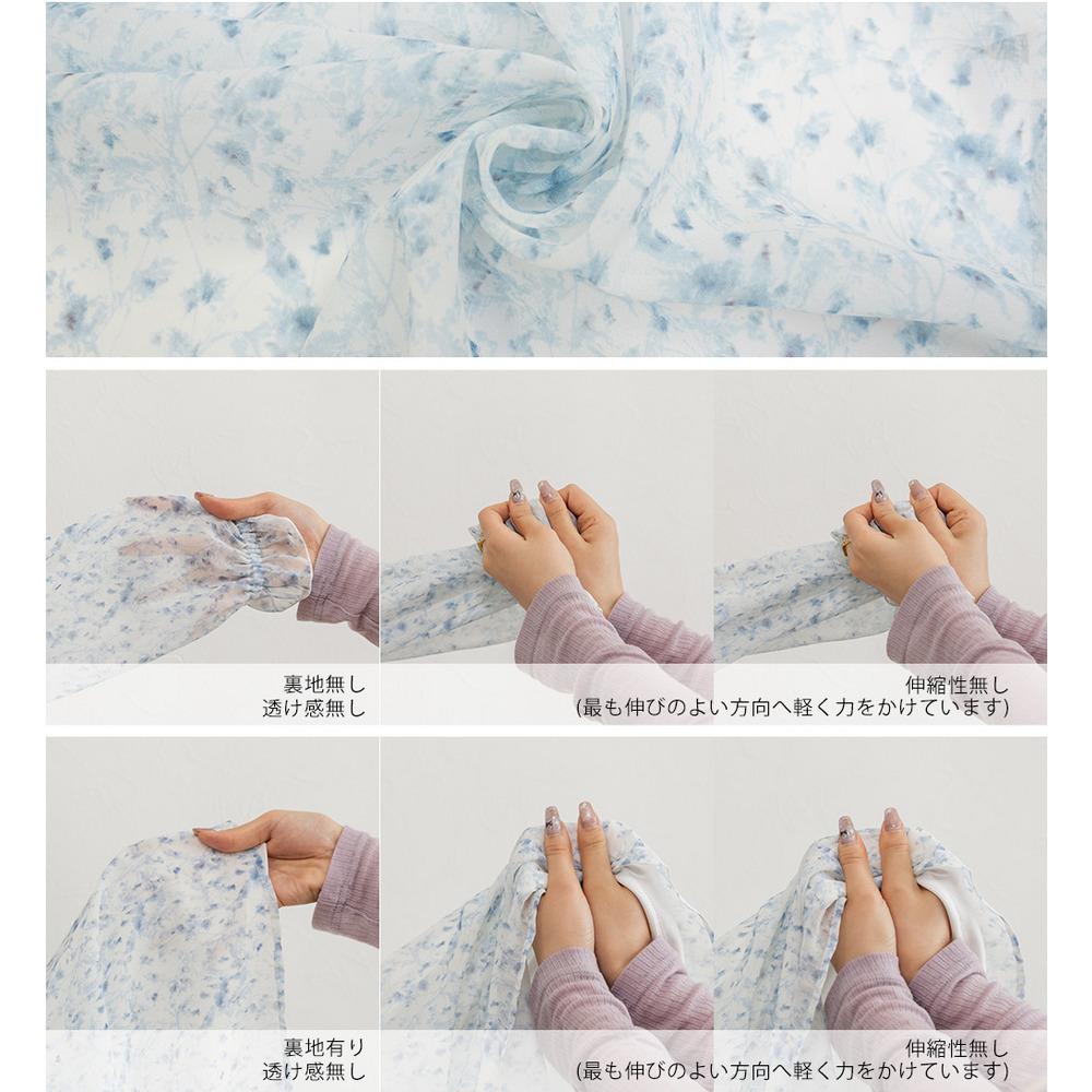 | 素材 | ■素材 【表地】本体 ポリエステル100%、レース部分 ナイロン100%、【裏地】ポリエステル100% ■裏地・透け感・伸縮性 身頃:裏地有り、透け感少し有り、伸縮性無し / 袖部分:裏地無し、透け感有り、伸縮性無し ■ポケット 無し ■生地感 透け感のある軽やかなシフォン素材です。裏地は伸縮性があります。 |
