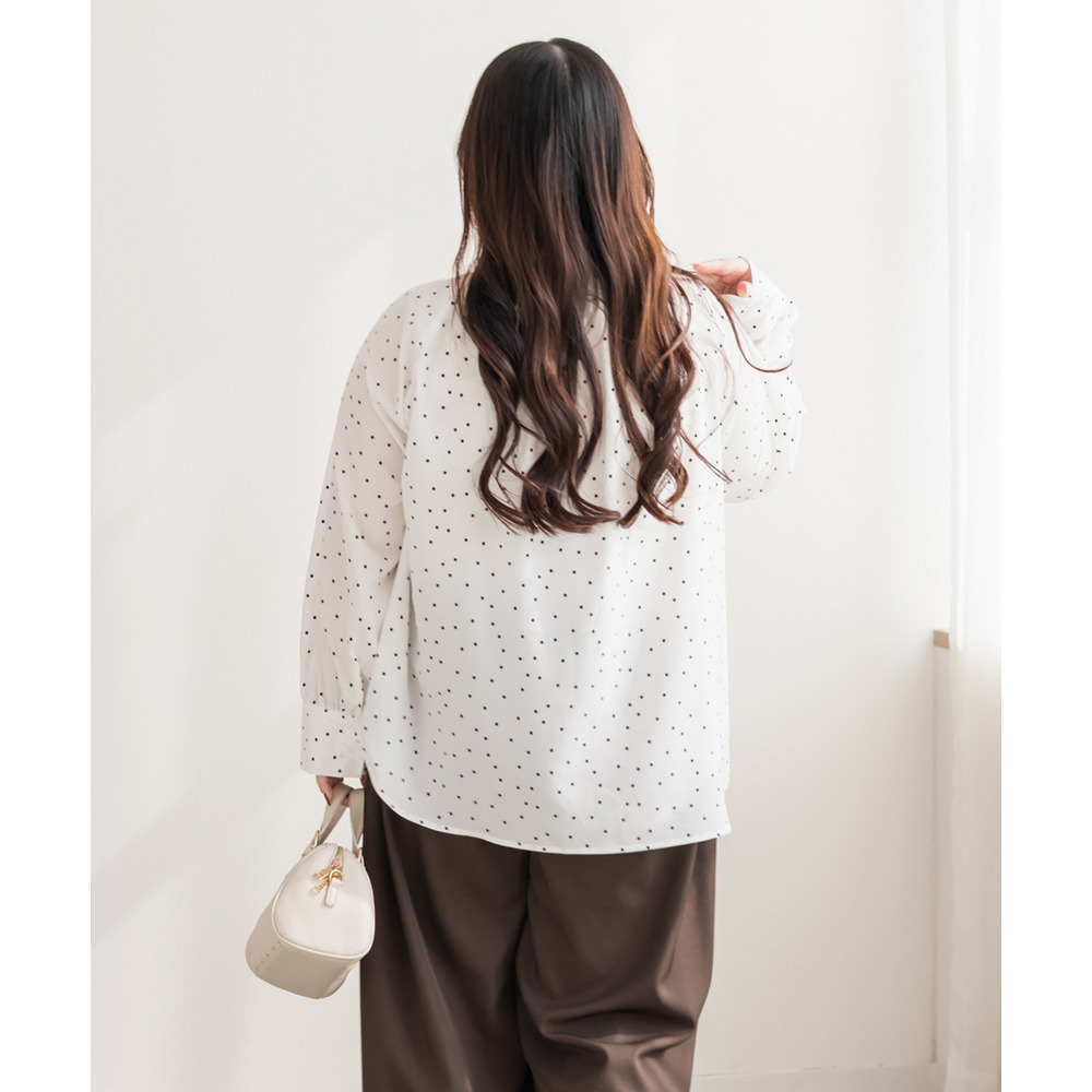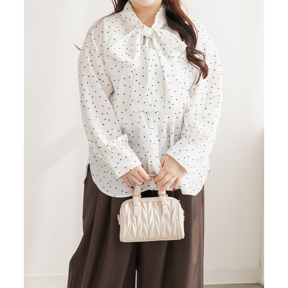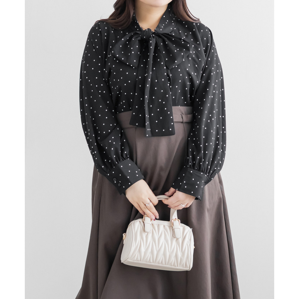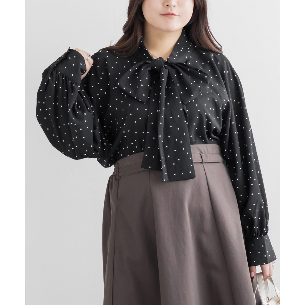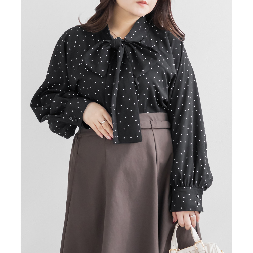 3Lサイズを着用しました。身幅や腕まわりに程よくゆとりがあり、全体的にちょうどいい着心地でした。ドット柄とボウタイデザインが上品な華やかさをプラスしてくれて、顔まわりがぱっと明るい印象に見えます。甘くなりすぎないバランスなので、大人フェミニンに着られるのが嬉しいポイント♪ボウタイは結び方で雰囲気を変えられるので、きれいめにも少しカジュアルにもアレンジ可能です◎ スカート合わせで華やかに、パンツ合わせで通勤スタイルにもおすすめのブラウスだと思いました。