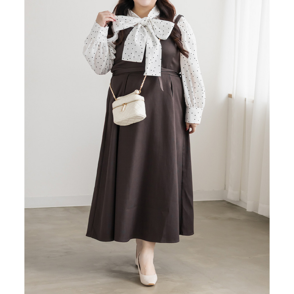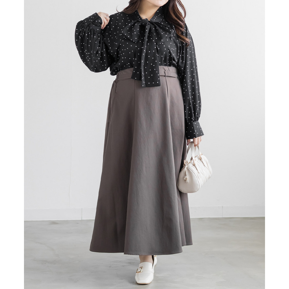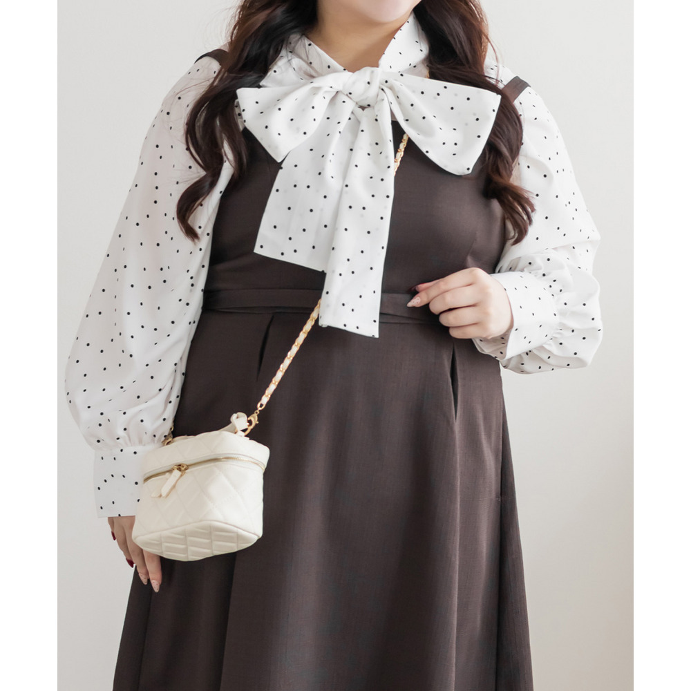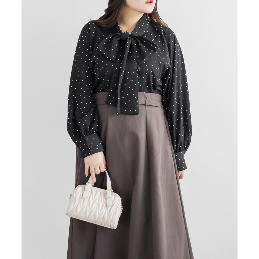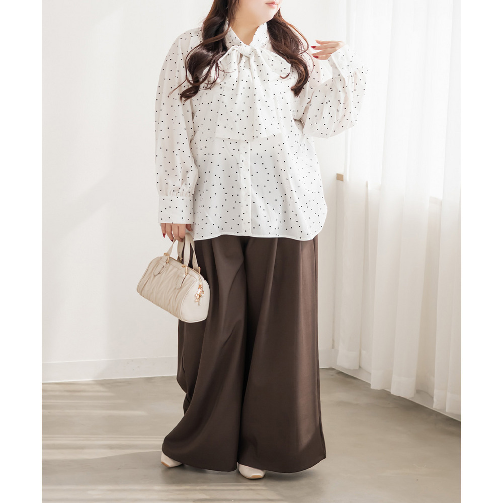 3Lサイズを着用しました。身幅や腕まわりに程よくゆとりがあり、全体的にちょうどいい着心地でした。ドット柄とボウタイデザインが上品な華やかさをプラスしてくれて、顔まわりがぱっと明るい印象に見えます。甘くなりすぎないバランスなので、大人フェミニンに着られるのが嬉しいポイント♪ボウタイは結び方で雰囲気を変えられるので、きれいめにも少しカジュアルにもアレンジ可能です◎ スカート合わせで華やかに、パンツ合わせで通勤スタイルにもおすすめのブラウスだと思いました。