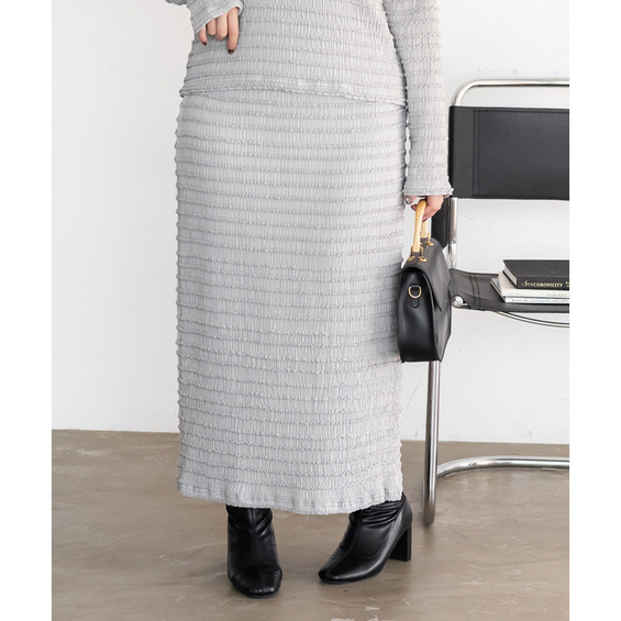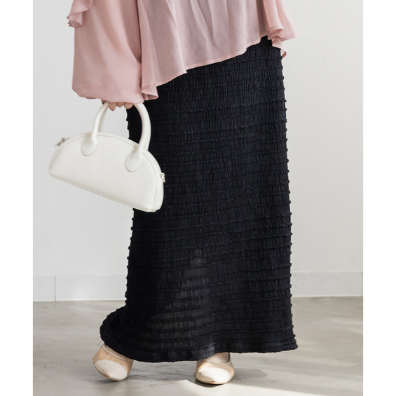 3Lサイズを着用して、ウエストは総ゴム仕様で楽ちんな履き心地でした♪ すとんと落ちるIラインシルエットで縦長効果があり、すっきりとした印象です。小さなフリルがあしらわれたデザインがさりげなく華やかさをプラスしてくれます。さらに、凹凸感のある生地で肉感を拾いにくく、着やせ効果が期待できるのも嬉しいポイント! 後ろスリット入りで足さばきもしやすく、歩きやすさも◎ Tシャツやブラウス、ショート丈アウターとも相性抜群!カジュアルにもきれいめにも使える万能スカートです♪