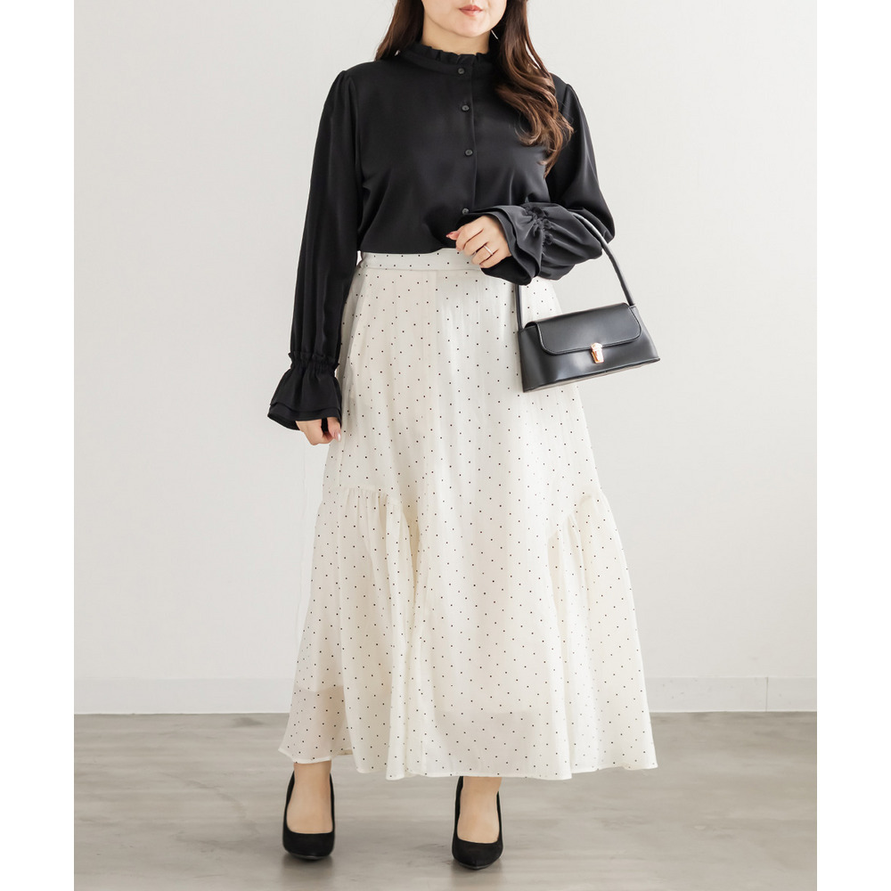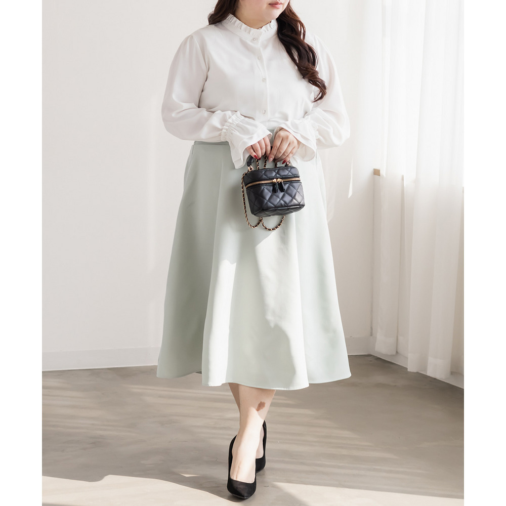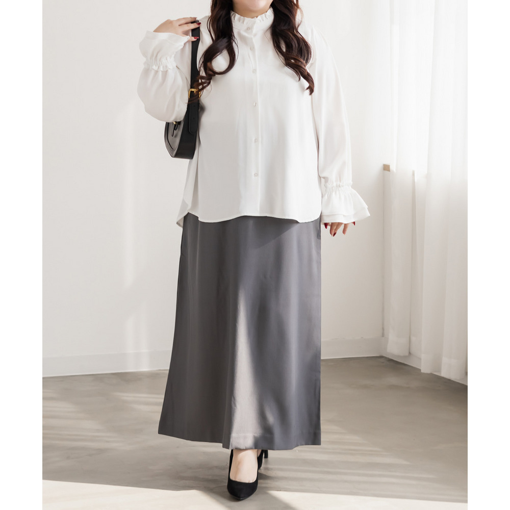 3Lサイズを着用しました。身幅や肩まわりに程よくゆとりがあり、全体的にちょうどいい着心地でした。スタンドカラーとフリルデザインが顔まわりを華やかに見せてくれて、1枚で上品な印象に仕上がります。甘くなりすぎないデザインなので、大人っぽく着られるのも嬉しいポイント♪身頃はすっきりとしたシルエットで、インでもアウトでもバランスよく着用できます。スカート合わせでフェミニンに、パンツ合わせで通勤スタイルにもおすすめの、着回し力の高いブラウスだと思いました◎