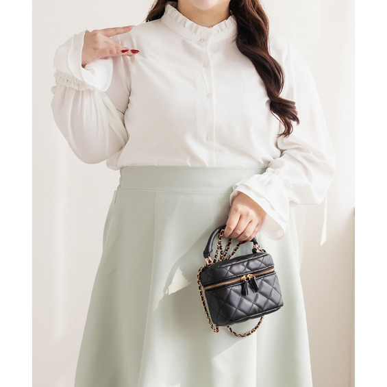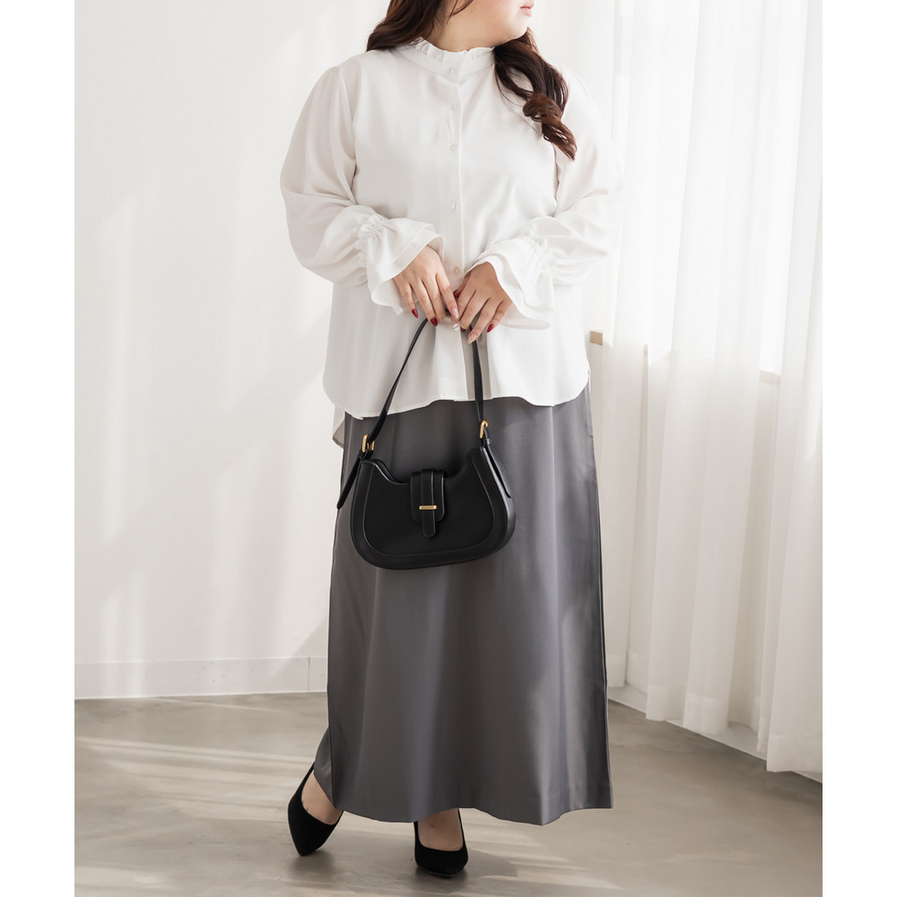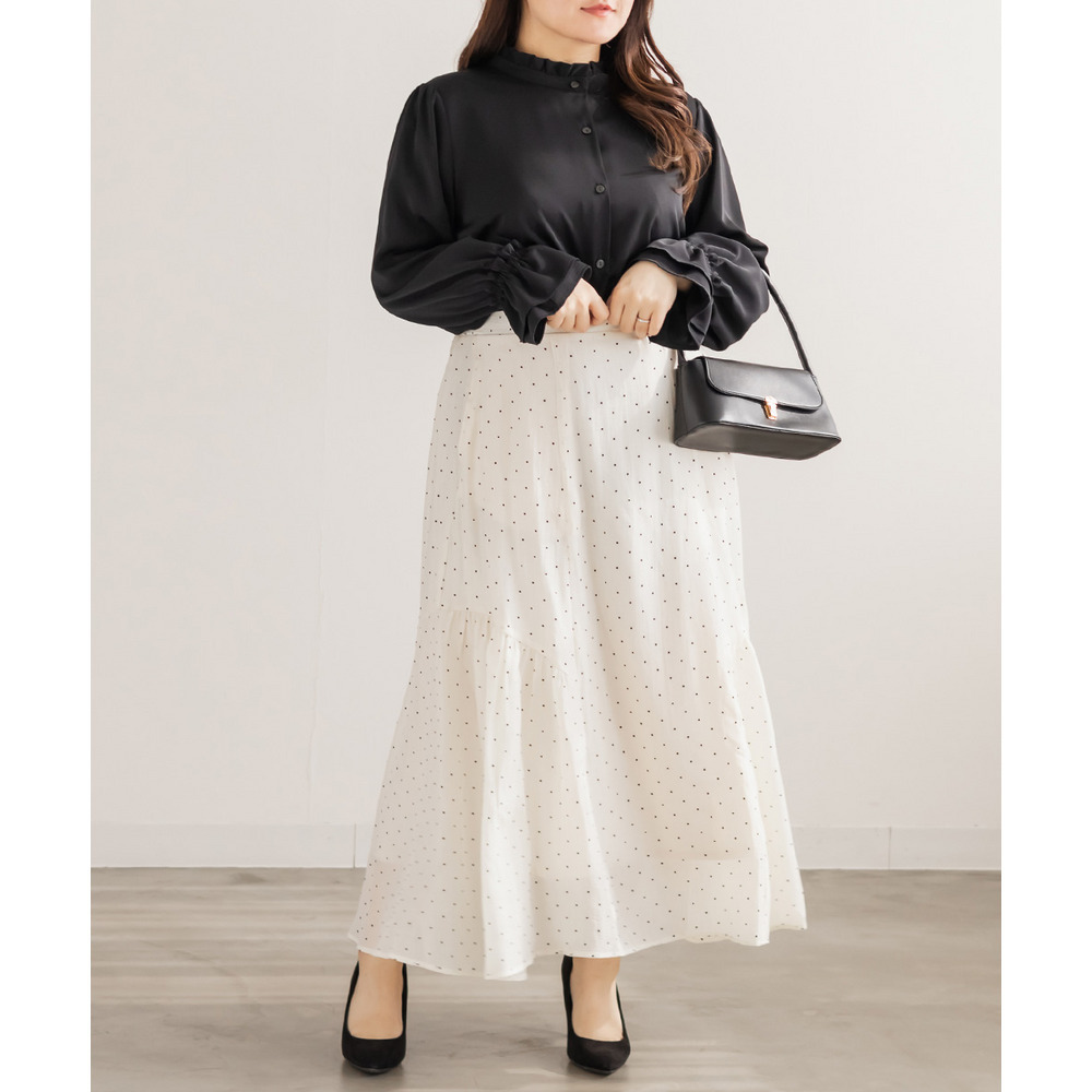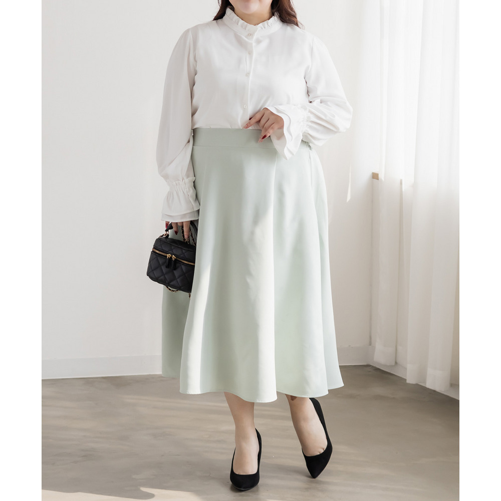 3Lサイズを着用しました。身幅や肩まわりに程よくゆとりがあり、全体的にちょうどいい着心地でした。スタンドカラーとフリルデザインが顔まわりを華やかに見せてくれて、1枚で上品な印象に仕上がります。甘くなりすぎないデザインなので、大人っぽく着られるのも嬉しいポイント♪身頃はすっきりとしたシルエットで、インでもアウトでもバランスよく着用できます。スカート合わせでフェミニンに、パンツ合わせで通勤スタイルにもおすすめの、着回し力の高いブラウスだと思いました◎