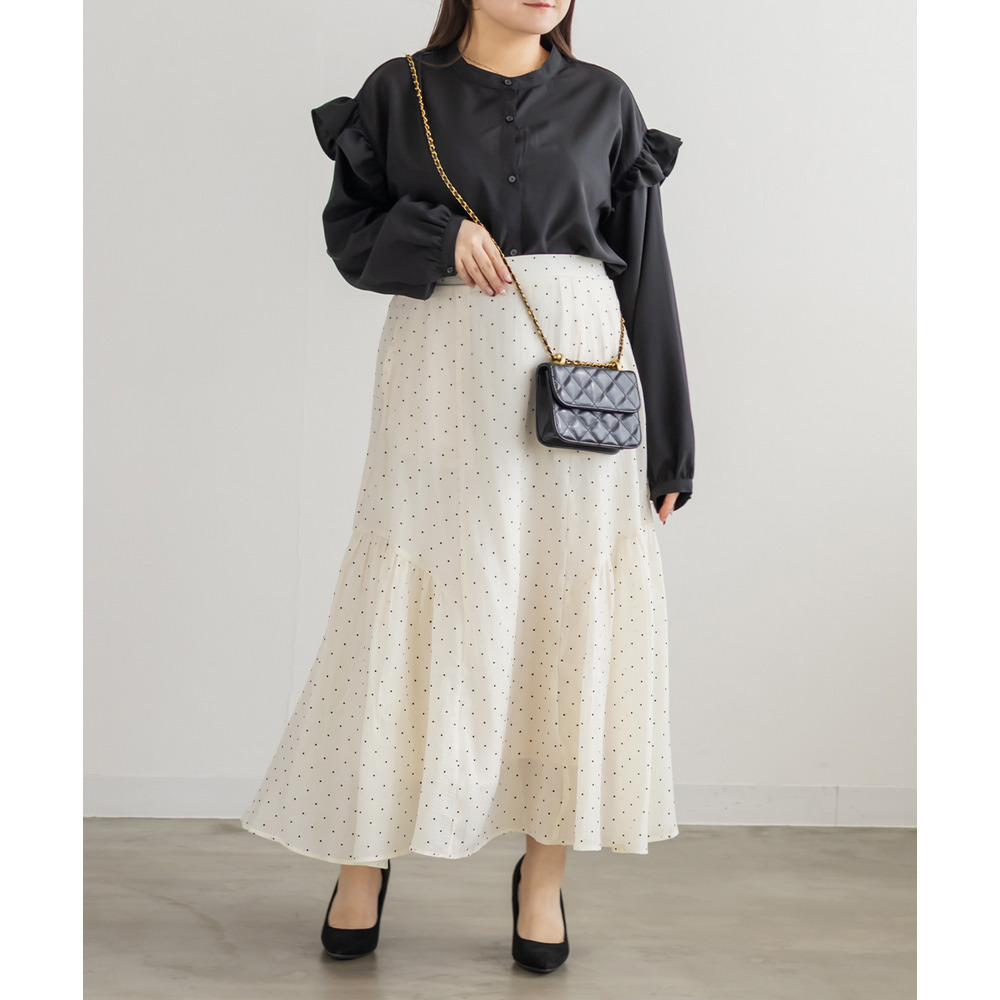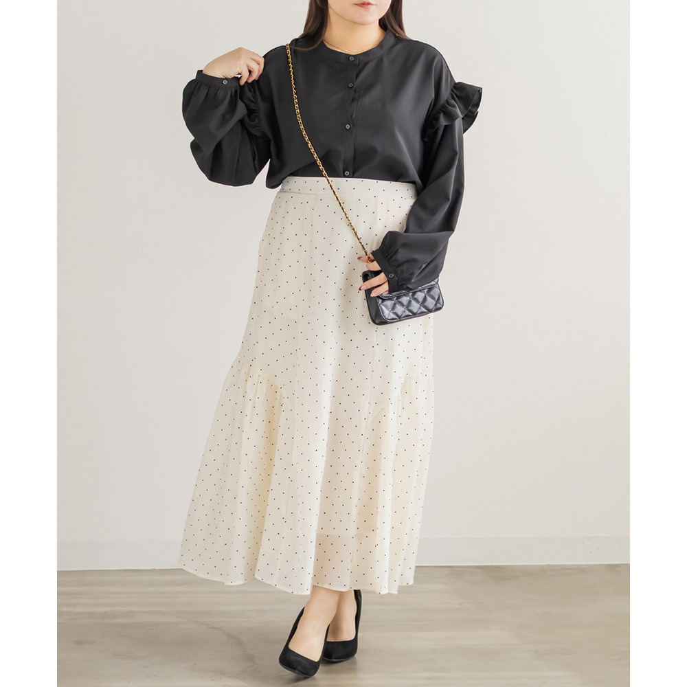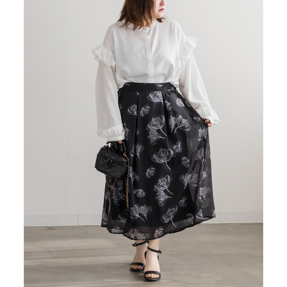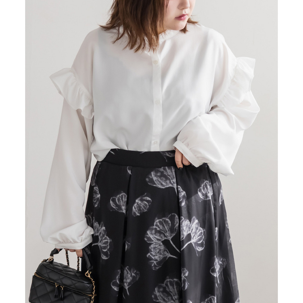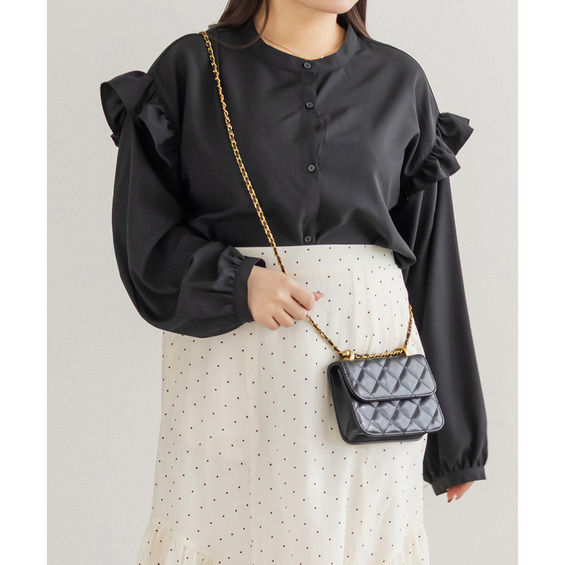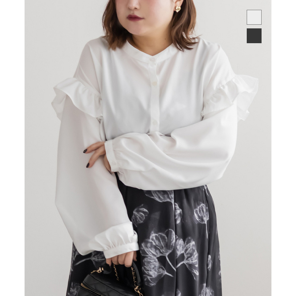 | 3Lサイズを着用しました。身幅や肩まわりに程よくゆとりがあり、全体的に楽な着心地でした。肩のフリルデザインが大きすぎないので着やすく、顔まわりを華やかに見せてくれて1枚で上品な印象に仕上がります。甘くなりすぎないデザインなので、大人っぽく着られるのも嬉しいポイントです!身頃はすっきりとしたシルエットで、インでもアウトでもバランスよく着用できます。スカート合わせでフェミニンに、パンツ合わせで通勤スタイルにもおすすめの、着回し力の高いブラウスだと思いました◎ |