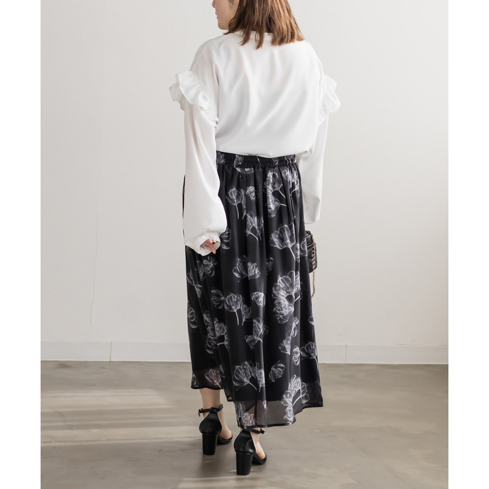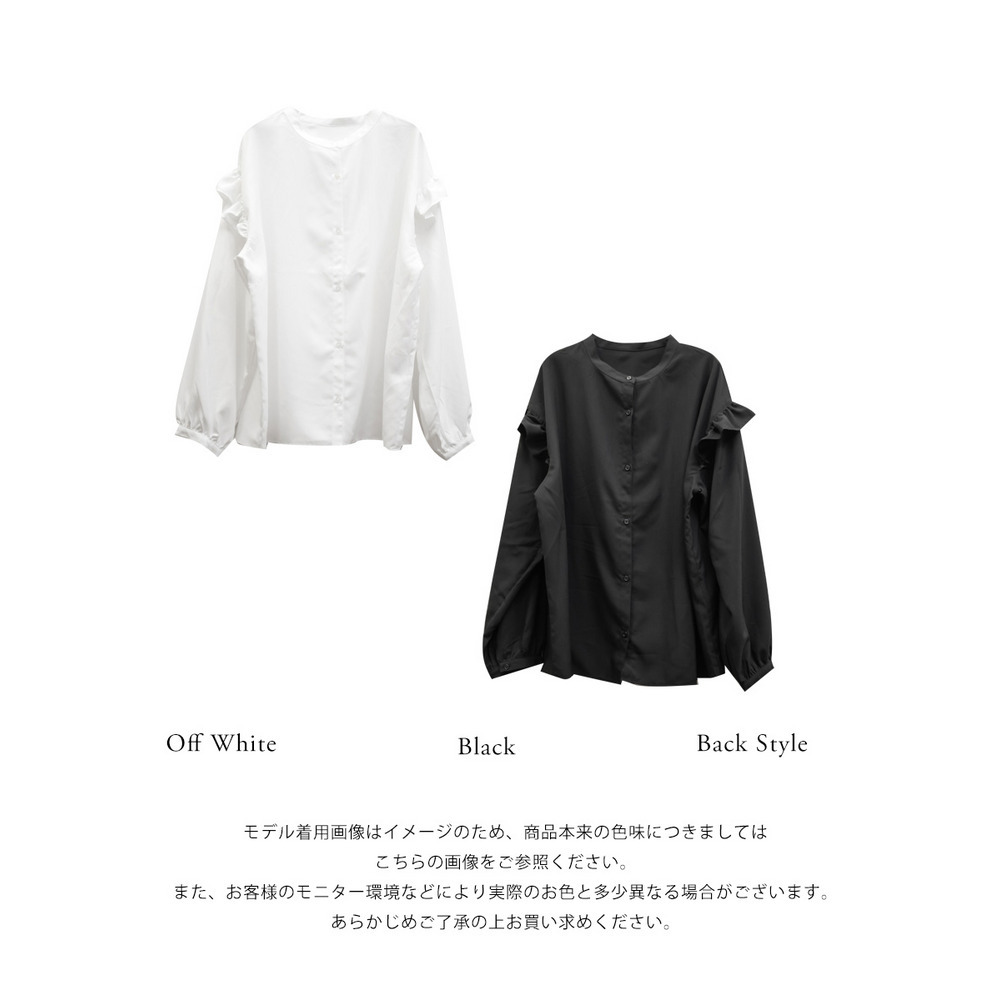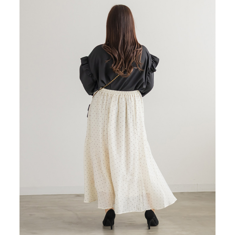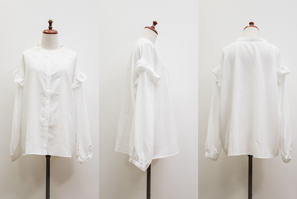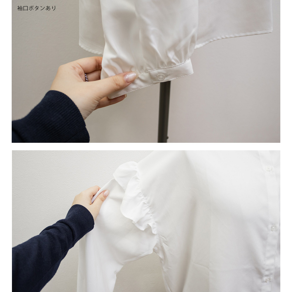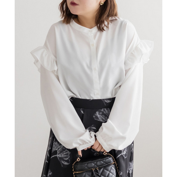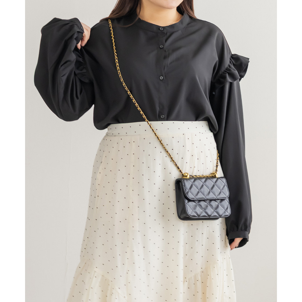 | 3Lサイズを着用しました。身幅や肩まわりに程よくゆとりがあり、全体的に楽な着心地でした。肩のフリルデザインが大きすぎないので着やすく、顔まわりを華やかに見せてくれて1枚で上品な印象に仕上がります。甘くなりすぎないデザインなので、大人っぽく着られるのも嬉しいポイントです!身頃はすっきりとしたシルエットで、インでもアウトでもバランスよく着用できます。スカート合わせでフェミニンに、パンツ合わせで通勤スタイルにもおすすめの、着回し力の高いブラウスだと思いました◎ |