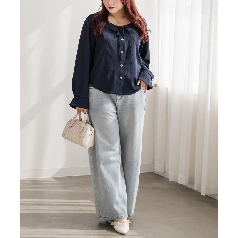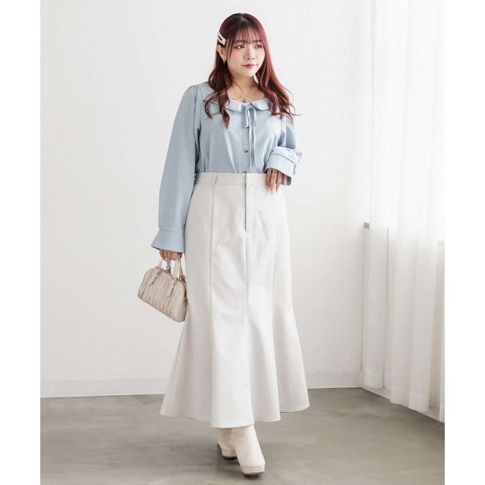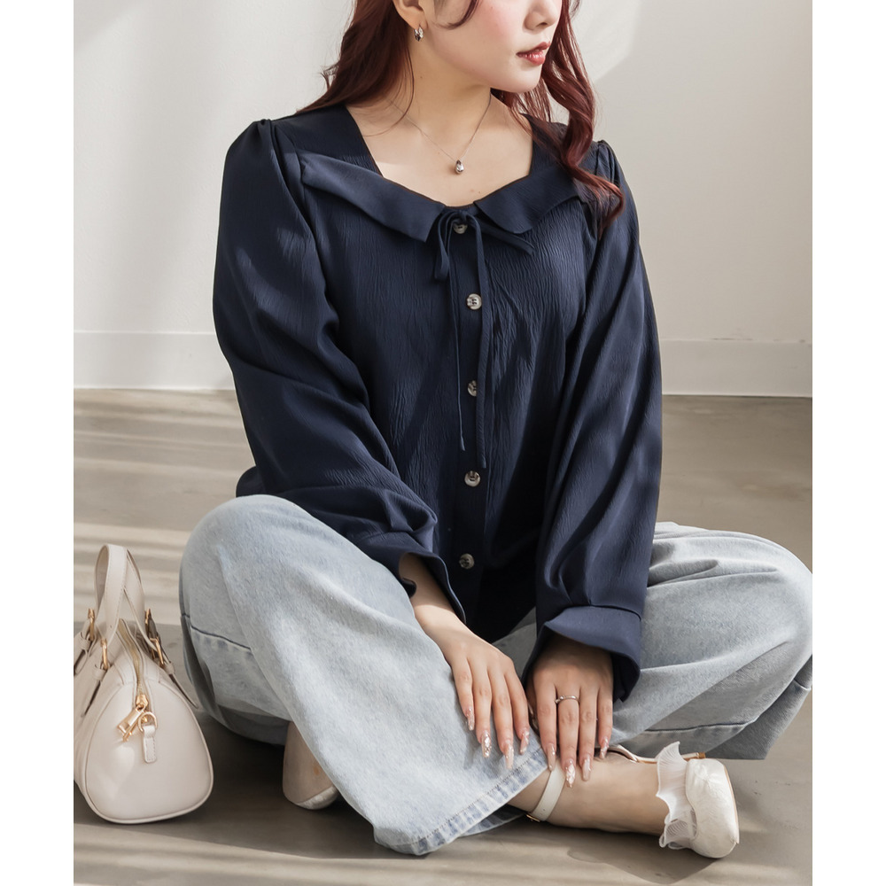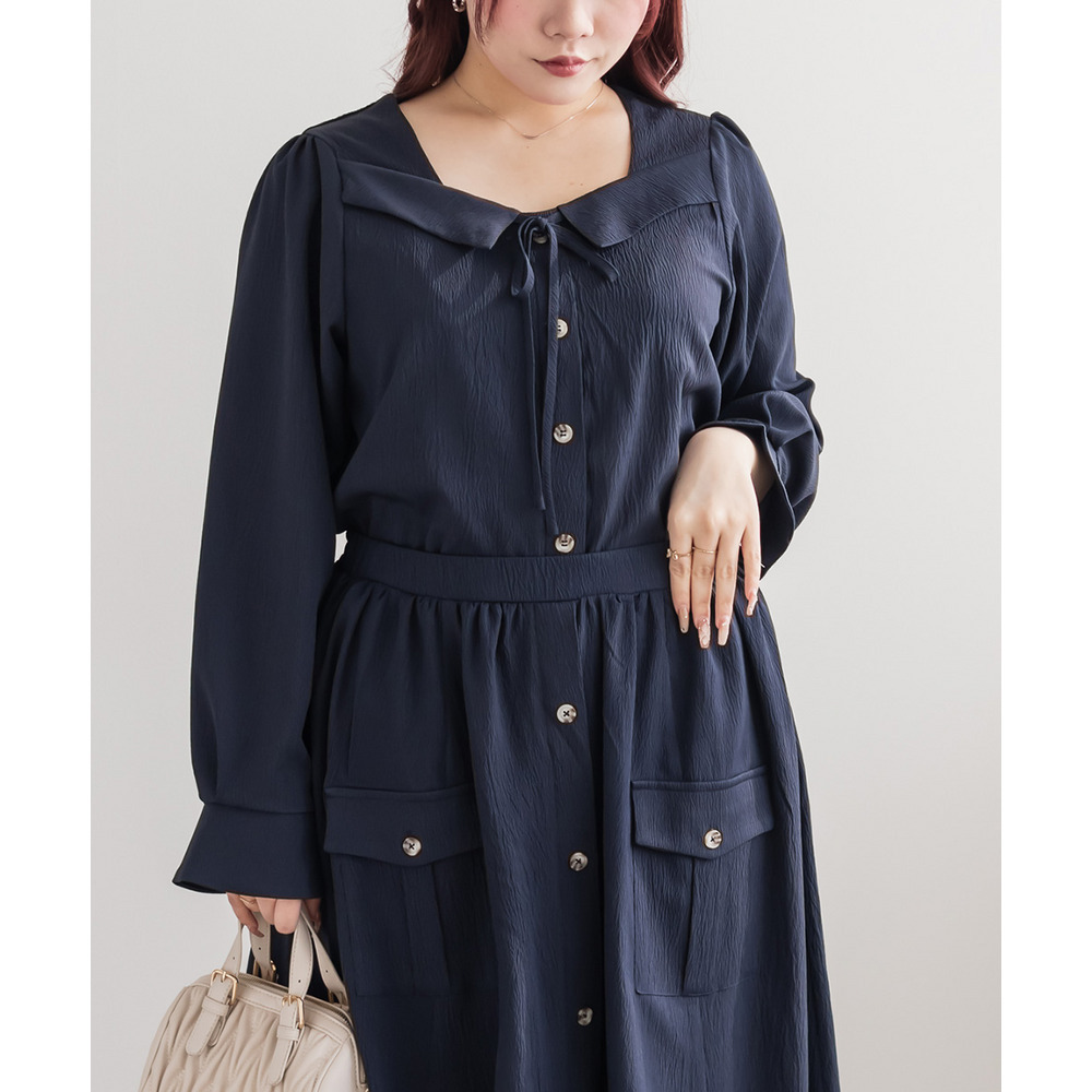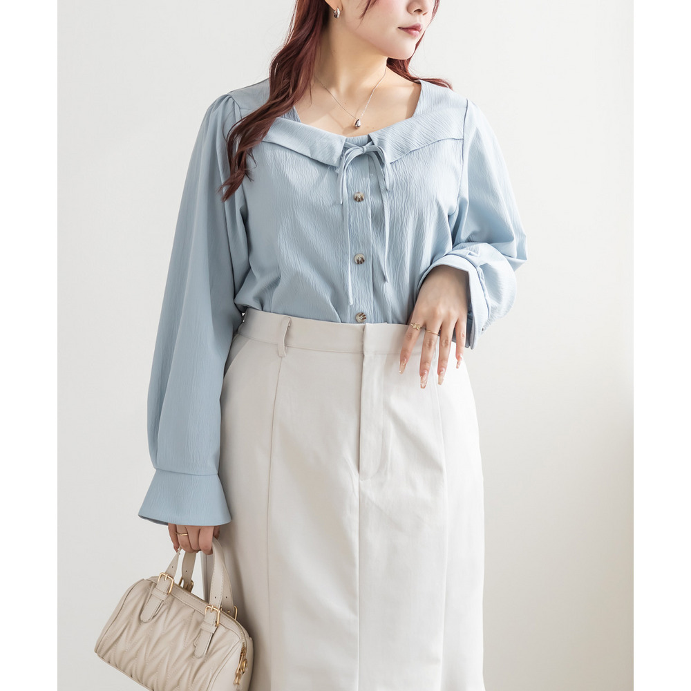 | 3Lサイズを着用しました。身幅や肩まわりに程よくゆとりがあり、全体的にちょうどいい着心地でした。フロントのリボンデザインがさりげなく華やかで、顔まわりを明るく見せてくれるのが嬉しいポイント♪ネックはスクエアに開いていてデコルテやお顔がすっきり見えします! 甘くなりすぎないデザインなので大人フェミニンに着られます。1枚で着映えするのはもちろん、同素材のロングスカートと合わせればセットアップも楽しめます◎ きちんと感のあるスタイルにもおすすめです。 |