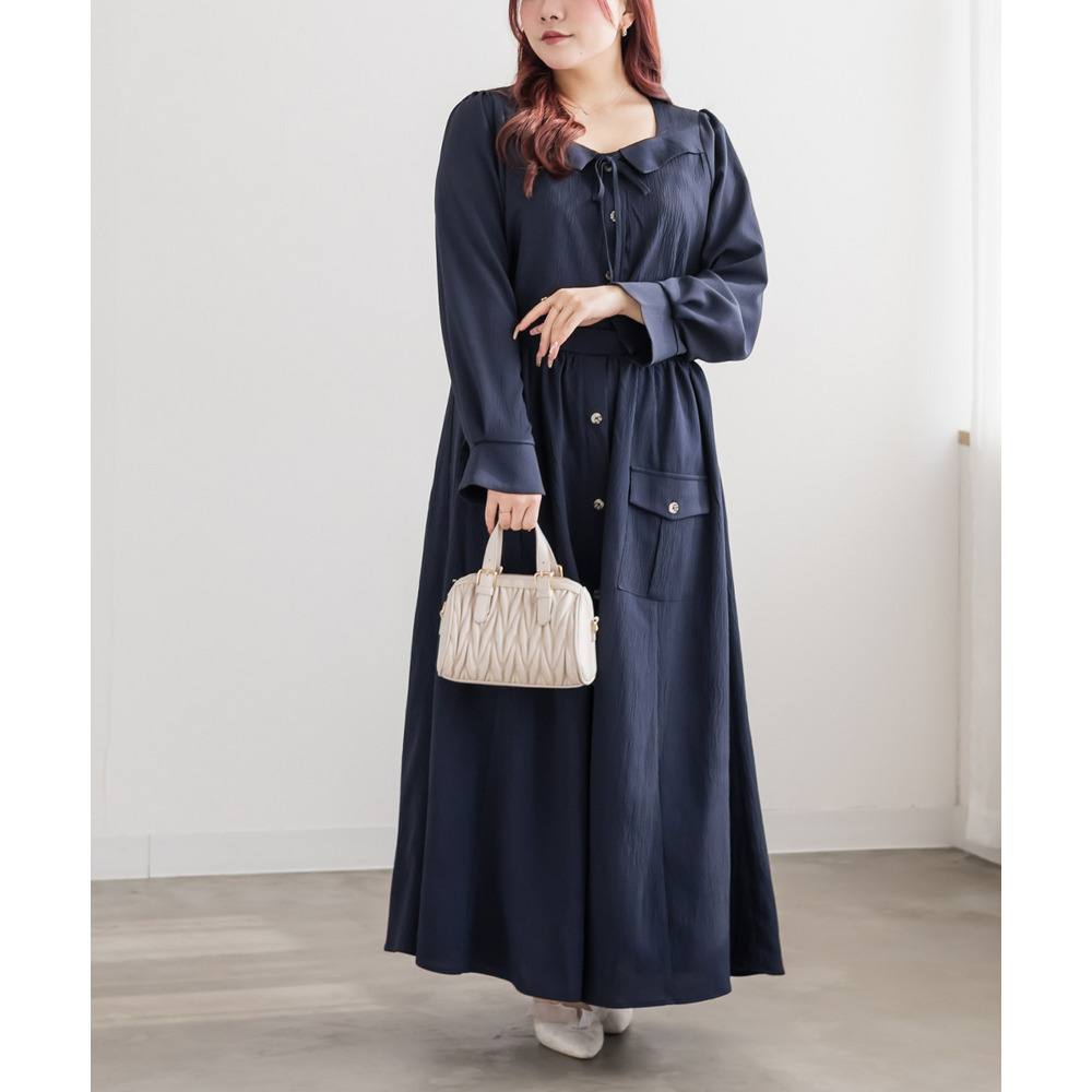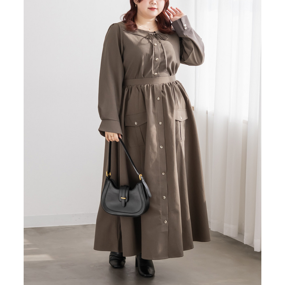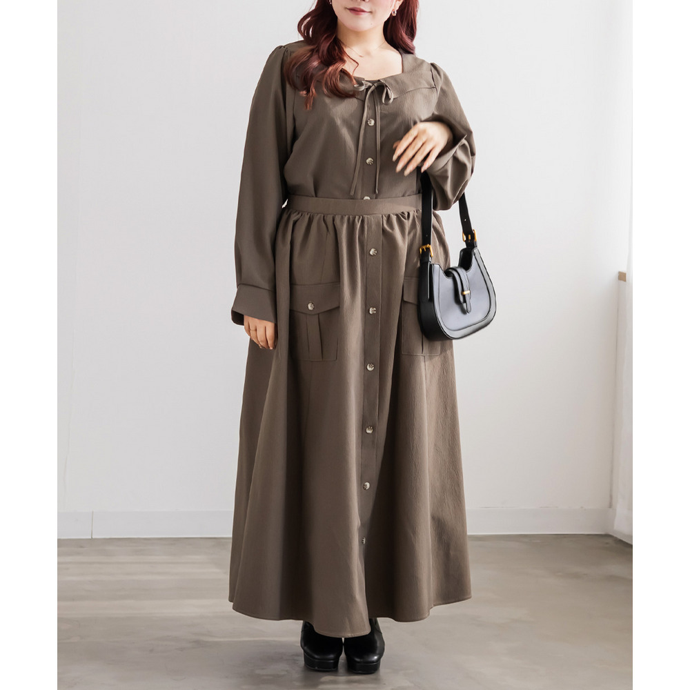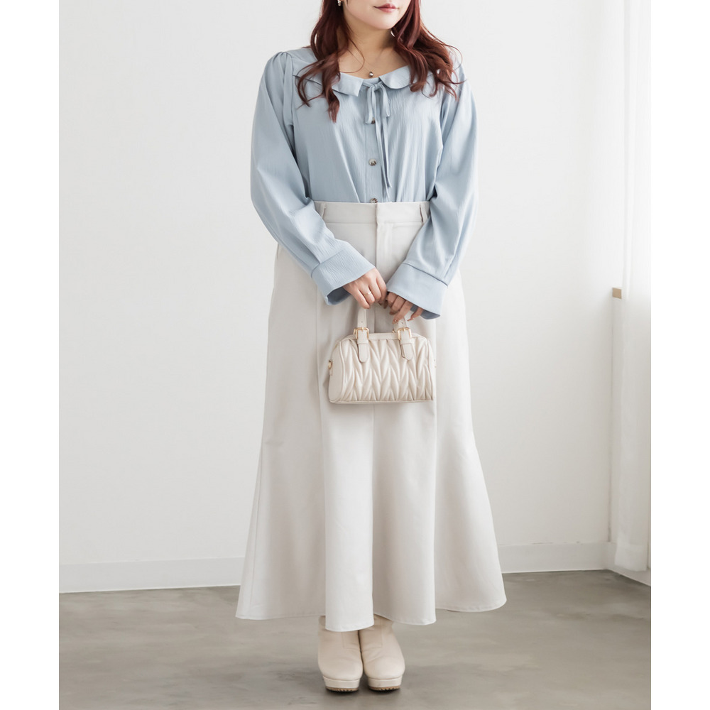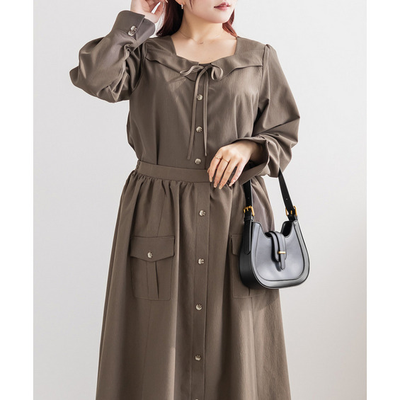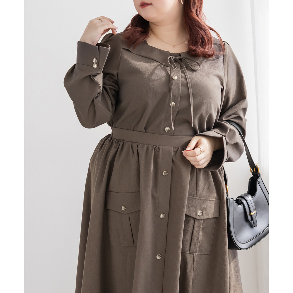| 3Lサイズを着用しました。身幅や肩まわりに程よくゆとりがあり、全体的にちょうどいい着心地でした。フロントのリボンデザインがさりげなく華やかで、顔まわりを明るく見せてくれるのが嬉しいポイント♪ネックはスクエアに開いていてデコルテやお顔がすっきり見えします! 甘くなりすぎないデザインなので大人フェミニンに着られます。1枚で着映えするのはもちろん、同素材のロングスカートと合わせればセットアップも楽しめます◎ きちんと感のあるスタイルにもおすすめです。 |