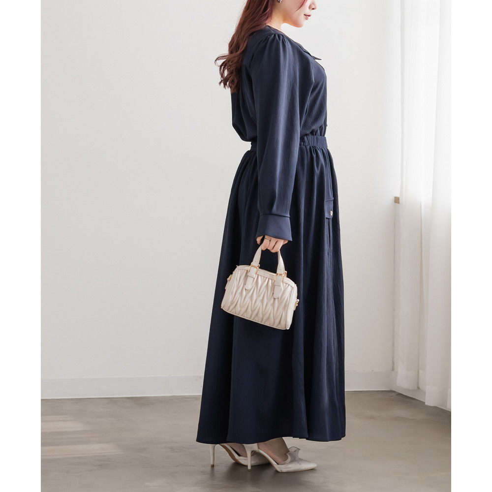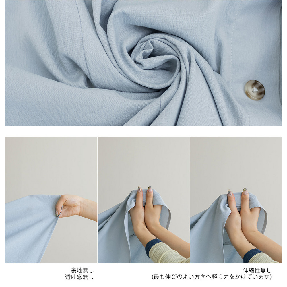 | 素材 | ■素材 ポリエステル100% ■裏地・透け感・伸縮性 裏地無し、透け感無し、伸縮性無し ■ポケット 無し ■生地感 シワ加工のような表面感のある、伸縮性のない布帛素材。 |