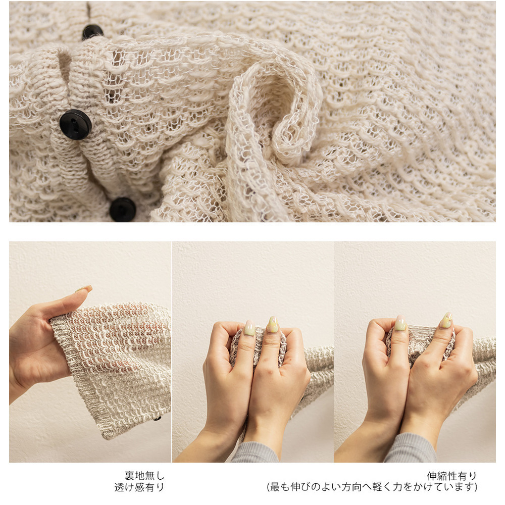 | 素材 | ■素材 綿38%、アクリル32%、ポリエステル26%、レーヨン4% ■裏地・透け感・伸縮性 裏地無し、透け感有り、伸縮性有り ■ポケット 無し ■生地感 ざっくり編みで軽く、さらっとした柔らかい素材です。 |