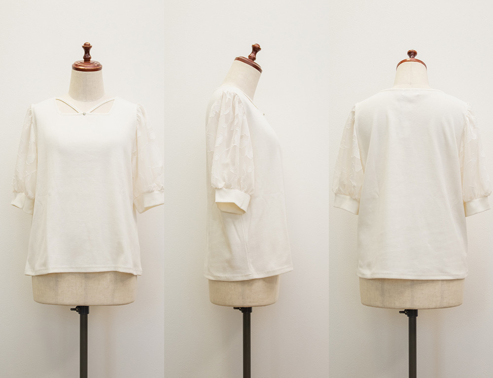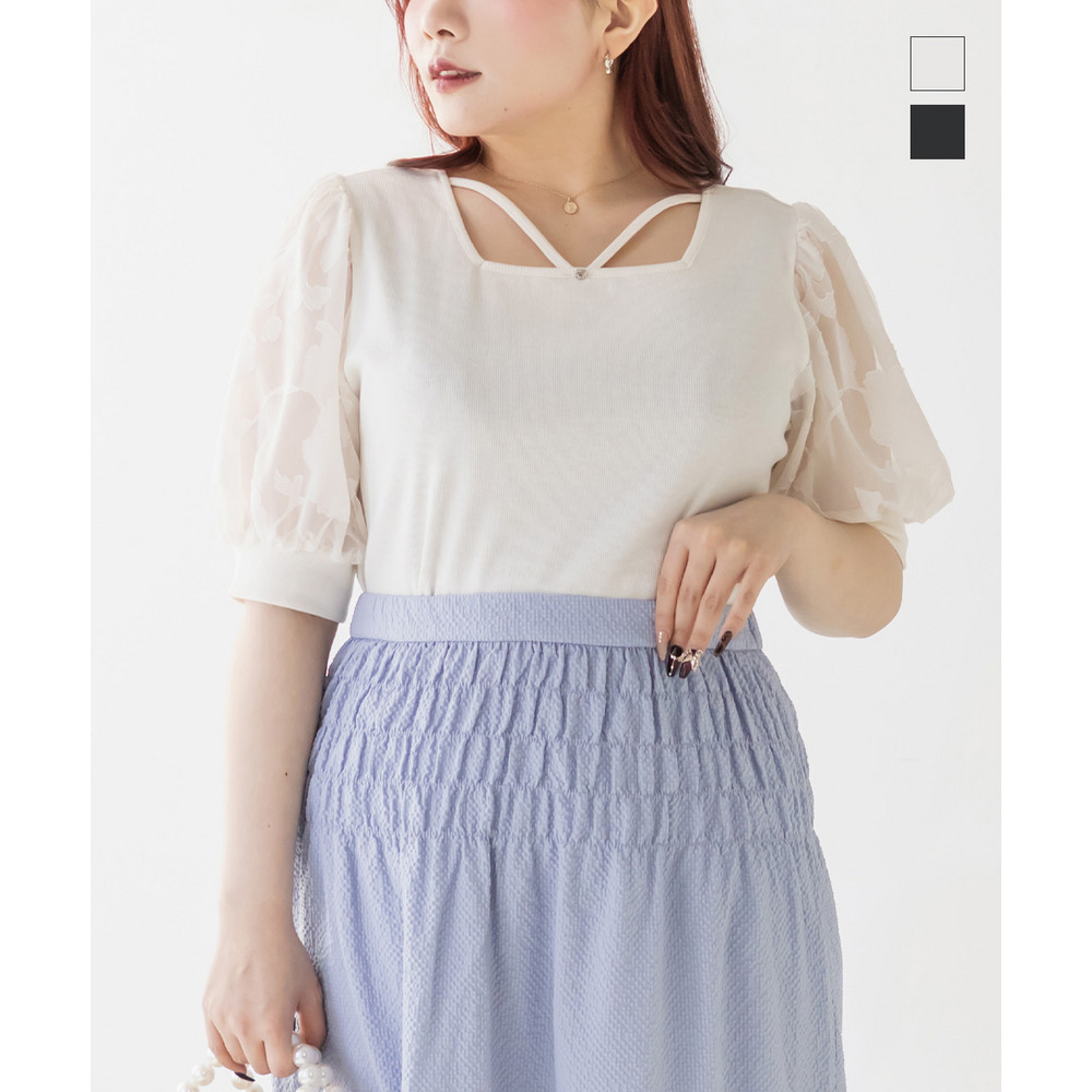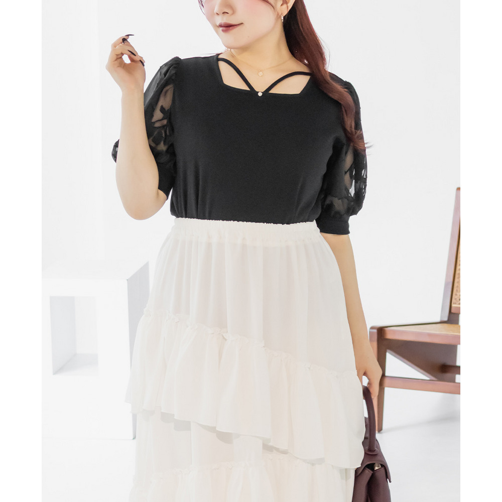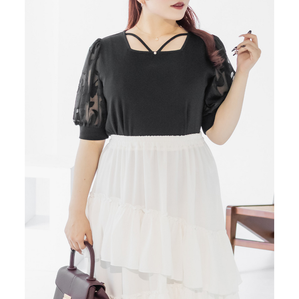 3Lサイズを着て丁度いいサイズ感でした!柔らかなリブのカットソーでストレスのない着心地です◎顔回りを女性らしい雰囲気にしてくれるネックラインで、クロスになっているからメリハリが出て引き締まって見えるのも嬉しいです♪お袖はシアー花柄になっていて、フェミニンな雰囲気たっぷりです!