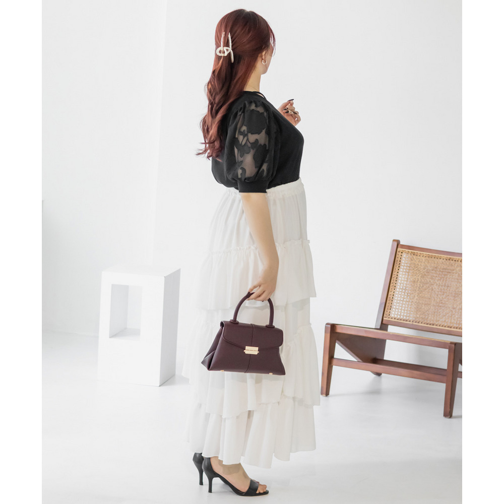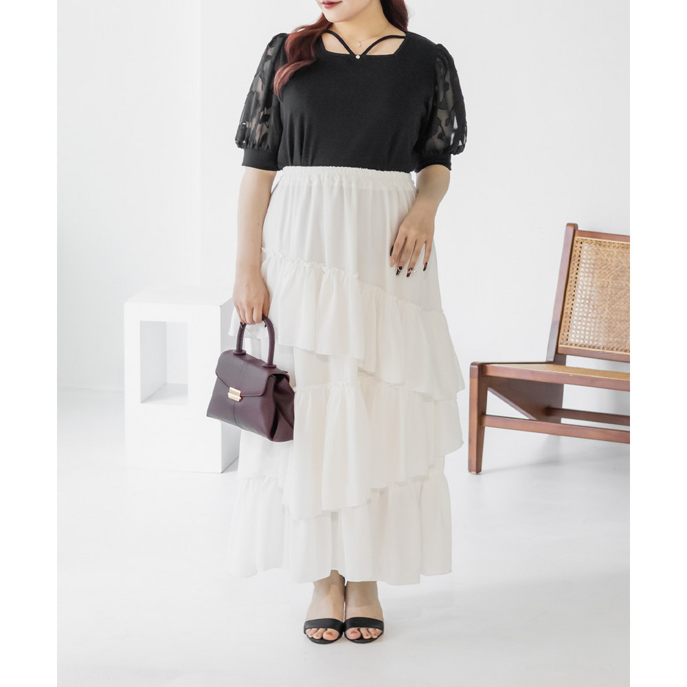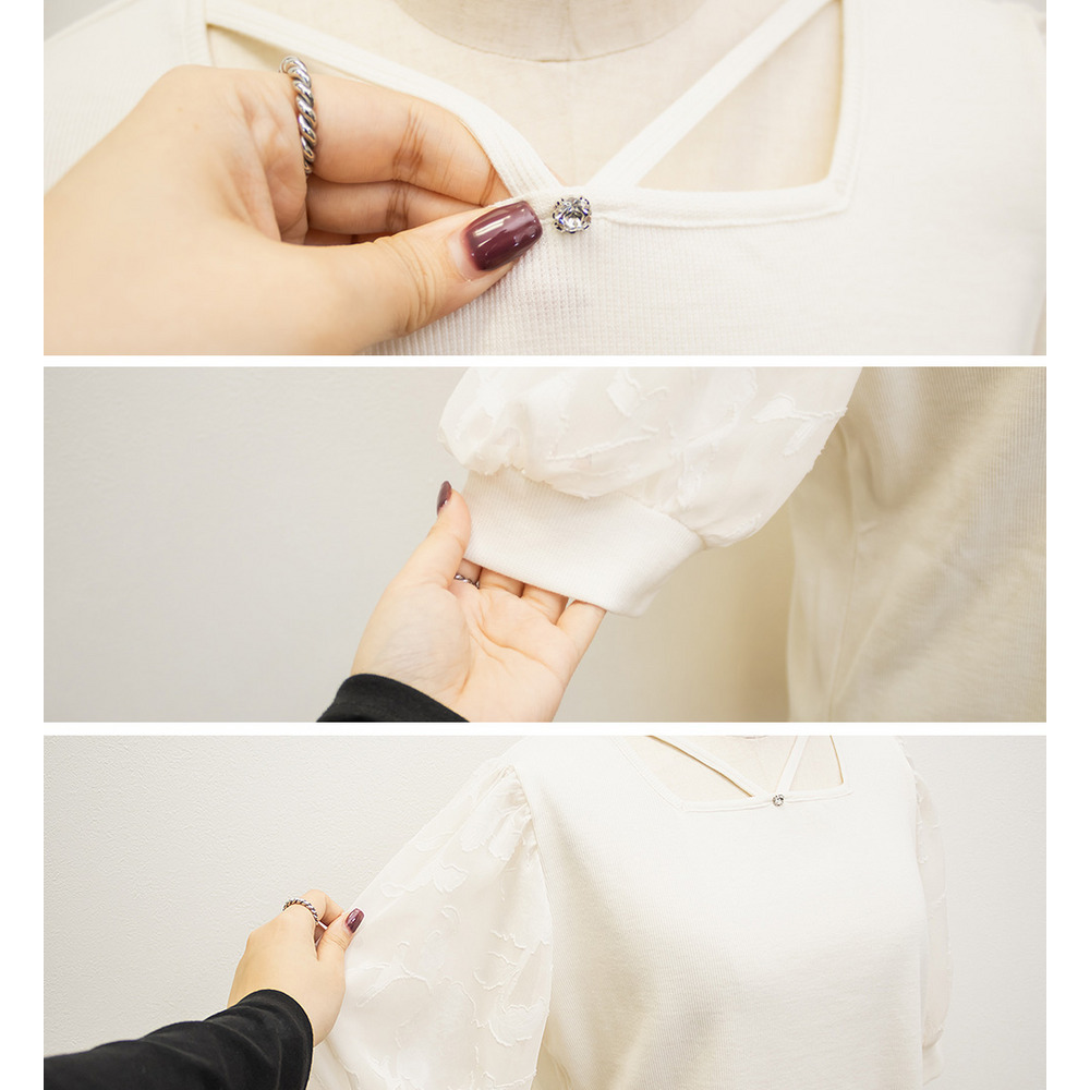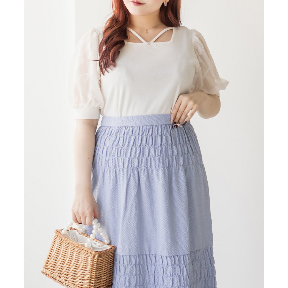 3Lサイズを着て丁度いいサイズ感でした!柔らかなリブのカットソーでストレスのない着心地です◎顔回りを女性らしい雰囲気にしてくれるネックラインで、クロスになっているからメリハリが出て引き締まって見えるのも嬉しいです♪お袖はシアー花柄になっていて、フェミニンな雰囲気たっぷりです!