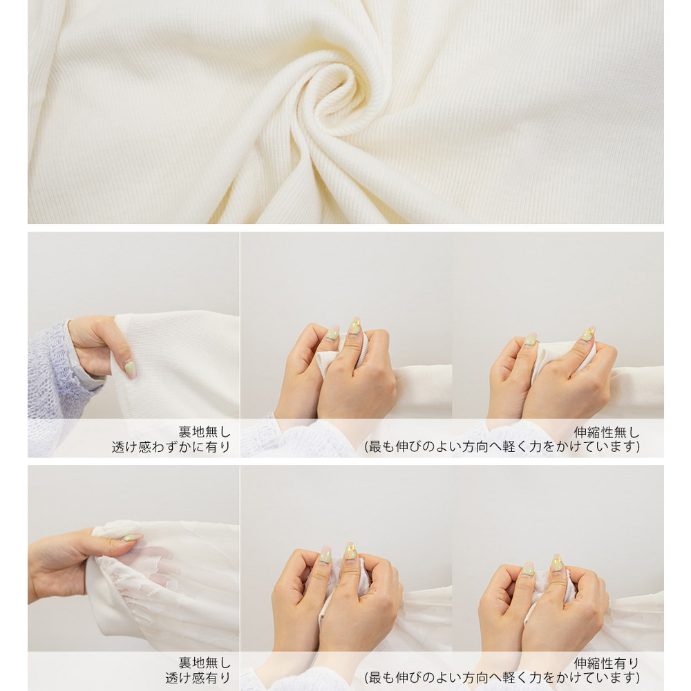 素材 ■素材 【本体】ポリエステル63%、綿33%、ポリウレタン4%、【別布部分】ポリエステル100% ■裏地・透け感・伸縮性 裏地無し、透け感少し有り、伸縮性有り ■ポケット 無し ■生地感 程よく伸縮性のある柔らかなリブ仕様のカットソー素材です。 (袖部分のみ、透け感のあるさらっとしたシフォン素材です。)