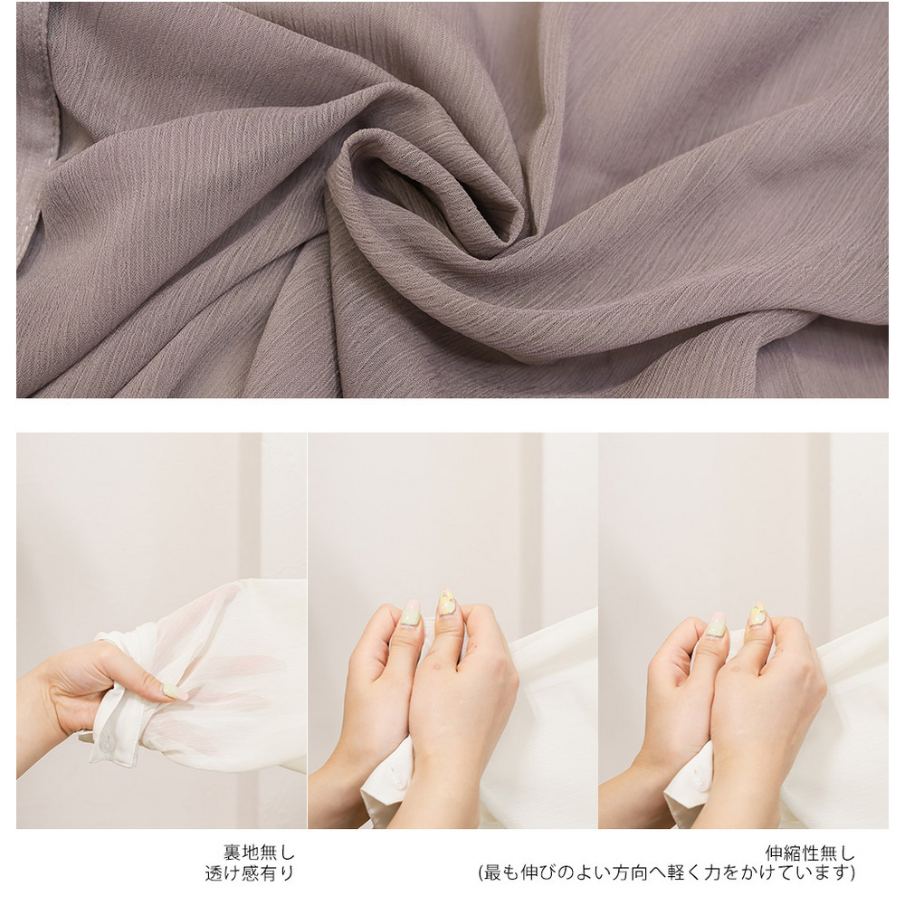 | 素材 | ■素材 ポリエステル100% ■裏地・透け感・伸縮性 裏地無し、透け感有り、伸縮性無し ■ポケット 無し ■生地感 さらっとした薄手の素材です。 |