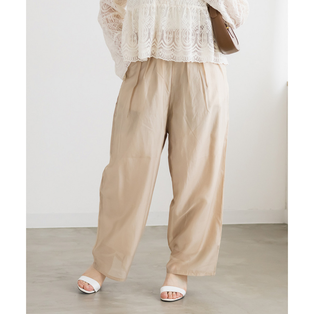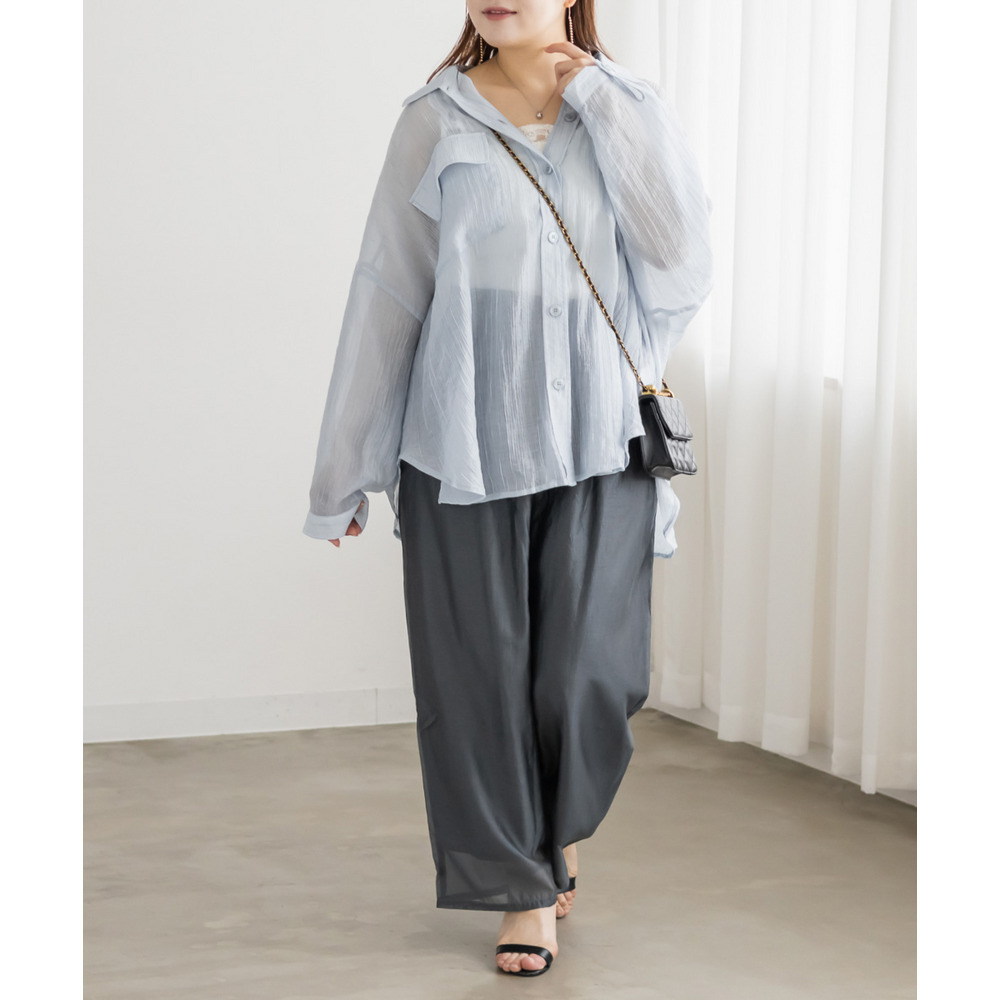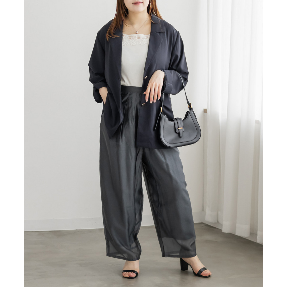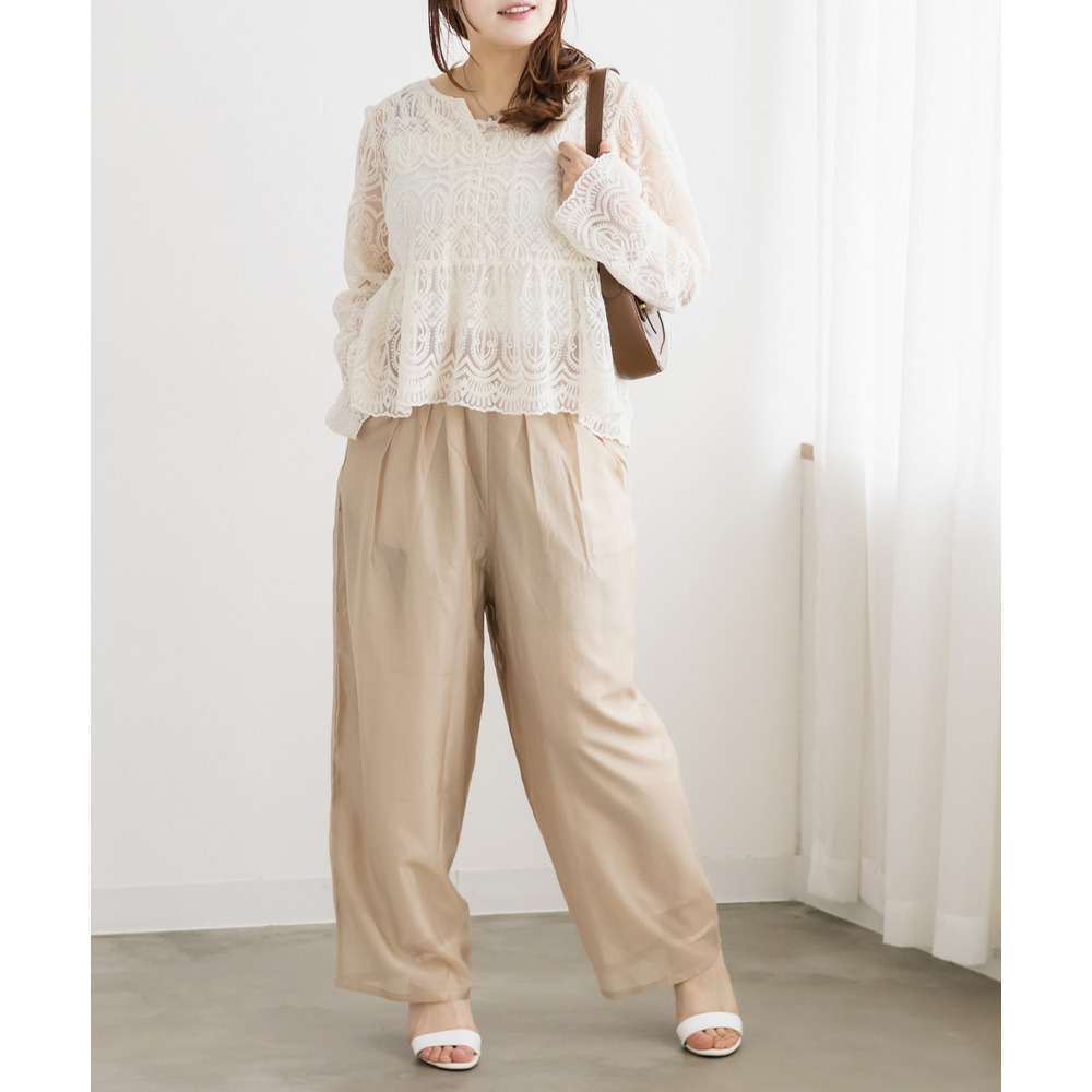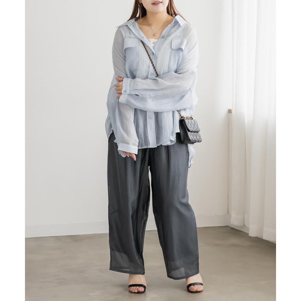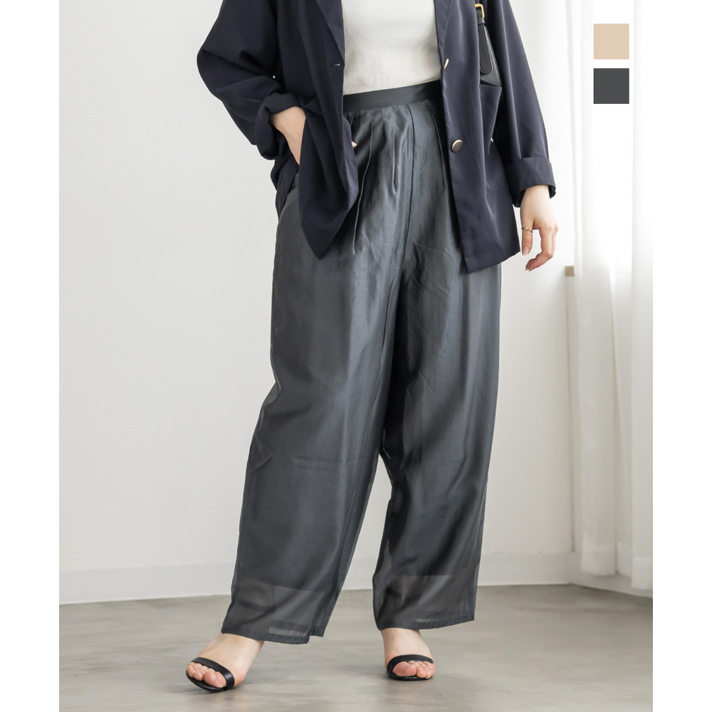 | 3Lサイズを着用しました。ウエストは程よくフィットし、全体的にちょうどいい着心地でした。ダブルタック入りでお腹まわりにゆとりがあり、体のラインを拾いにくいのが嬉しいポイント♪ カーブシルエットが自然に立体感を出してくれるので、シンプルなトップスと合わせるだけでもこなれた印象に仕上がります。ほんのり透け感のあるシアー素材で重たく見えにくく、ワイドながらも軽やかな雰囲気に◎ ブラウス合わせできれいめに、コンパクトなトップスと合わせてトレンド感のあるバランスを楽しむのもおすすめです。楽さとおしゃれ見えを両立できる一本だと思いました。 |