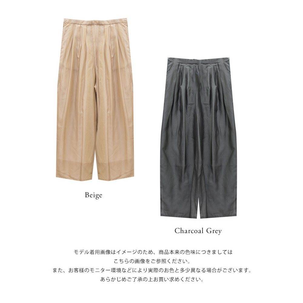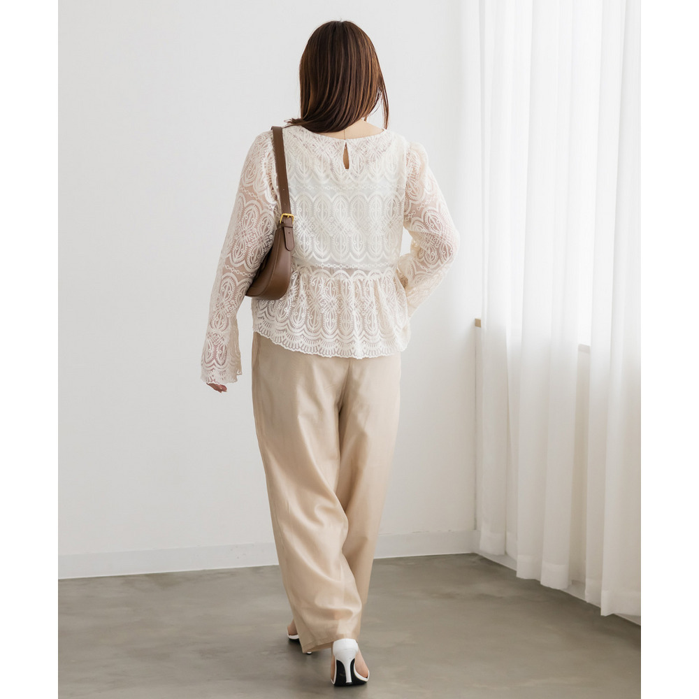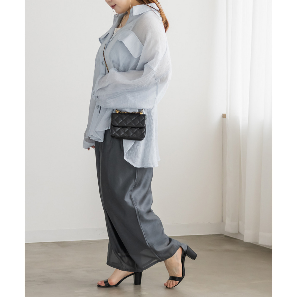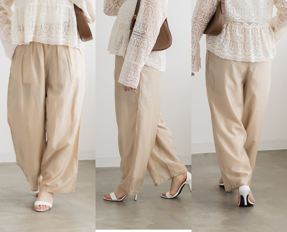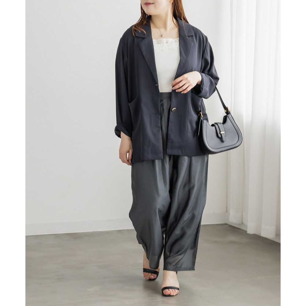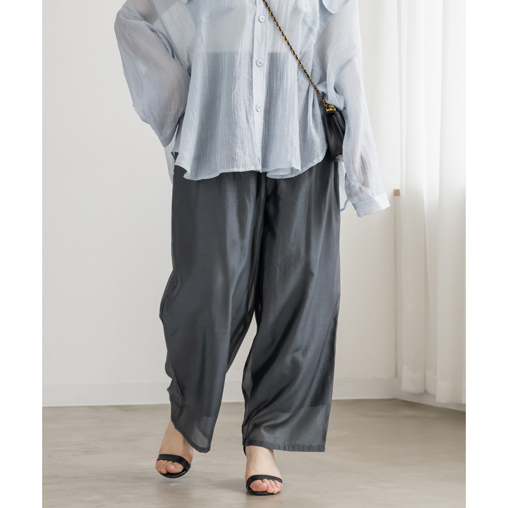 | 3Lサイズを着用しました。ウエストは程よくフィットし、全体的にちょうどいい着心地でした。ダブルタック入りでお腹まわりにゆとりがあり、体のラインを拾いにくいのが嬉しいポイント♪ カーブシルエットが自然に立体感を出してくれるので、シンプルなトップスと合わせるだけでもこなれた印象に仕上がります。ほんのり透け感のあるシアー素材で重たく見えにくく、ワイドながらも軽やかな雰囲気に◎ ブラウス合わせできれいめに、コンパクトなトップスと合わせてトレンド感のあるバランスを楽しむのもおすすめです。楽さとおしゃれ見えを両立できる一本だと思いました。 |
