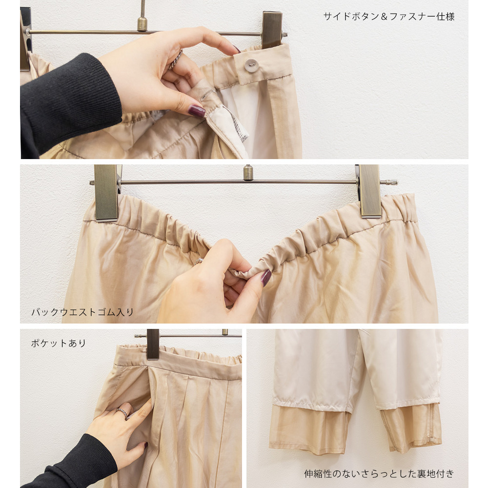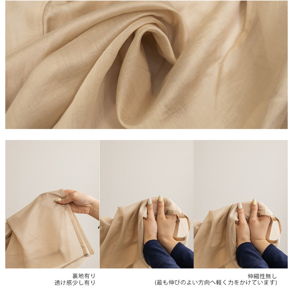 | 素材 | ■素材 【表地】リヨセル85%、ポリエステル15%、【裏地】ポリエステル100% ■裏地・透け感・伸縮性 裏地有り、透け感少し有り、伸縮性無し ■ポケット 有り ■生地感 さらっとした軽いシアー素材です。 ※伸縮性のないさらっとした裏地付き |