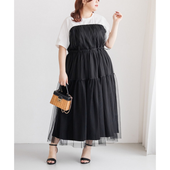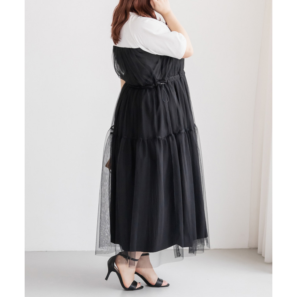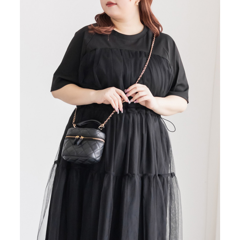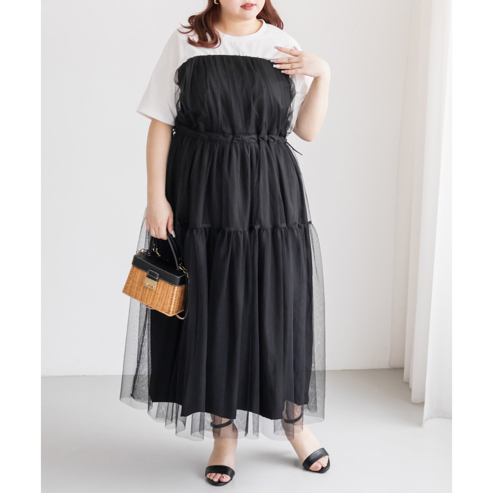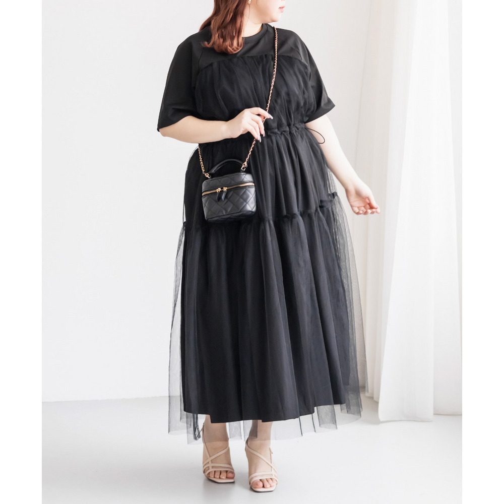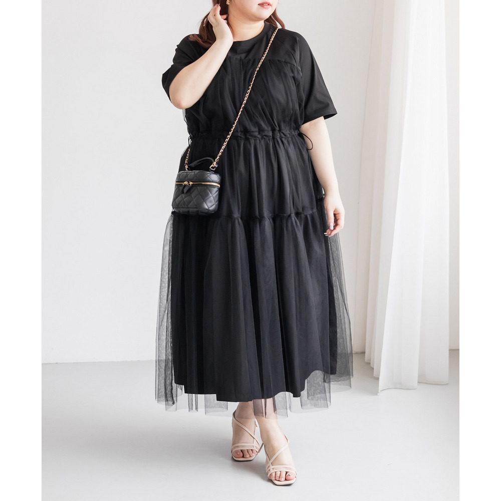 | 3Lサイズを着用しました。身頃は程よくゆとりがあり、全体的にちょうどいい着心地でした。ふんわりと重ねたチュールが軽やかで、動くたびにやわらかく揺れるシルエットがとても可愛いワンピースです♪レイヤードデザインなので1枚でコーデが完成して、華やかな印象に仕上がるのが嬉しいポイントでした。甘すぎないデザインなので大人っぽく着られて、特別なお出かけにもぴったり◎ジャケットやカーディガンを羽織れば季節に合わせて着回しも楽しめそうです。 |