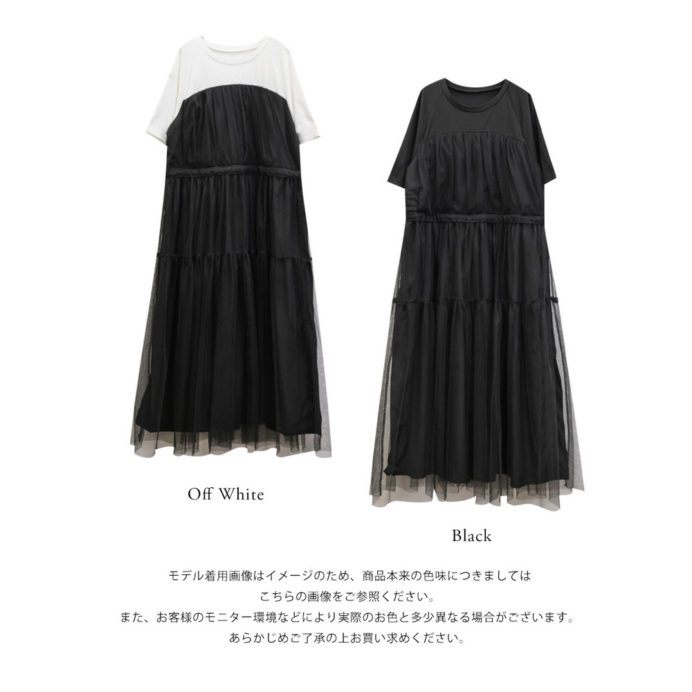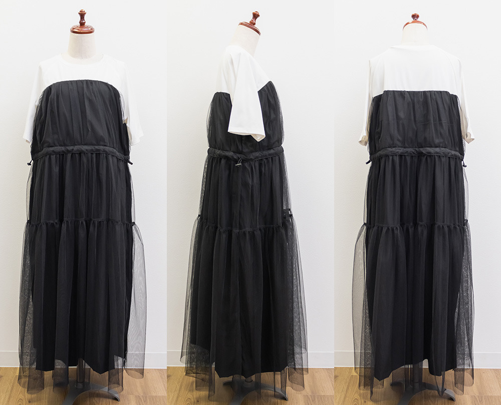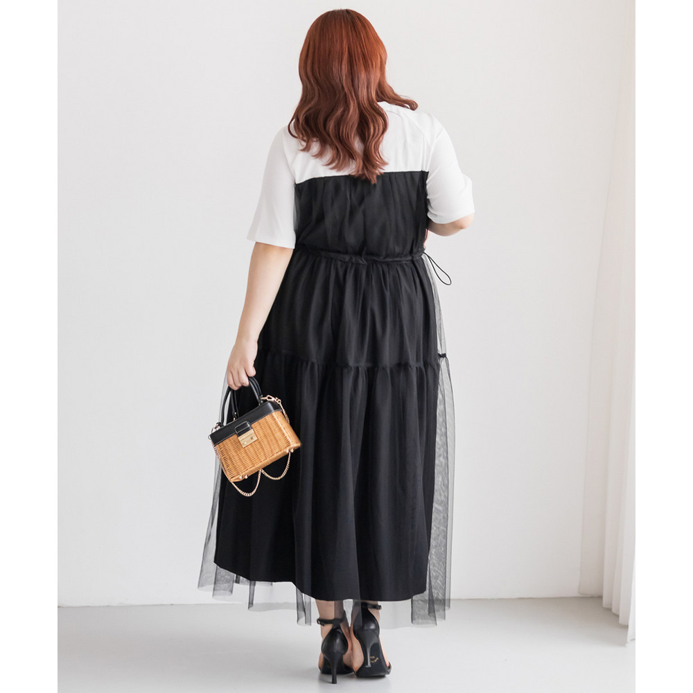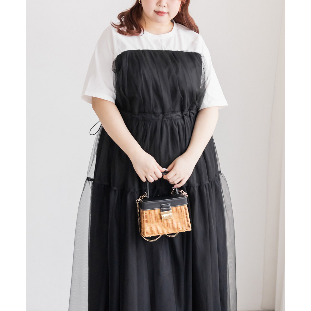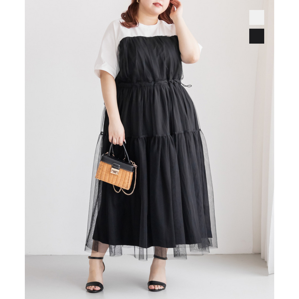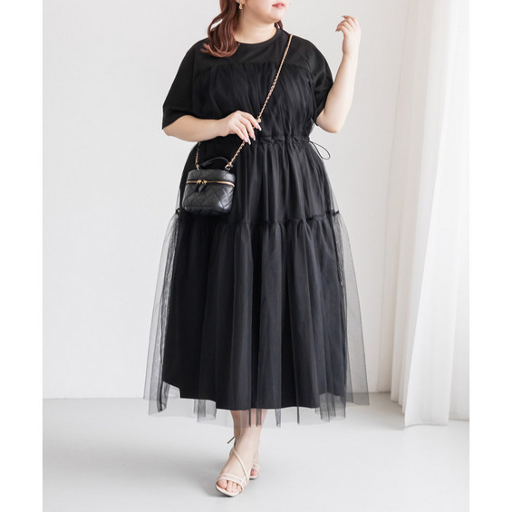 | 3Lサイズを着用しました。身頃は程よくゆとりがあり、全体的にちょうどいい着心地でした。ふんわりと重ねたチュールが軽やかで、動くたびにやわらかく揺れるシルエットがとても可愛いワンピースです♪レイヤードデザインなので1枚でコーデが完成して、華やかな印象に仕上がるのが嬉しいポイントでした。甘すぎないデザインなので大人っぽく着られて、特別なお出かけにもぴったり◎ジャケットやカーディガンを羽織れば季節に合わせて着回しも楽しめそうです。 |