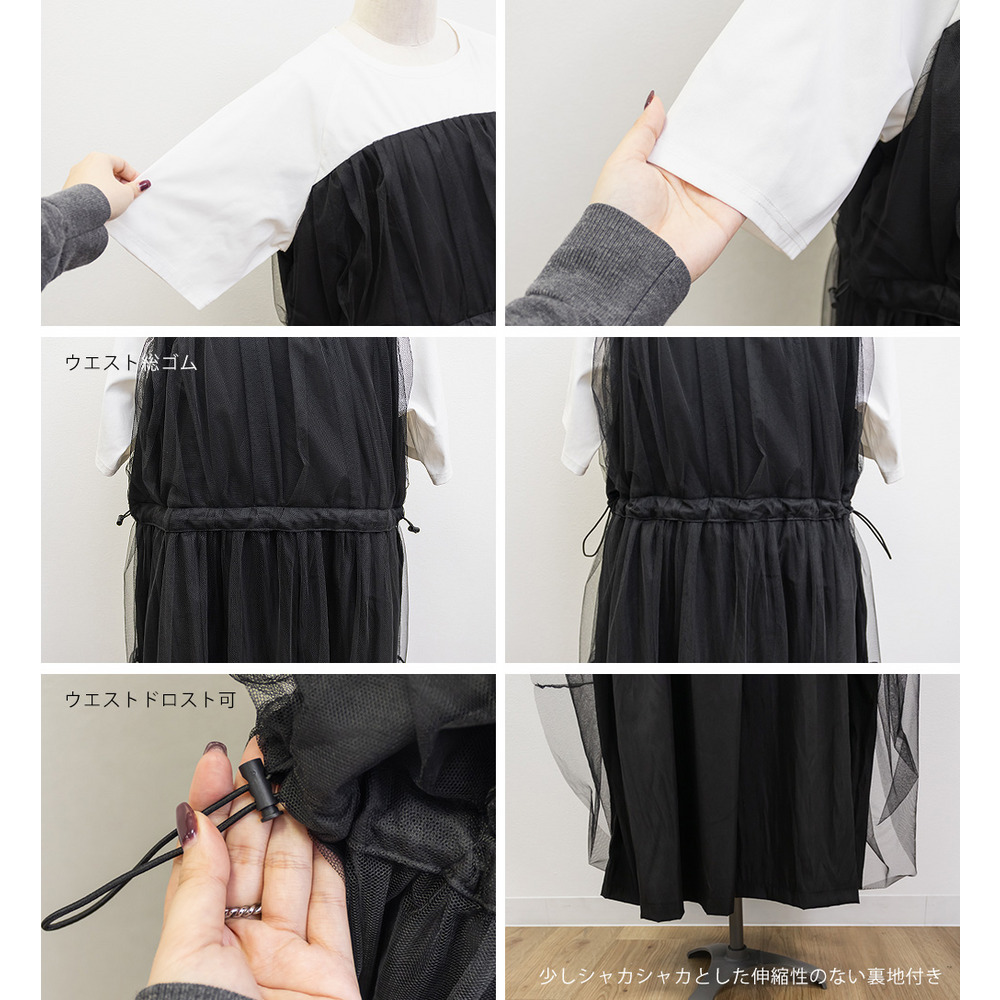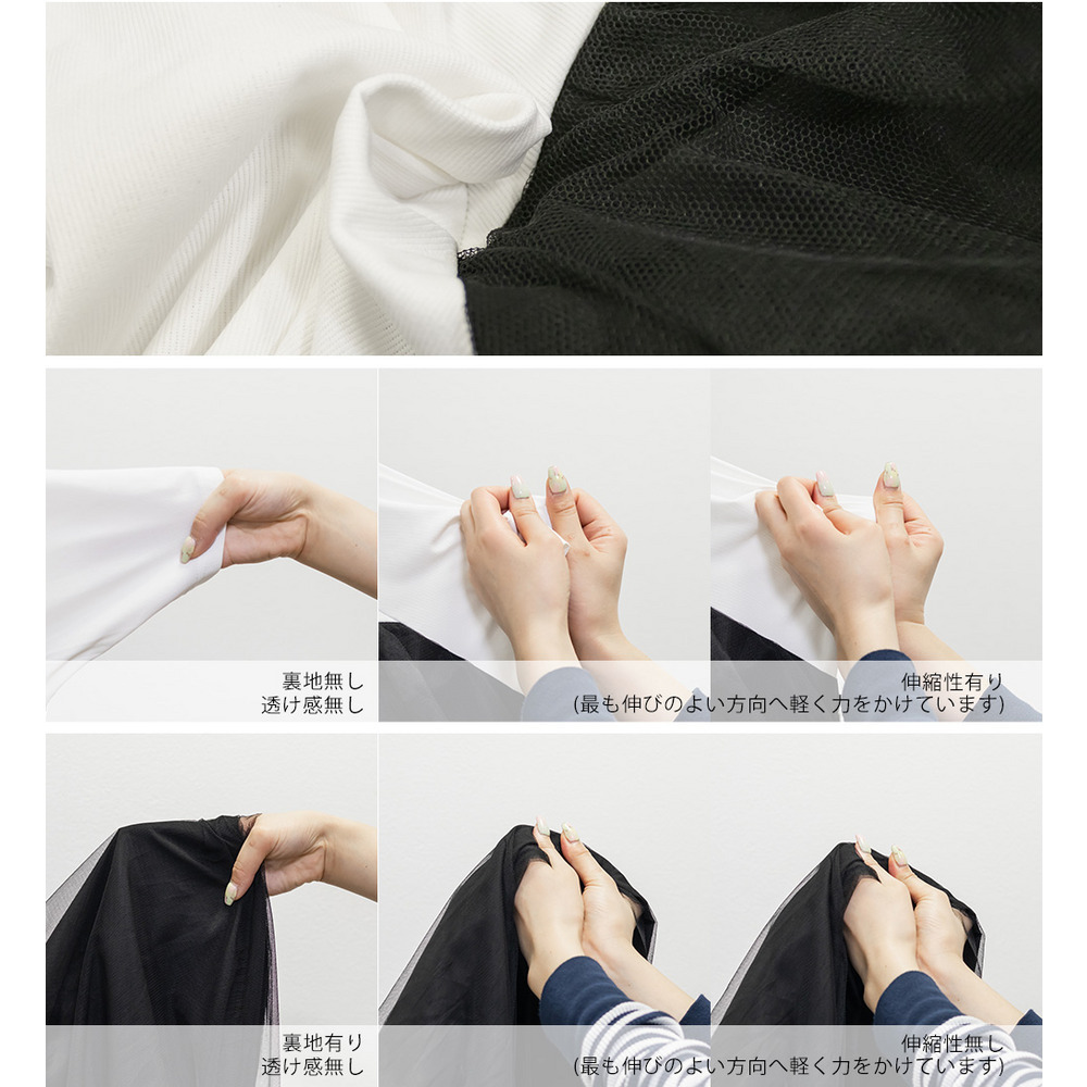 | 素材 | ■素材 【本体】ポリエステル100%、【裏地】ポリエステル70%、ナイロン30%、【チュール】ポリエステル100% ■裏地・透け感・伸縮性 裏地有り、透け感わずかに有り、伸縮性有り ■ポケット 無し ■生地感 程よく厚手のしっかりとしたカットソー素材です。 ※裏地はハリ感のあるさらっとした素材です。 |