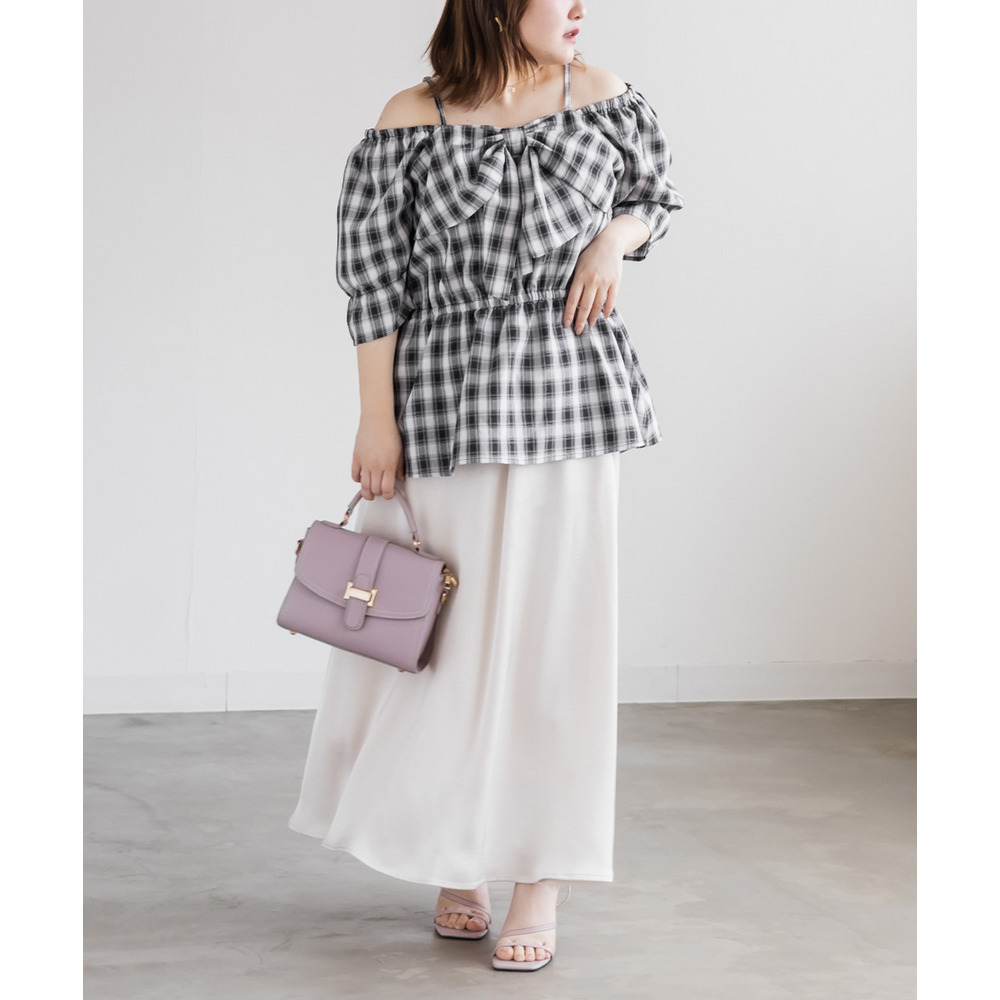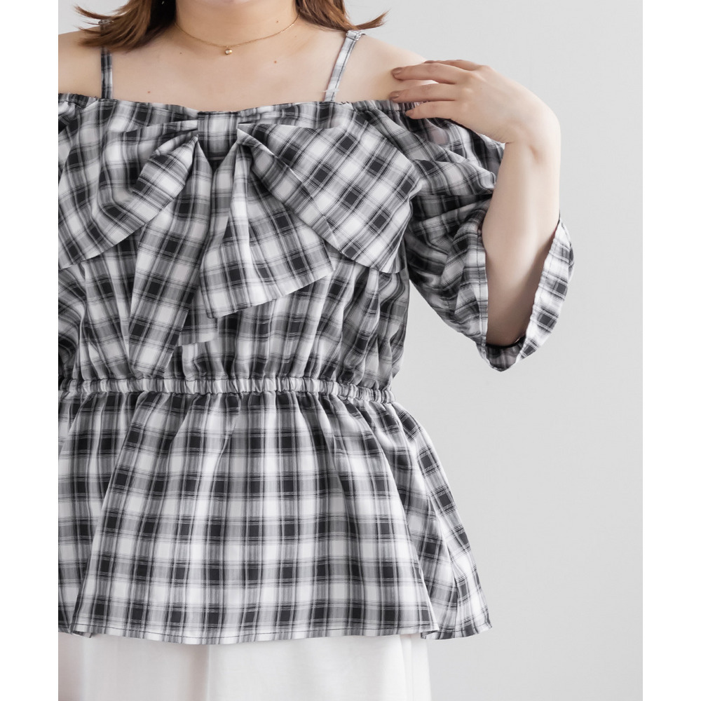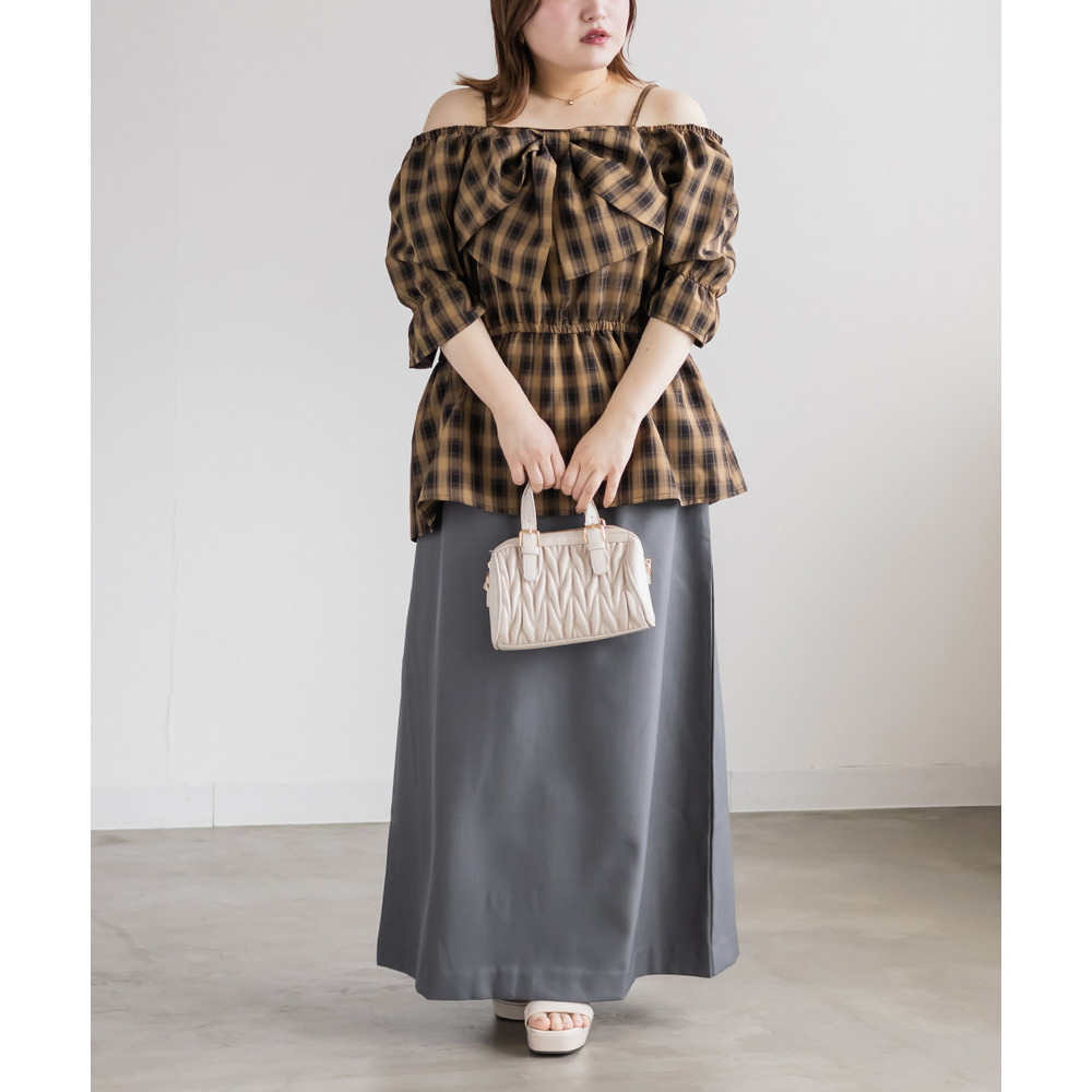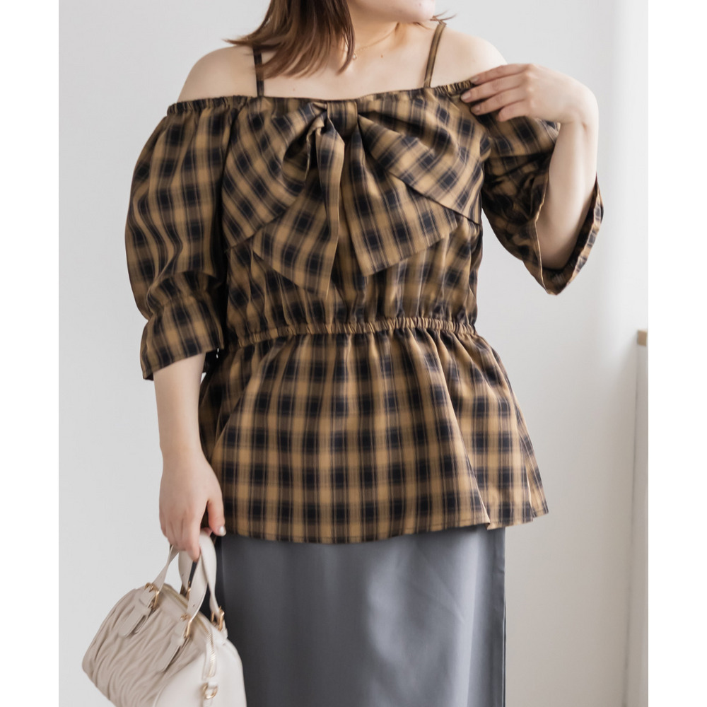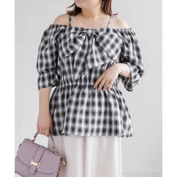 3Lを着てちょうどいい着心地でした。肩紐がついていてオフショルでもずり落ちる心配はないです◎チェック柄と大きめのリボンが可愛くて、トレンド感もたっぷりなデザインです!オフショルなのでデコルテや顔回りがすっきりした印象なって、着やせも抜群です。ウエストからふわっと広がるペプラムデザインになっていて、お腹周りもしっかりカバーしてくれます♪
