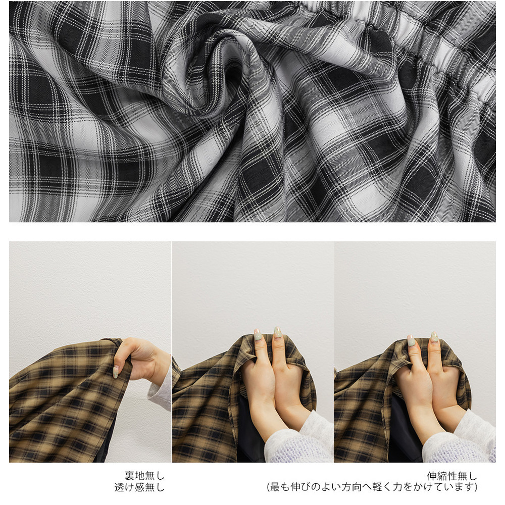 素材 ■素材 【表地】ポリエステル100%、【裏地】ポリエステル100% ■裏地・透け感・伸縮性 裏地有り、透け感無し、伸縮性無し ■ポケット 無し ■生地感 さらっとしたシャツ素材です。 ※ウエスト切替より下のみ伸縮性のないさらっとした裏地付き