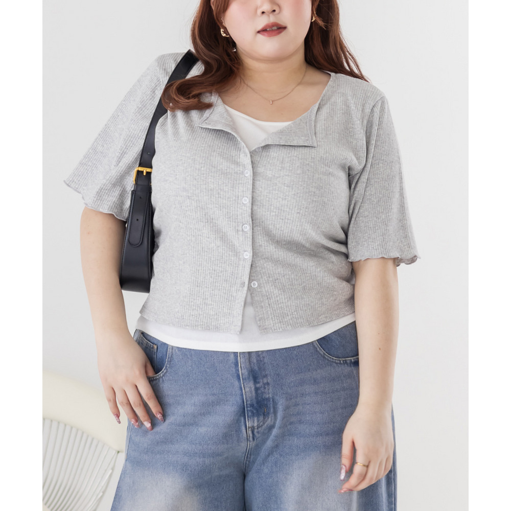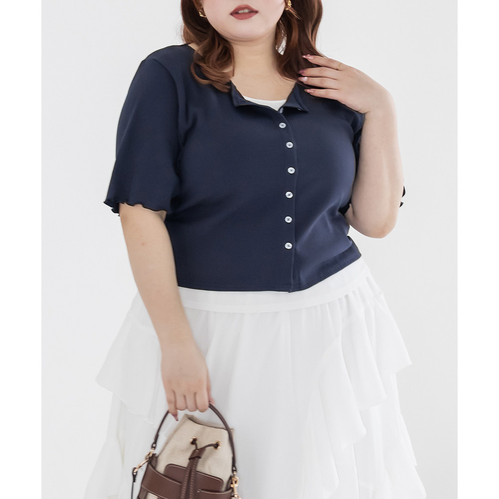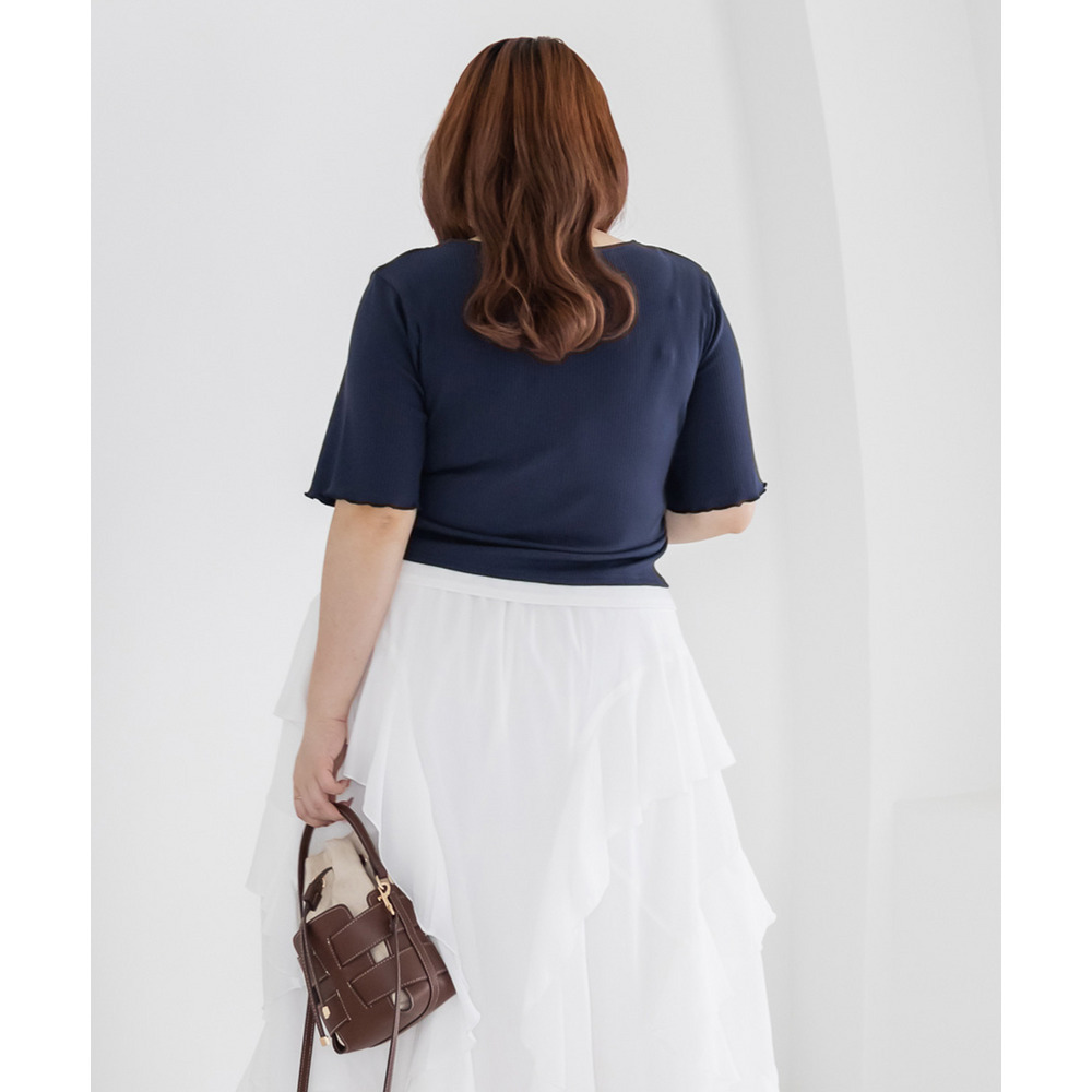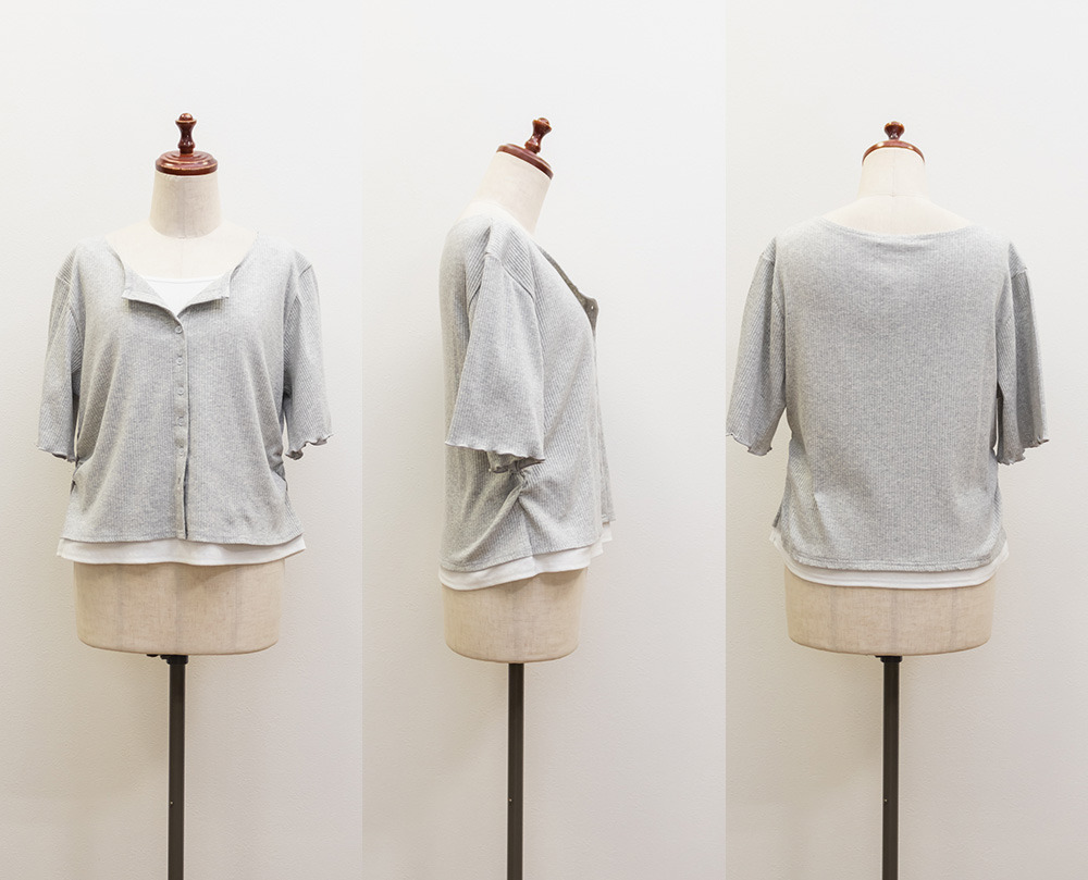 | 3Lサイズを着用してちょうどいいサイズ感でした!レイヤード風のデザインで1枚でしっかりコーデが決まるのが嬉しいです◎リブ素材で程よくフィットしつつも窮屈感はなく、着心地もとても楽でした♪すっきり見えするシルエットで、インでもアウトでもバランスよく着られるのがポイントです! |