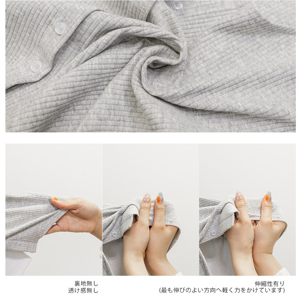 | 素材 | ■素材 【本体】綿93%、ポリウレタン7%、【別布】ポリエステル65%、綿30%、ポリウレタン5% ■裏地・透け感・伸縮性 裏地無し、透け感無し、伸縮性有り ■ポケット 無し ■生地感 中側生地:細かめの程よくしっかりとした伸縮性のあるリブカットソー 外側(本体生地):程よくしっかりとした中側生地より太めピッチの伸縮性のあるリブカットソー |