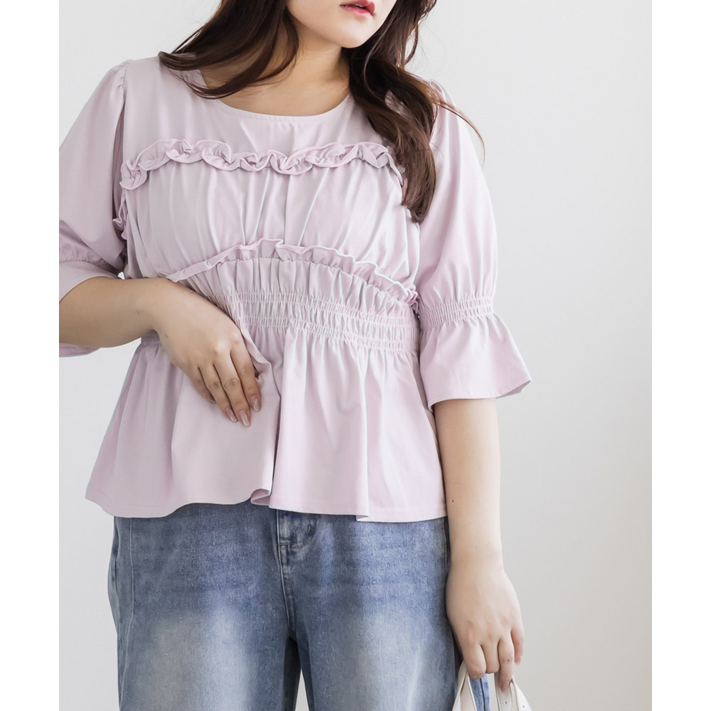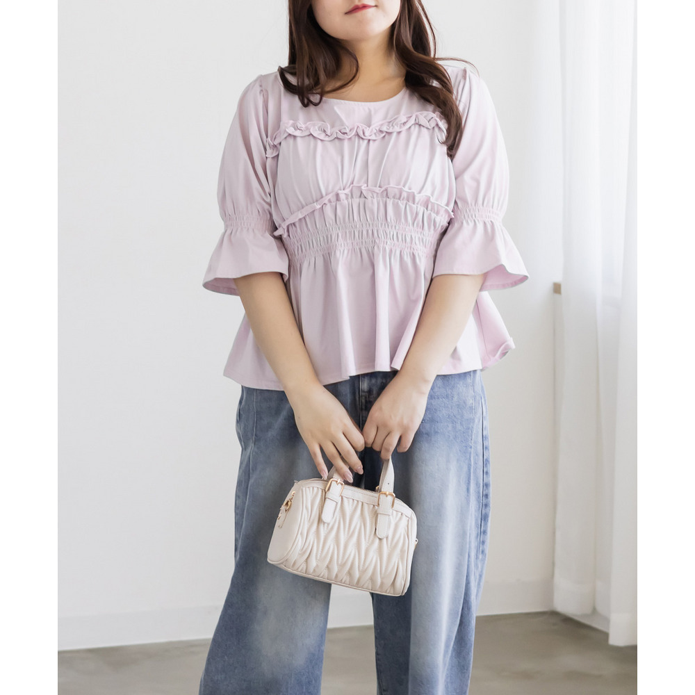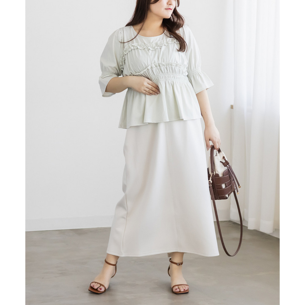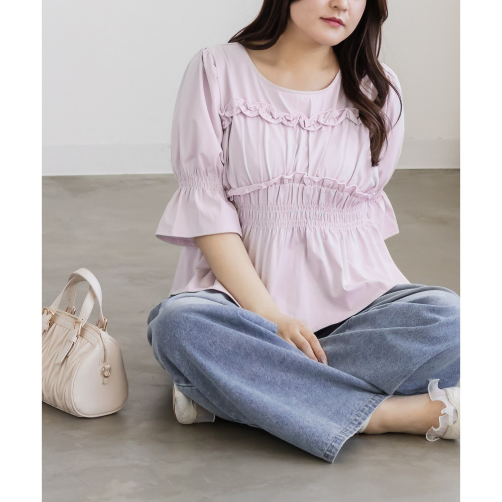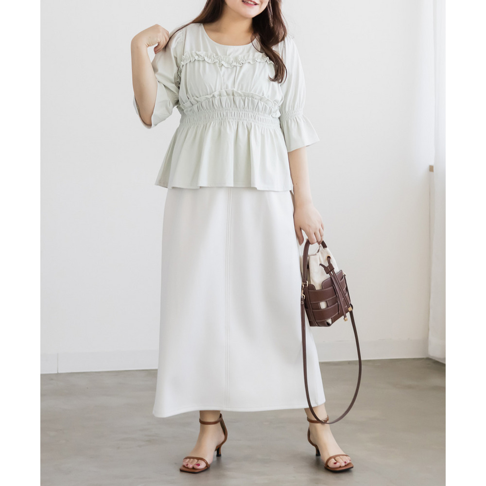 | LLサイズを着用しましたが、窮屈感なくジャストで着られました。生地自体伸びるカットソー素材なので動きやすいです。袖や見頃はゴムが入っていて、ぴったりで着用してもボディラインを拾いづらくメリハリある印象になります。らくちんなのでTシャツ感覚で着られます!甘すぎない印象で大人っぽいスタイリングになります。さらっと着るだけで主役級の華やかさがあるので、お出かけやデートにもおすすめです! |