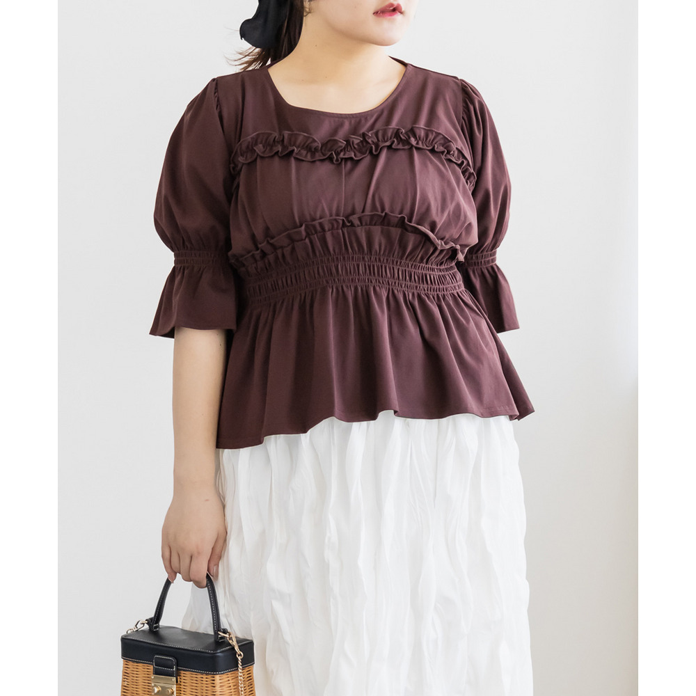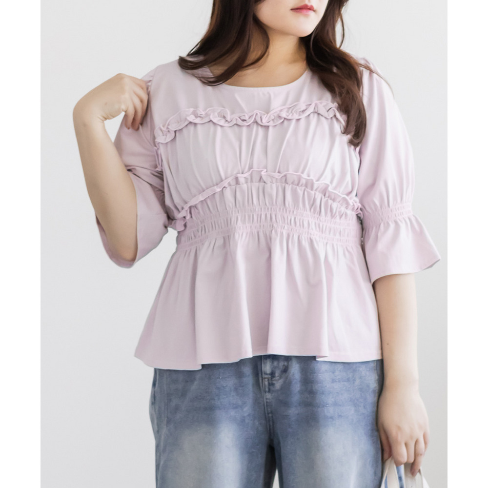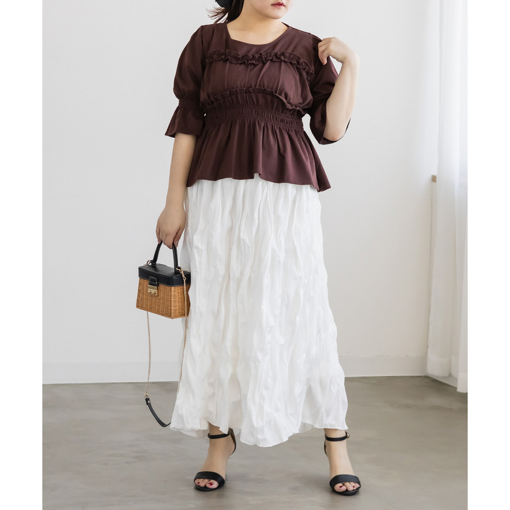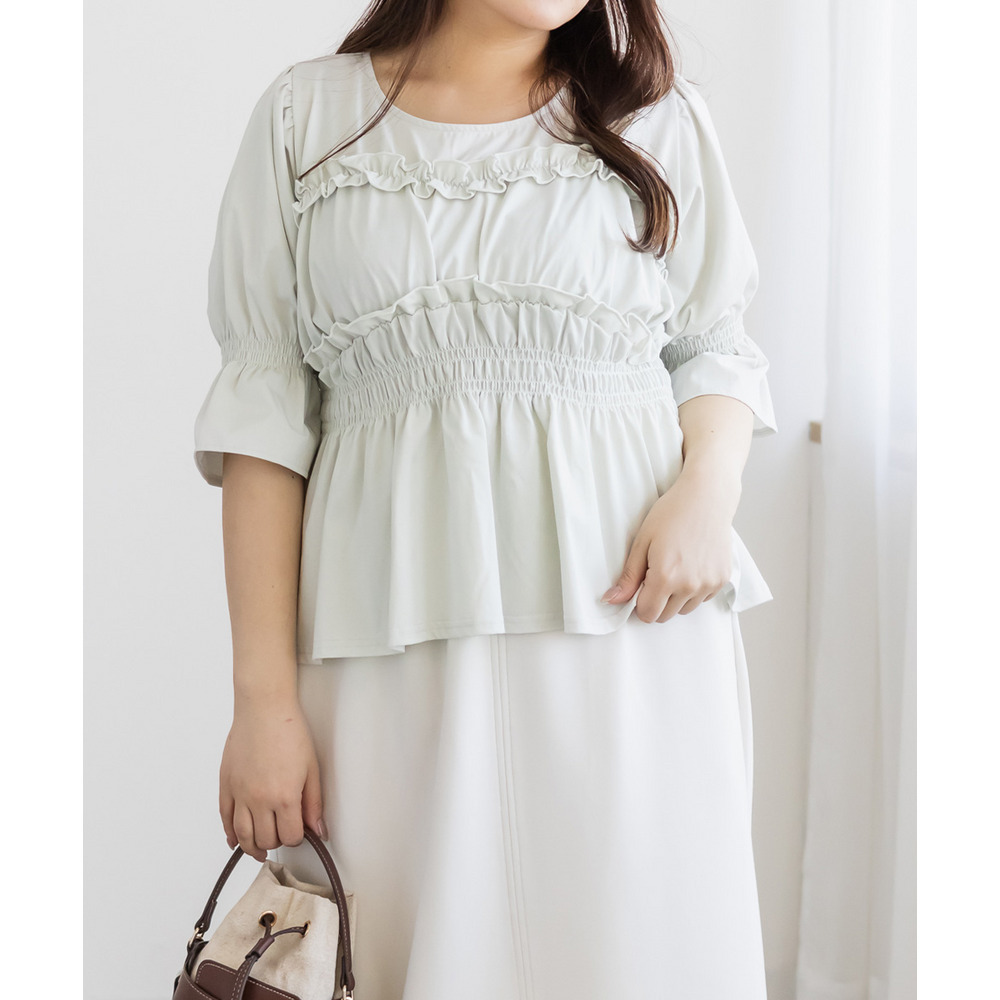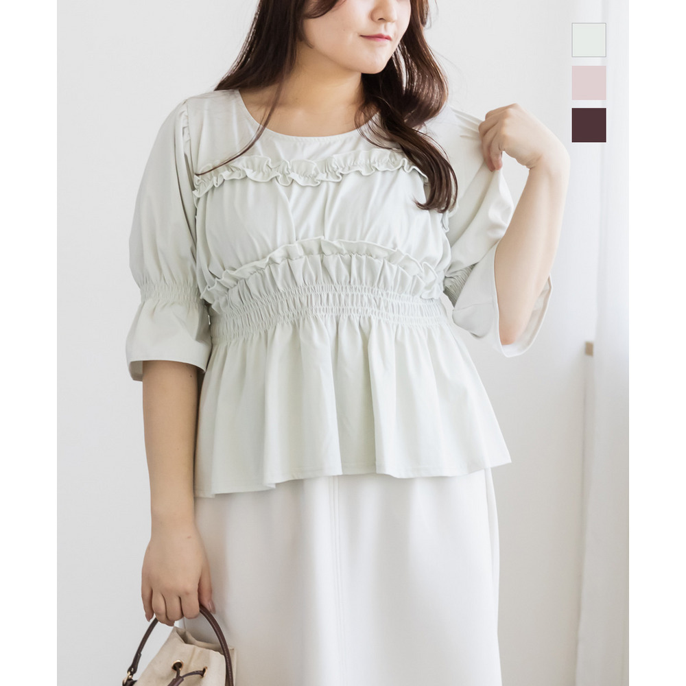 | LLサイズを着用しましたが、窮屈感なくジャストで着られました。生地自体伸びるカットソー素材なので動きやすいです。袖や見頃はゴムが入っていて、ぴったりで着用してもボディラインを拾いづらくメリハリある印象になります。らくちんなのでTシャツ感覚で着られます!甘すぎない印象で大人っぽいスタイリングになります。さらっと着るだけで主役級の華やかさがあるので、お出かけやデートにもおすすめです! |