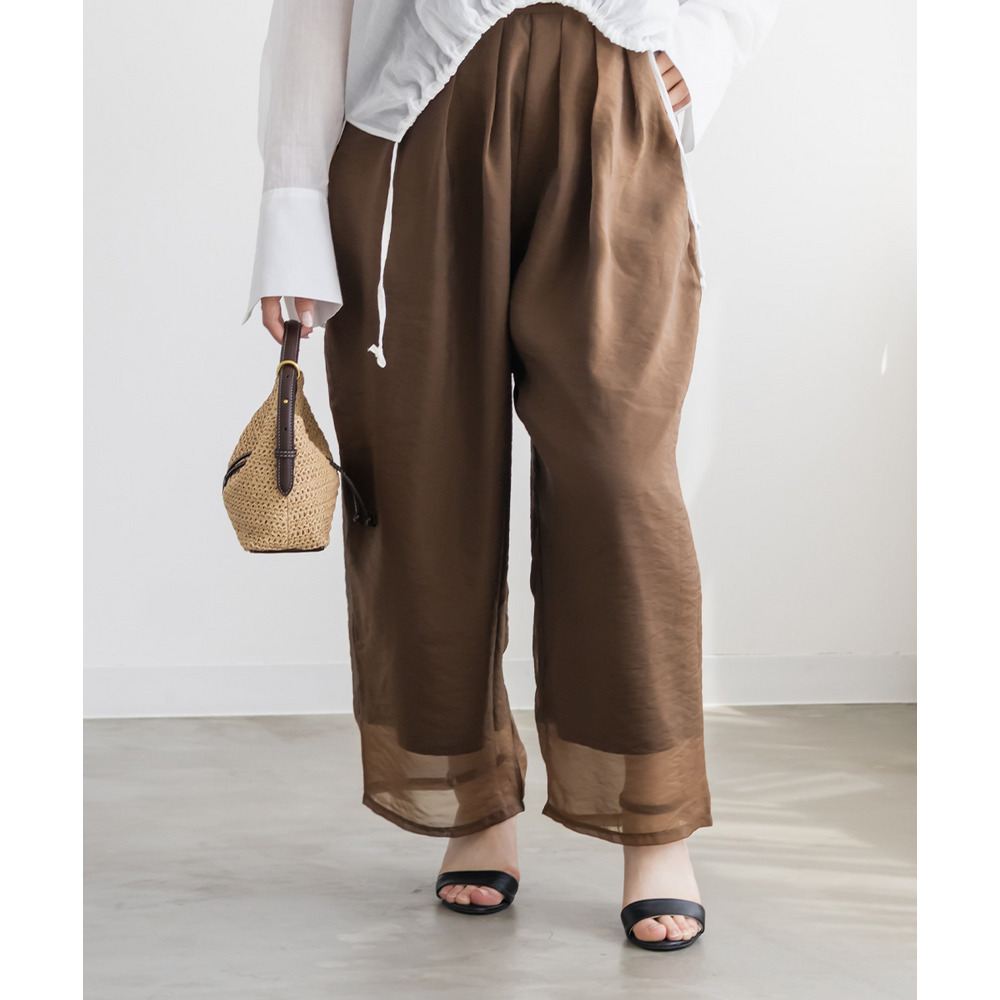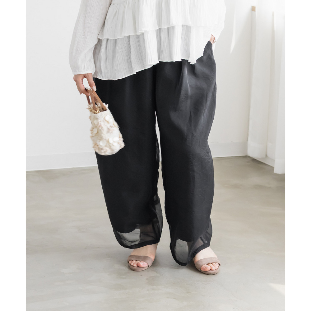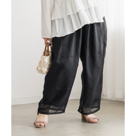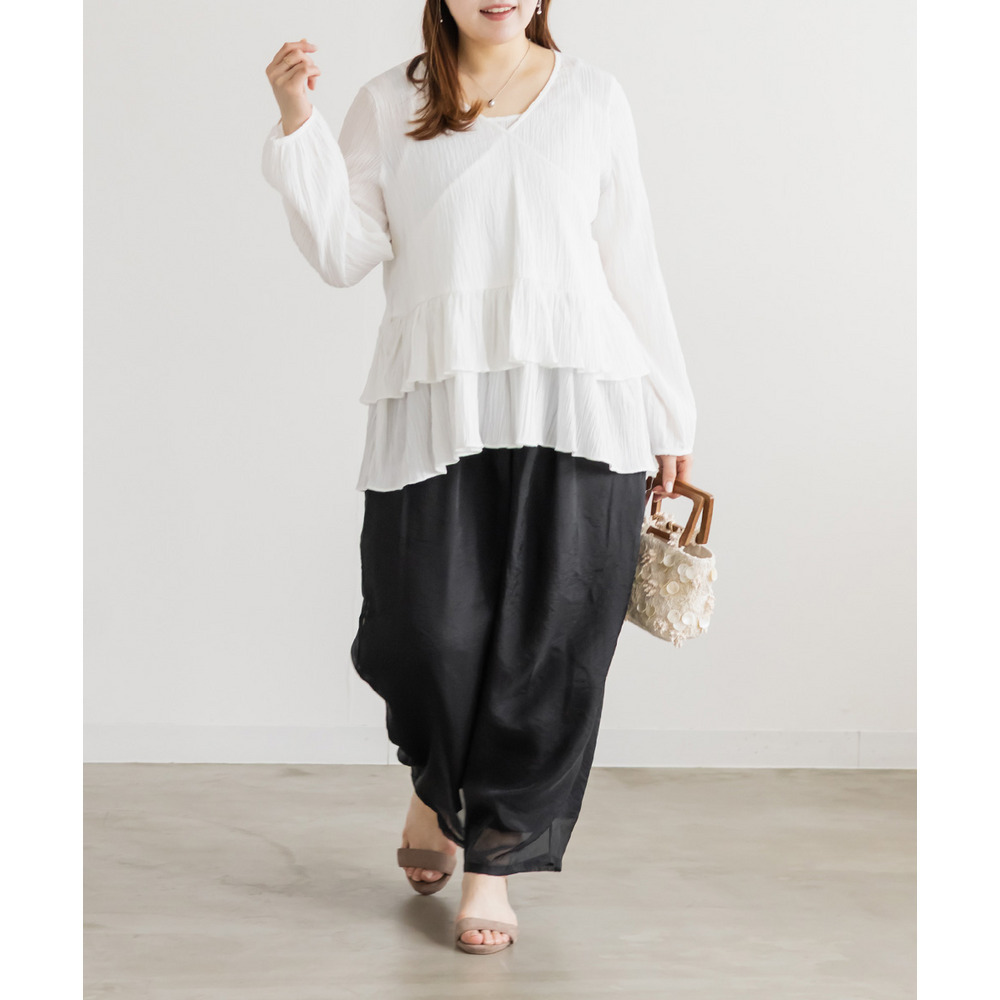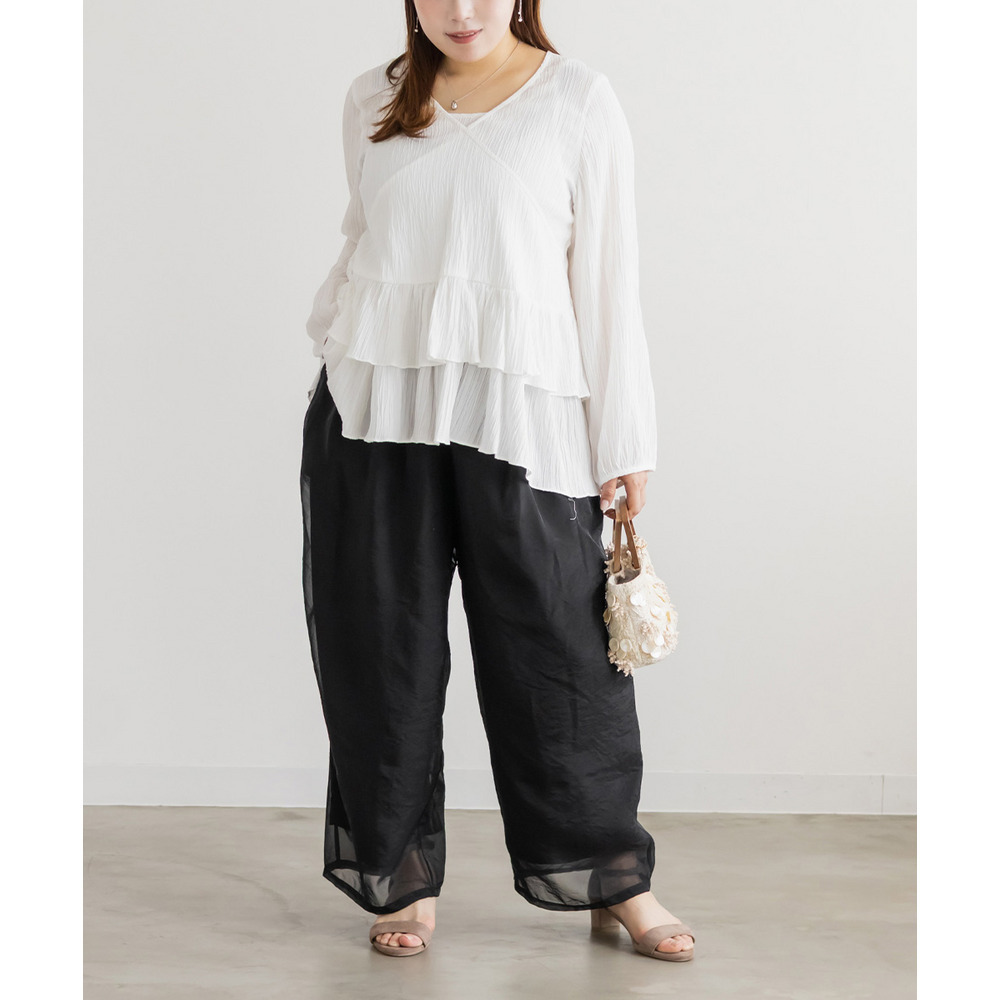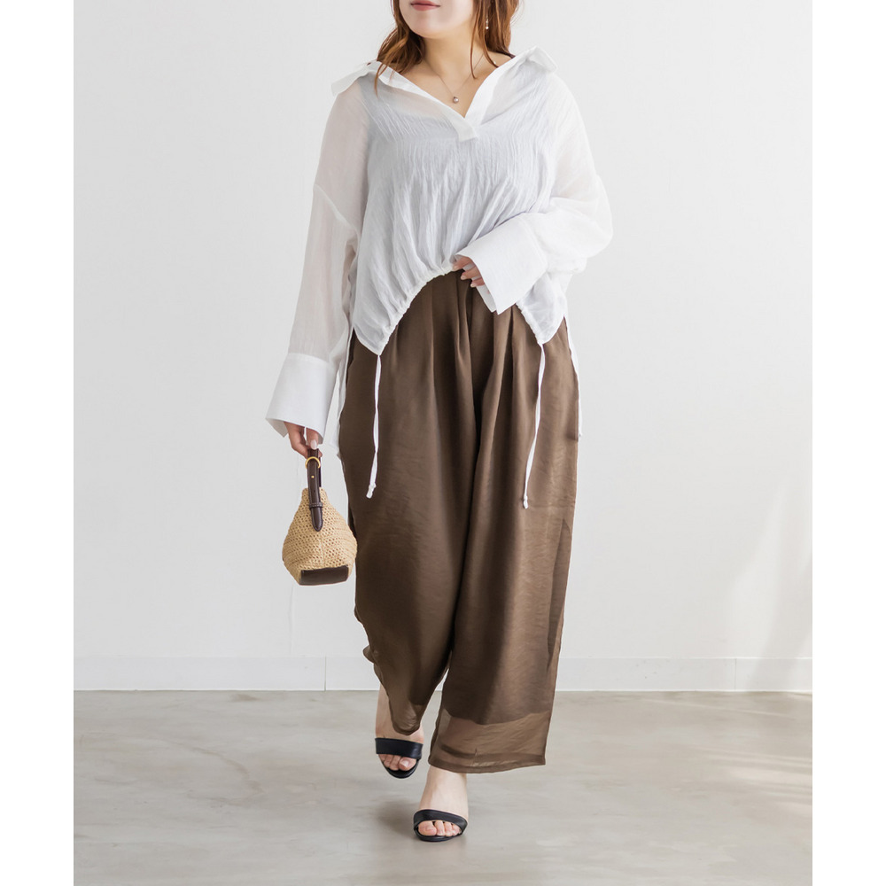 | 3Lサイズを着用しました。ウエストは程よくフィットし、全体的にちょうどいい着心地でした。タック入りでお腹まわりにゆとりがあり、体のラインを拾いにくいのが嬉しいポイント♪ さらっとしたシアー生地が重なっていて自然に立体感を出してくれるので、シンプルなトップスと合わせるだけでもこなれた印象に仕上がります。 軽くて着心地抜群で、ワイドながらも軽やかな雰囲気に◎ ブラウス合わせできれいめに、コンパクトなトップスと合わせてトレンド感のあるバランスを楽しむのもおすすめです。楽さとおしゃれ見えを両立できる一本だと思いました。 |