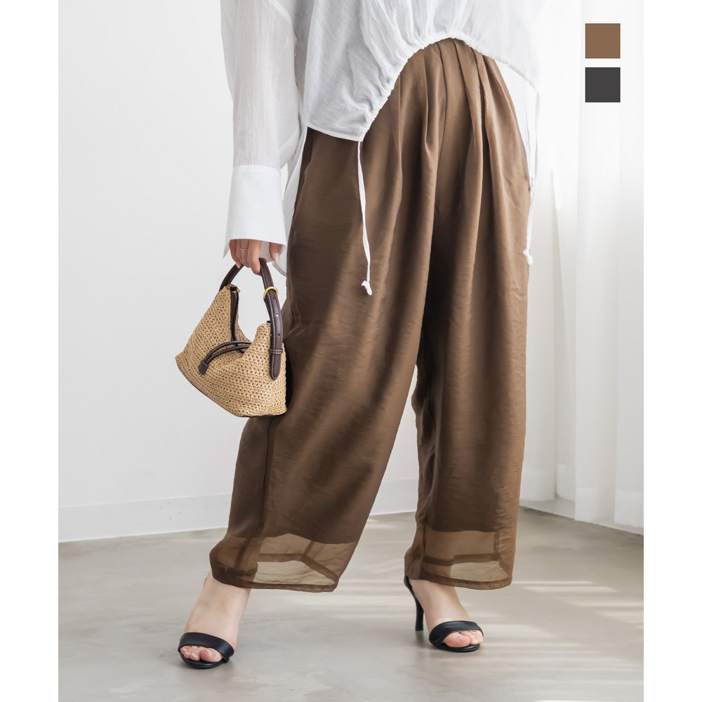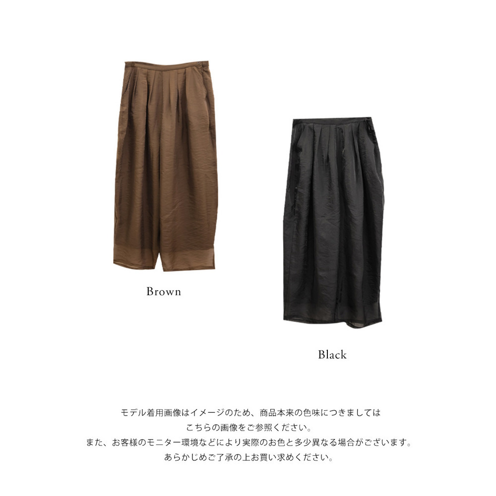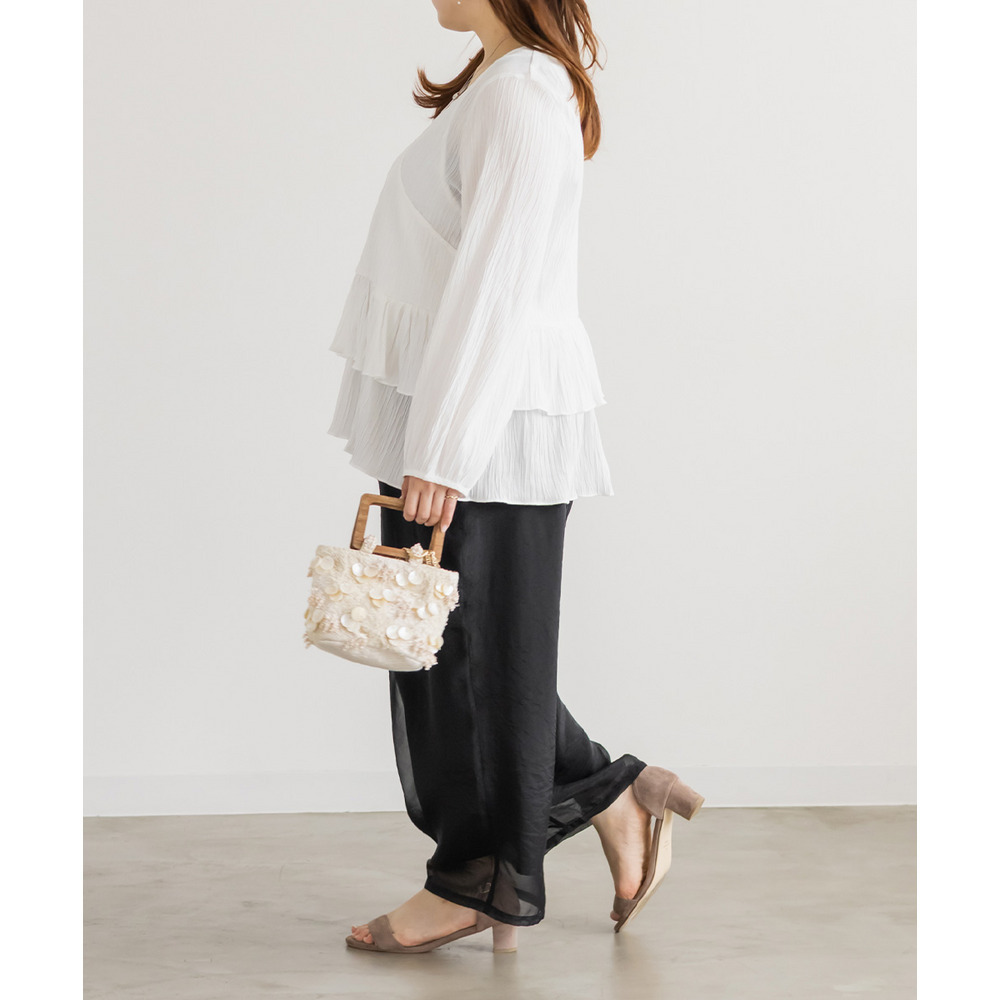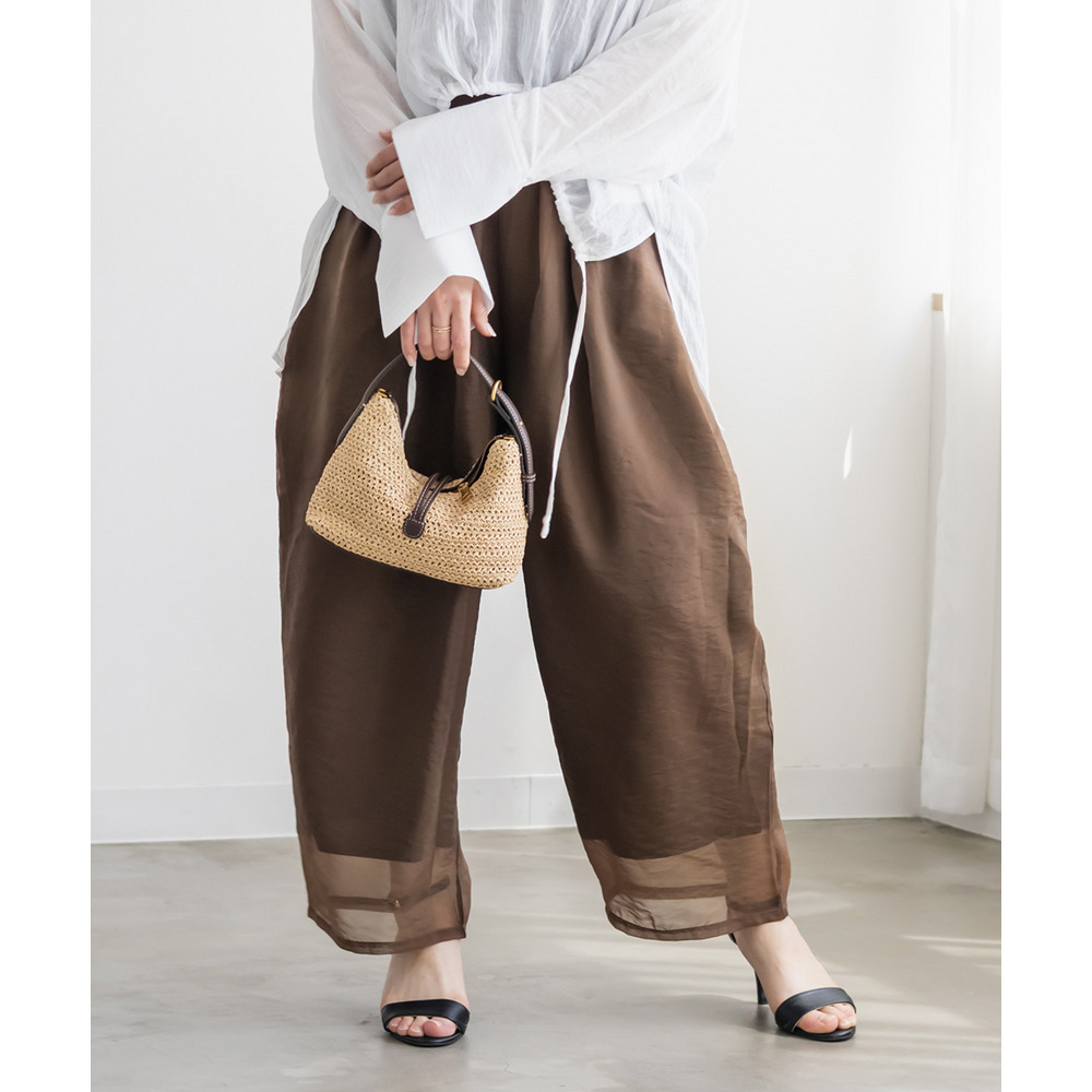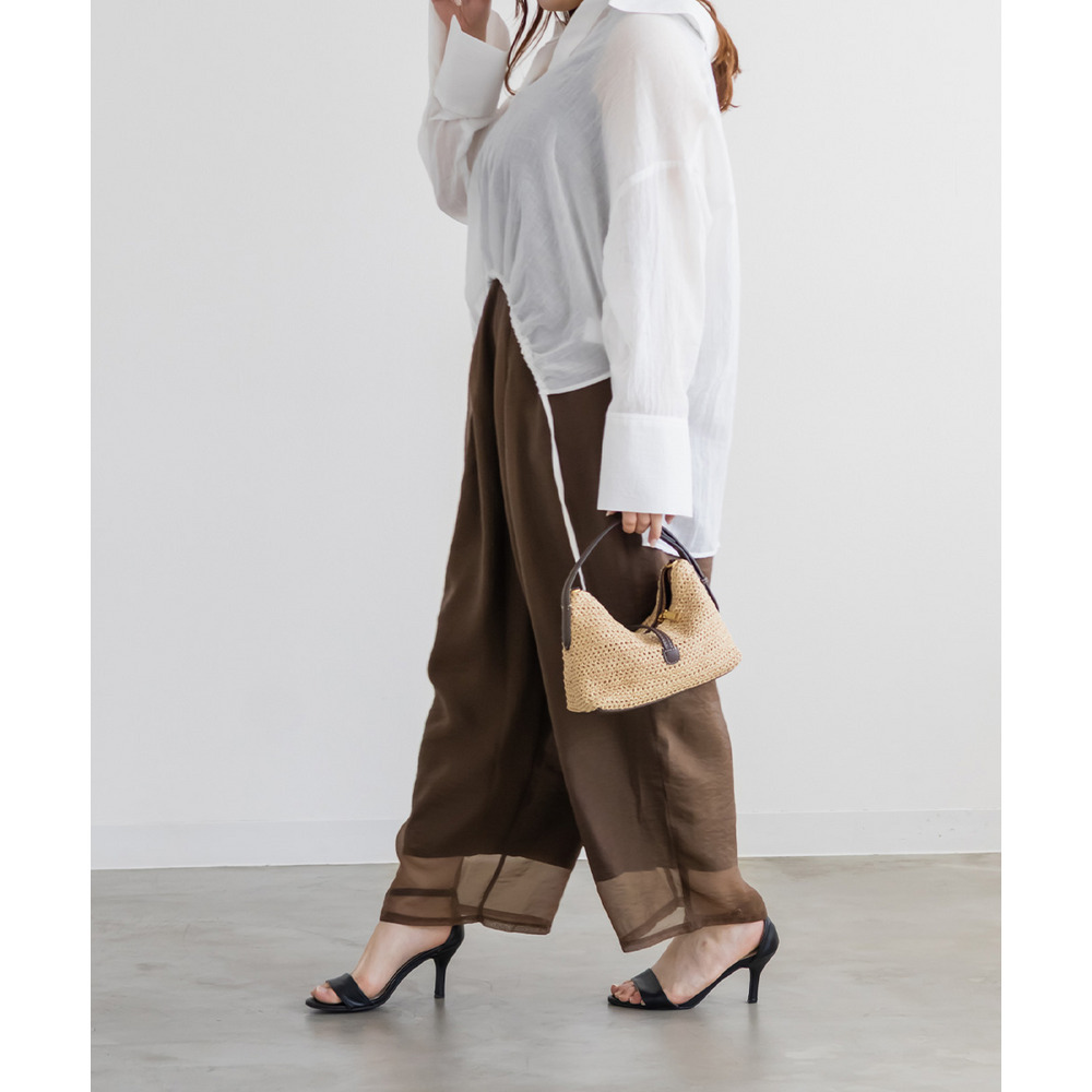 | 3Lサイズを着用しました。ウエストは程よくフィットし、全体的にちょうどいい着心地でした。タック入りでお腹まわりにゆとりがあり、体のラインを拾いにくいのが嬉しいポイント♪ さらっとしたシアー生地が重なっていて自然に立体感を出してくれるので、シンプルなトップスと合わせるだけでもこなれた印象に仕上がります。 軽くて着心地抜群で、ワイドながらも軽やかな雰囲気に◎ ブラウス合わせできれいめに、コンパクトなトップスと合わせてトレンド感のあるバランスを楽しむのもおすすめです。楽さとおしゃれ見えを両立できる一本だと思いました。 |