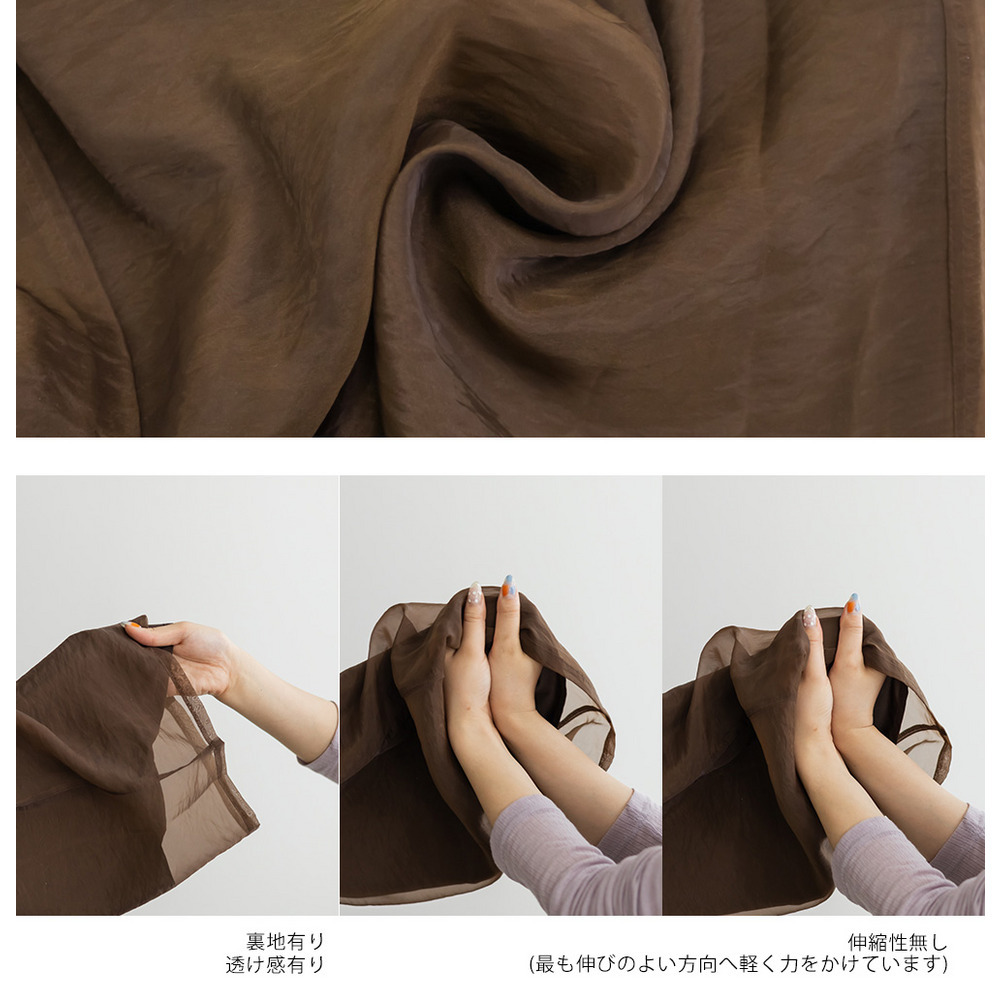 | 素材 | ■素材 【表地】ナイロン52%、ポリエステル48%、【裏地】ポリエステル100% ■裏地・透け感・伸縮性 裏地有り、透け感有り、伸縮性無し ■ポケット 有り ■生地感 ややシャリ感のあるさらっとしたシアー素材です。 ※伸縮性のないさらっとした裏地付き。 |