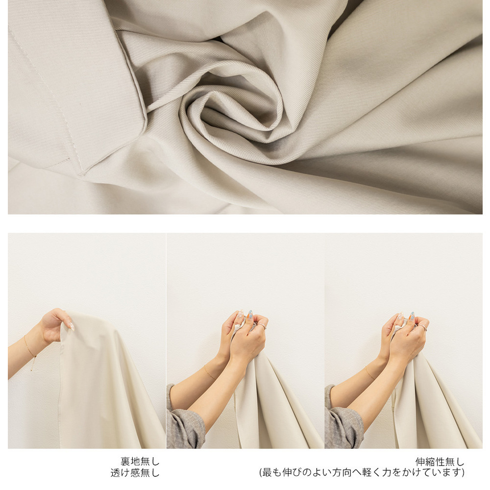 | 素材 | ■素材 ポリエステル95%、ポリウレタン5% ■裏地・透け感・伸縮性 裏地無し、透け感無し、伸縮性無し ■ポケット 無し ■生地感 程よくしっかり、さらりとした素材です。 |